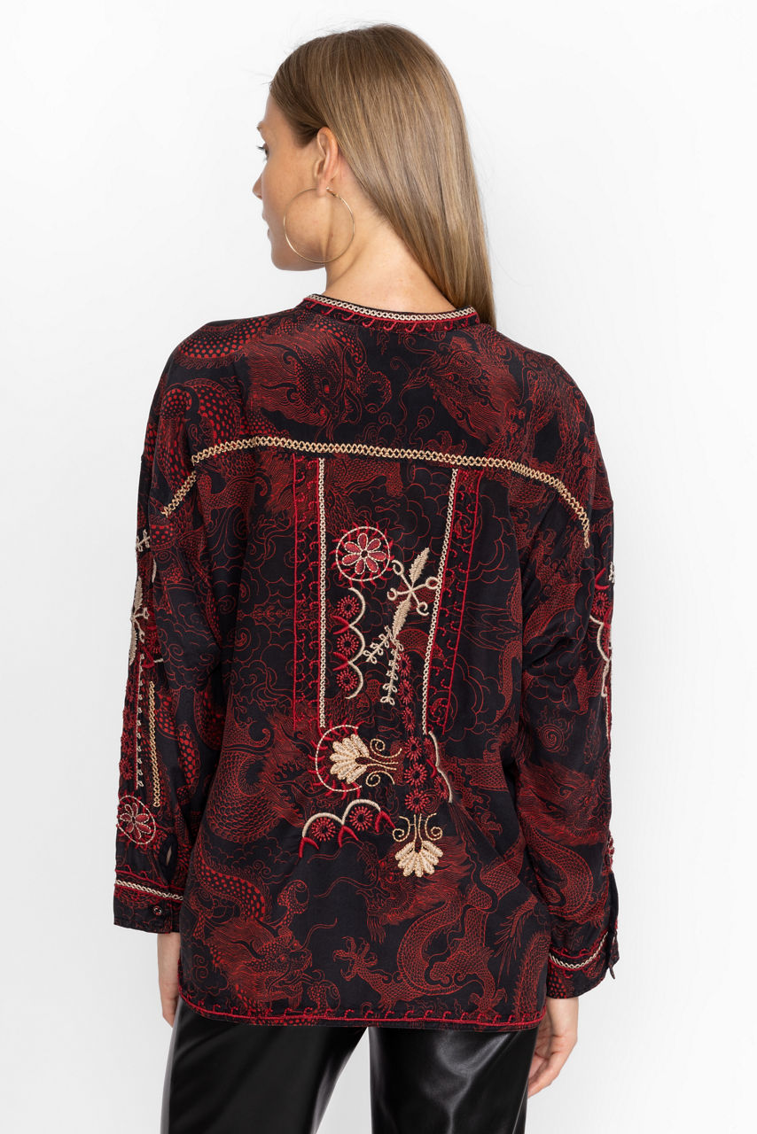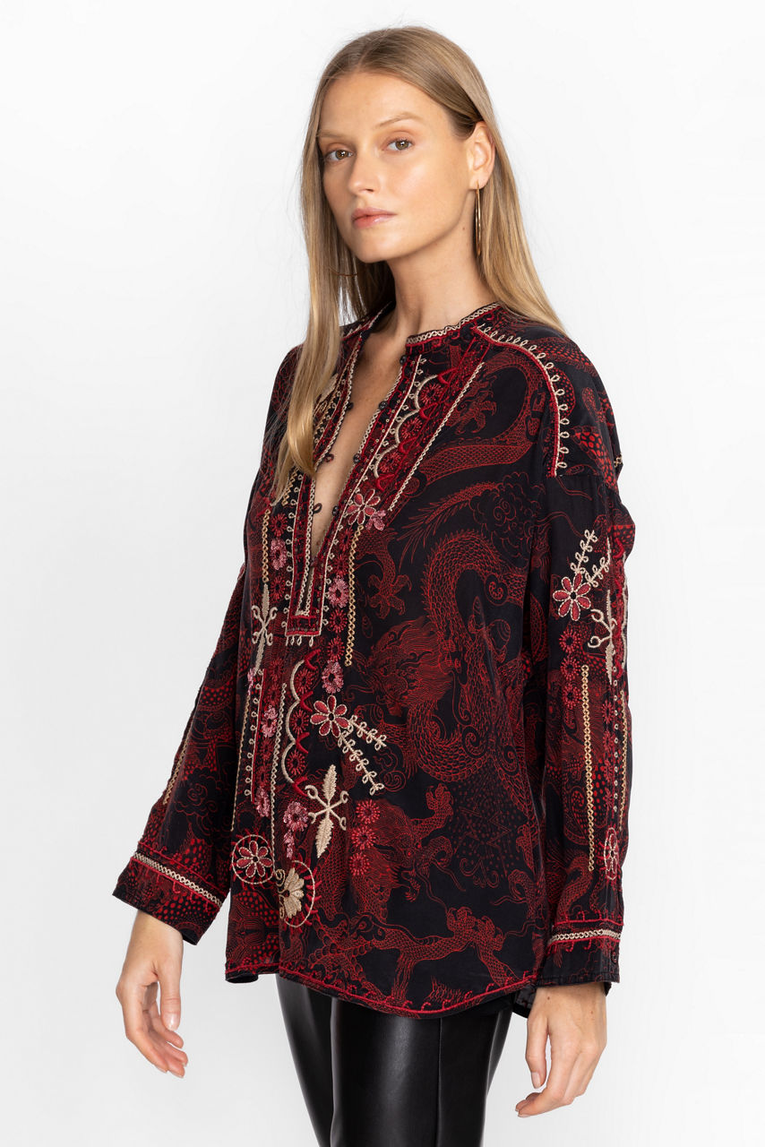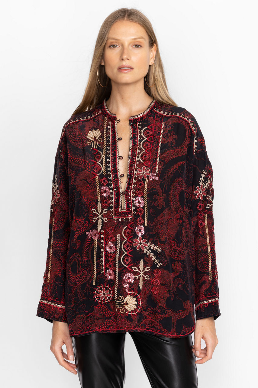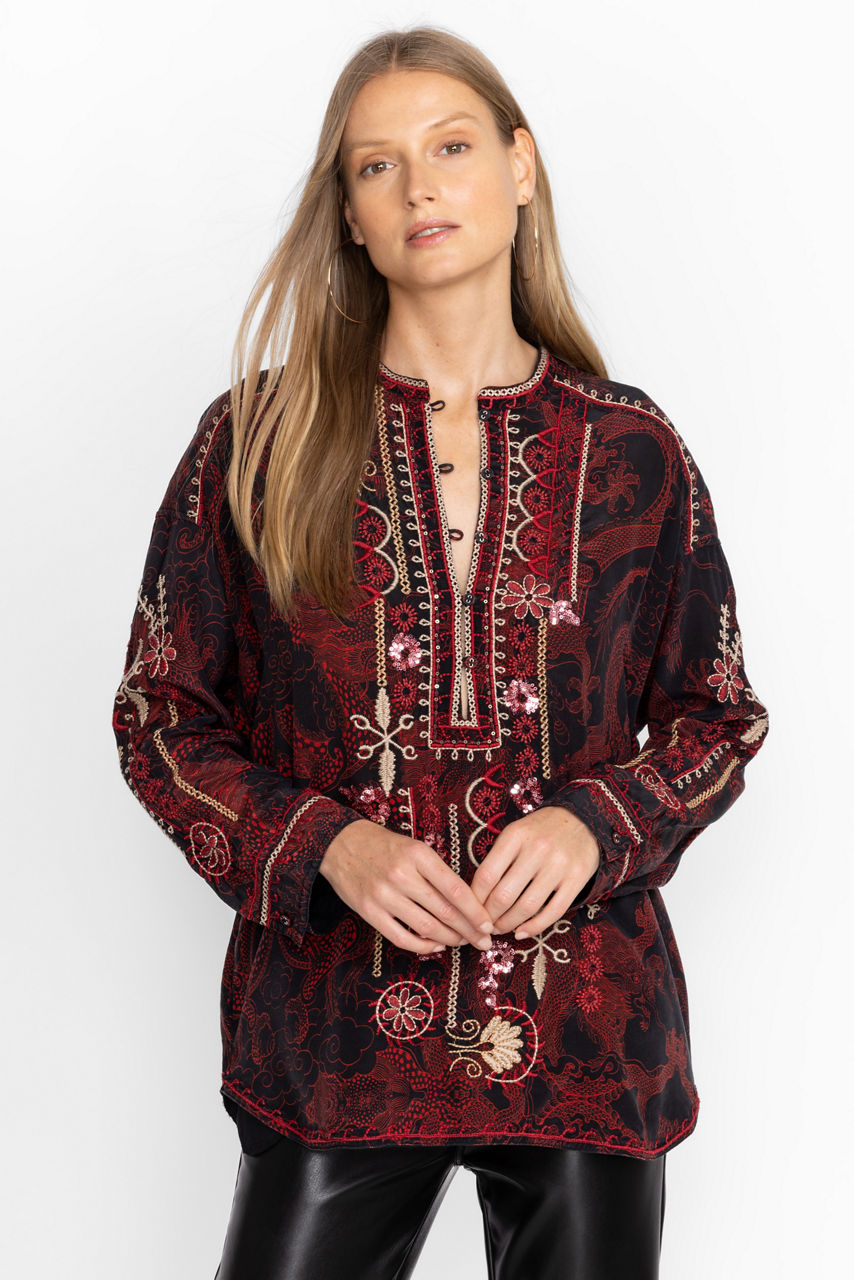 Ornately detailed to create an elevated style, the Belina Tunic Top offers an opulent addition to any wardrobe. Crafted from 100% silk and adorned with carefully placed embroidered images, this beautiful tunic features a fabric covered button-front and cuffs. Pair with flowing trousers and mule flats for a polished timeless look.