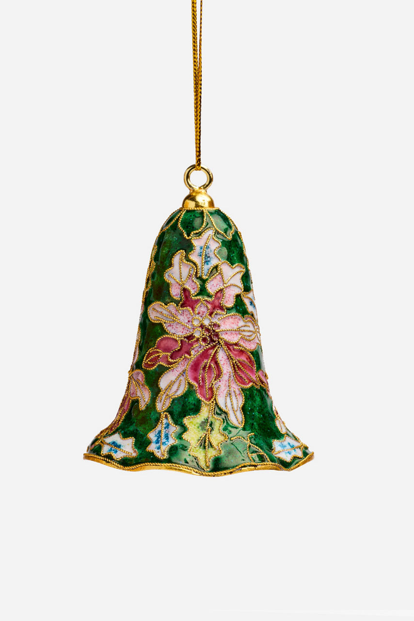 Intricately designed with colorful tile detailing housed in a glittering gold-tone frame, the Cloisonne Bell Ornament adds a touch of elegance to your holiday decor. Featuring stunning floral details on a deep green backdrop suspended from a gold-tone cord, this ornament is a perfect conversation piece. Add to your holiday tree or hang near a window to reflect the daytime sun.