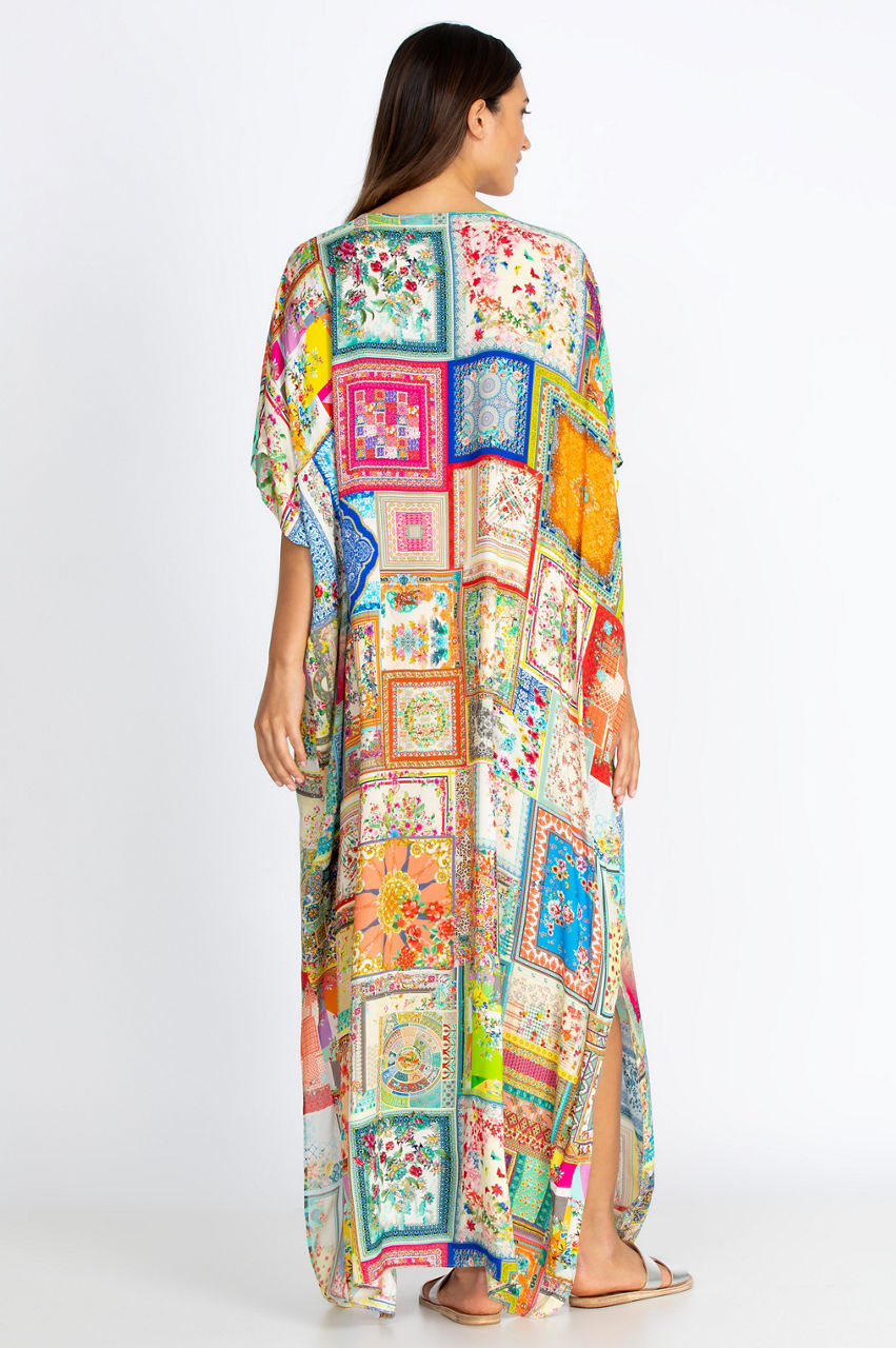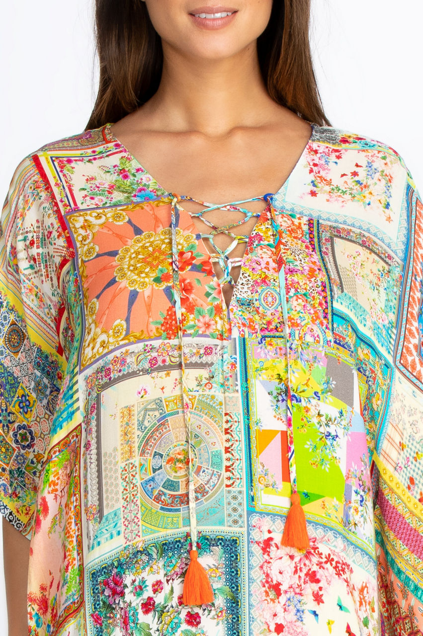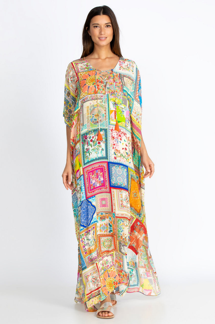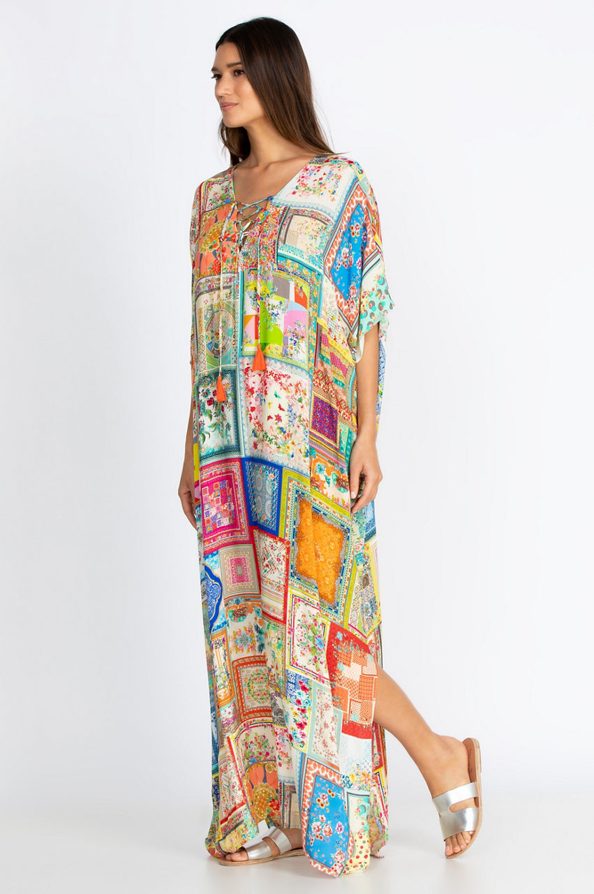 Effortlessly elegant and conveniently versatile, our Bella Lace Up Maxi Kaftan Dress is both a gorgeous dress on its own as well as the perfect cover-up for lounging poolside. The vibrant botanical-inspired print and fresh pops of floral throughout add a touch of boho appeal to any warm-weather look. Pair with your favorite sandals or espadrilles and a wide-brim hat for a perfect sunny day ensemble.