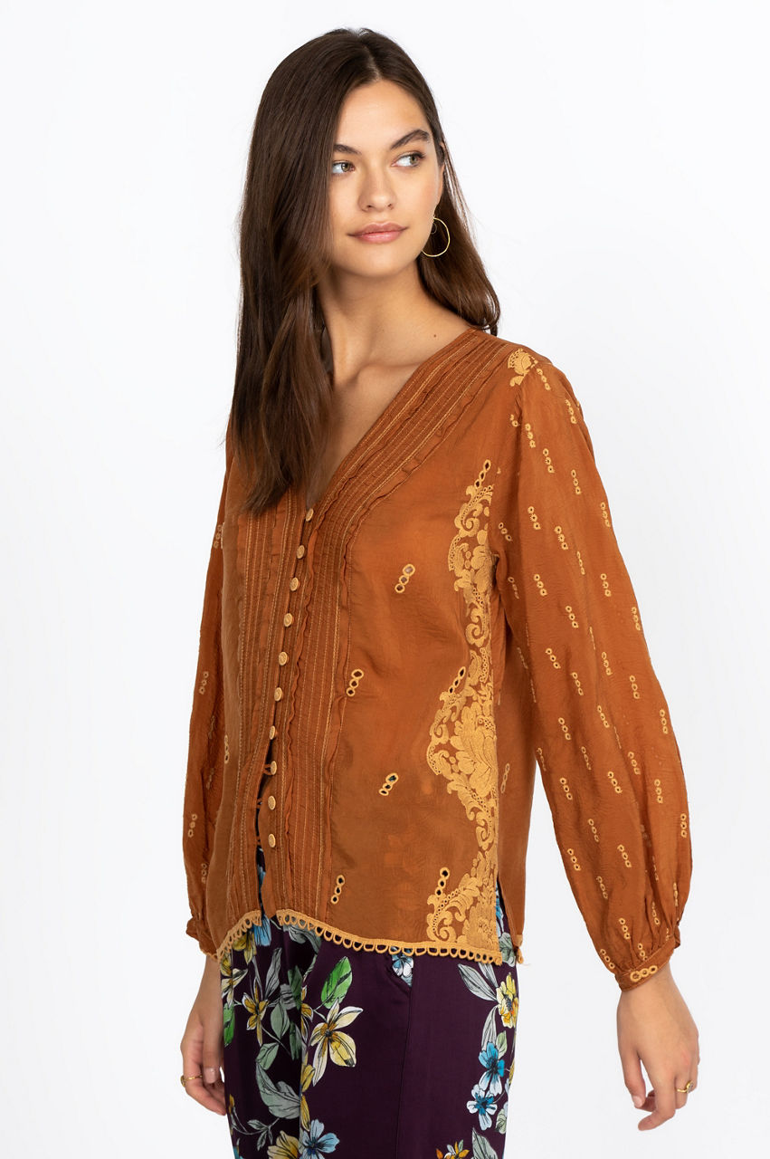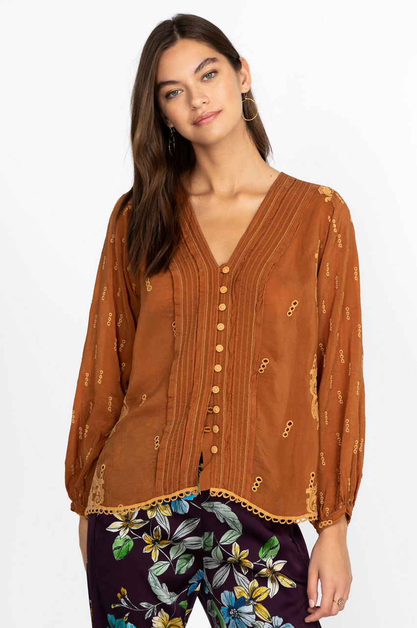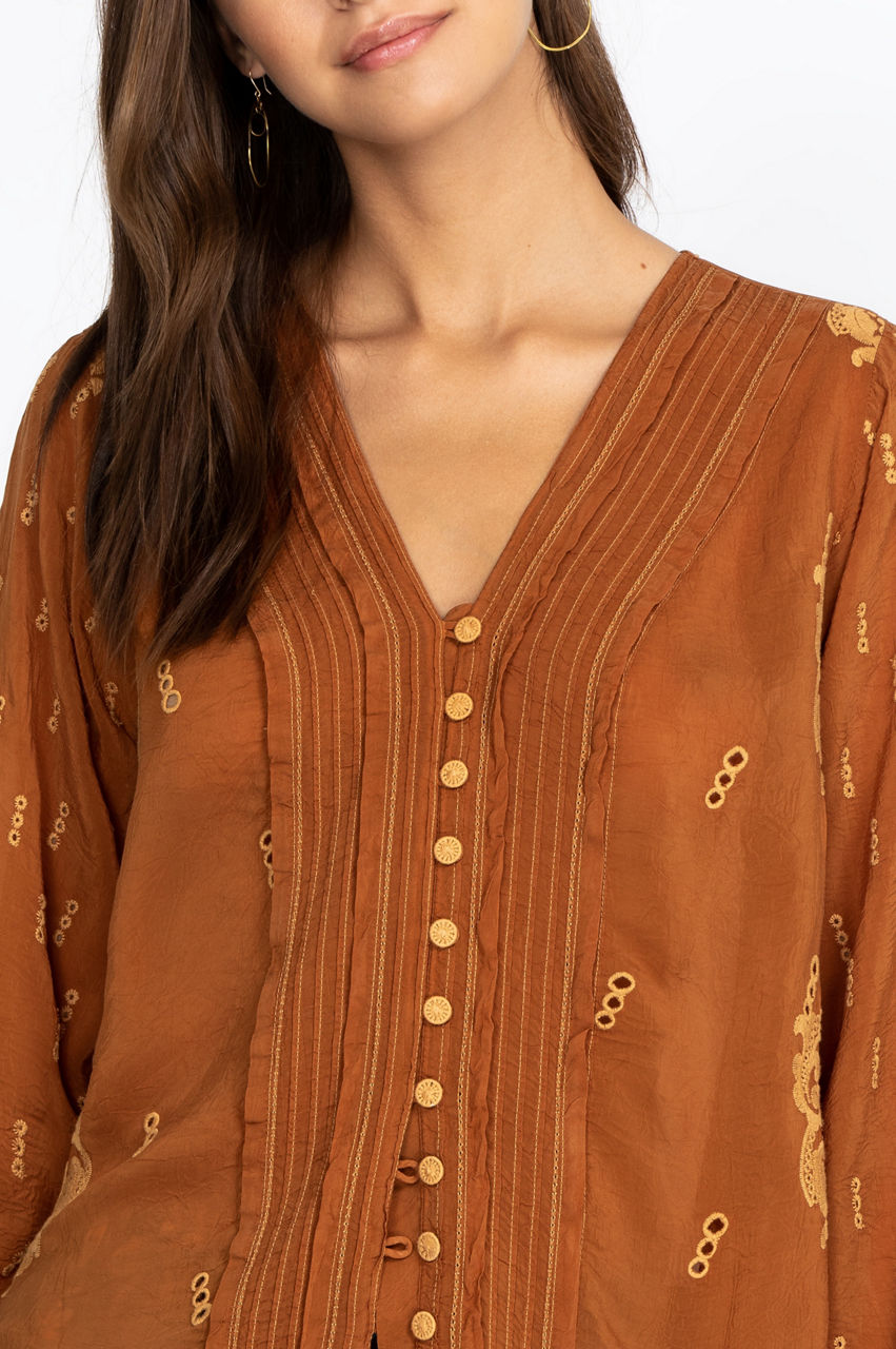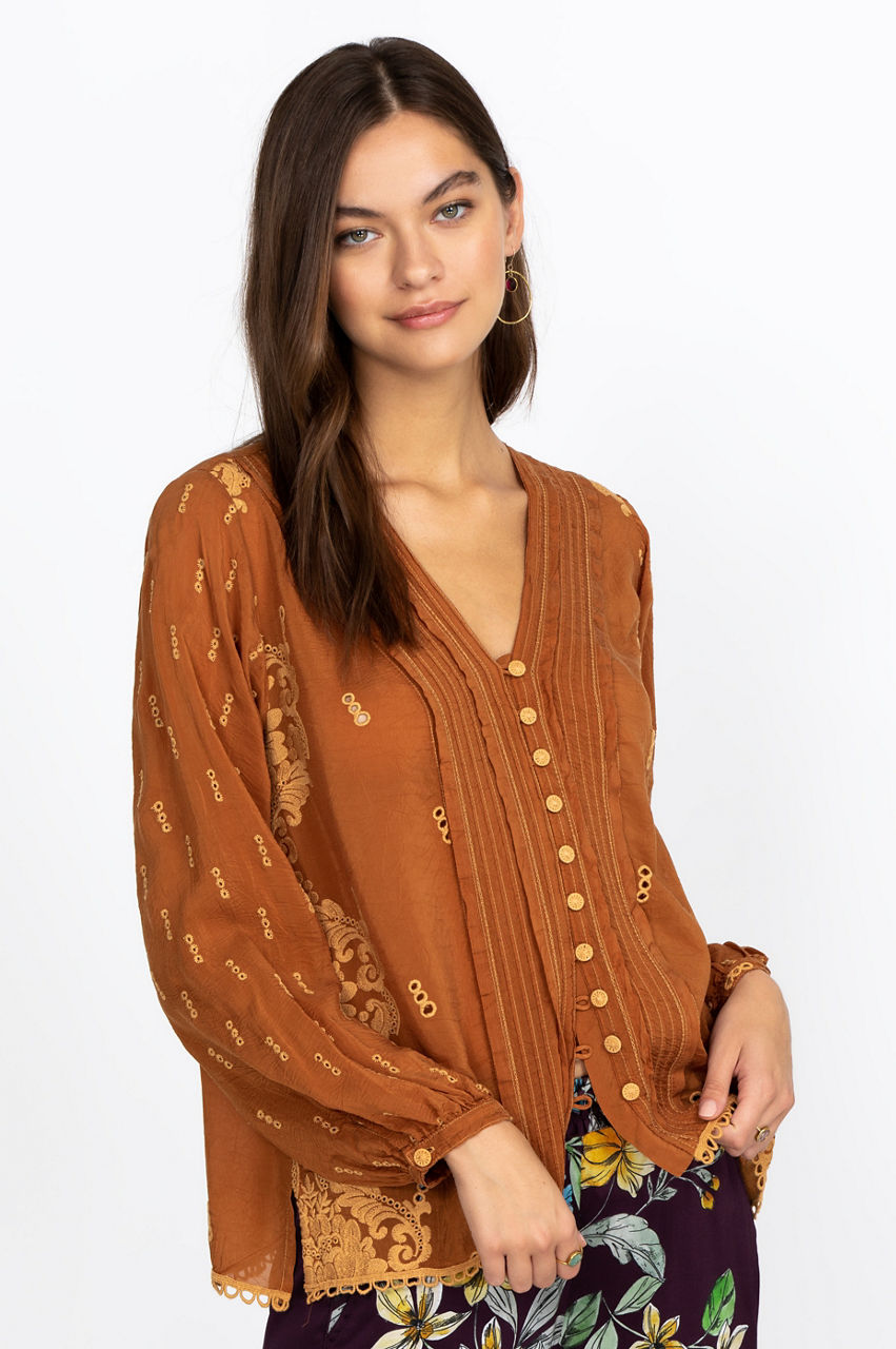 The delicate embroidery details elevate this gorgeous blouse, while the geometric lines draw attention to the front placket. Versatile and flattering, this blouse features a V-neck cut that will turn your favorite necklace or pendant into a statement piece. Layer this elegant piece with a soft cotton tank top for a laidback look, or pair it with a midi skirt and some tights for the cooler weather.