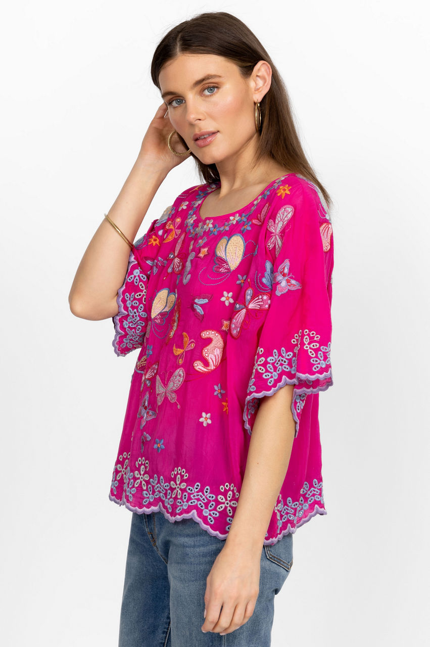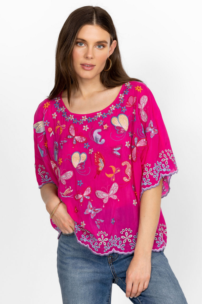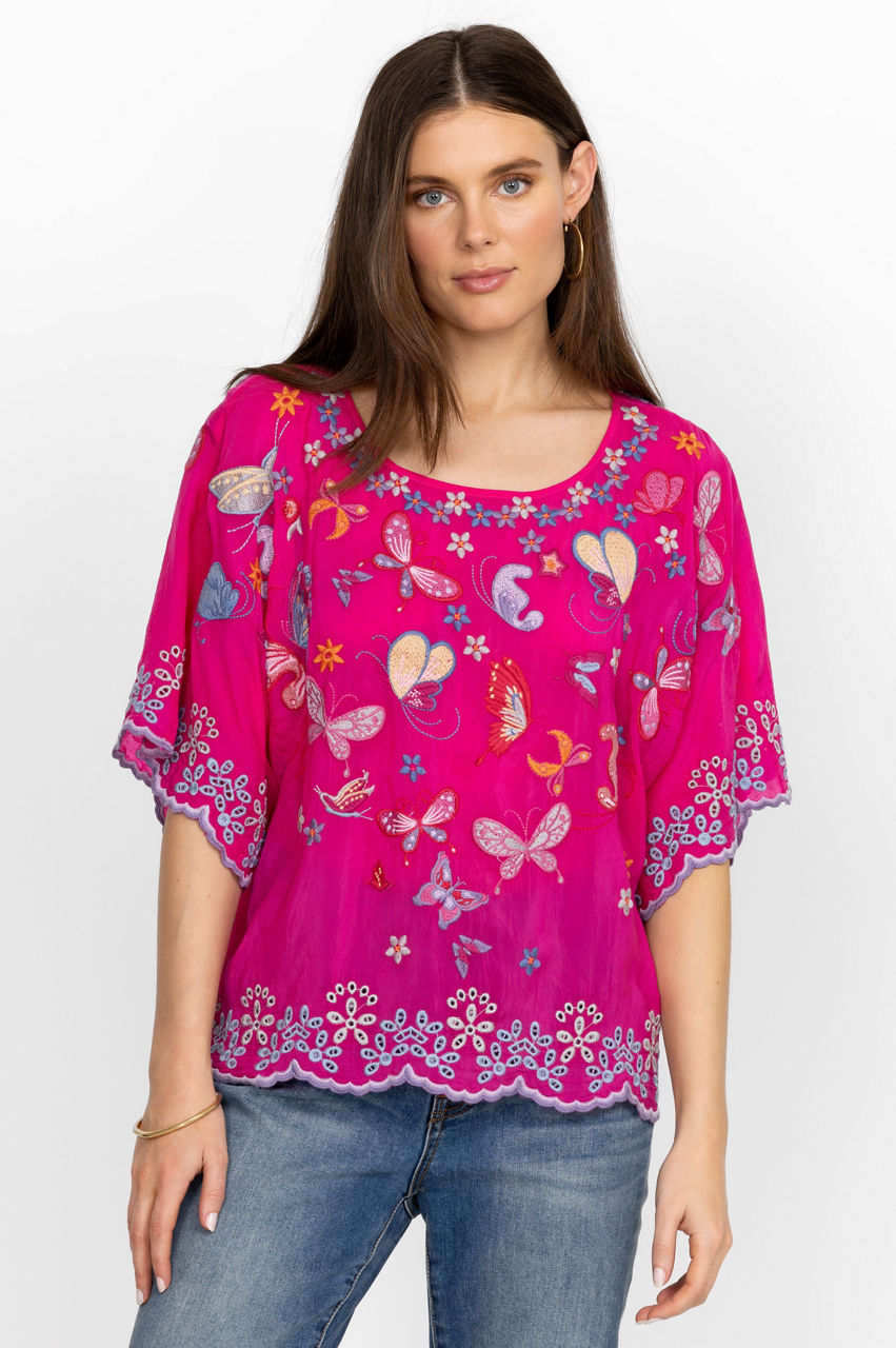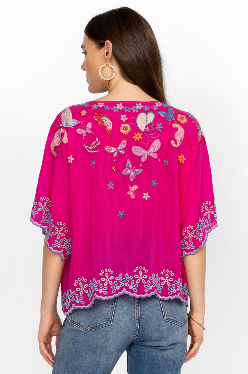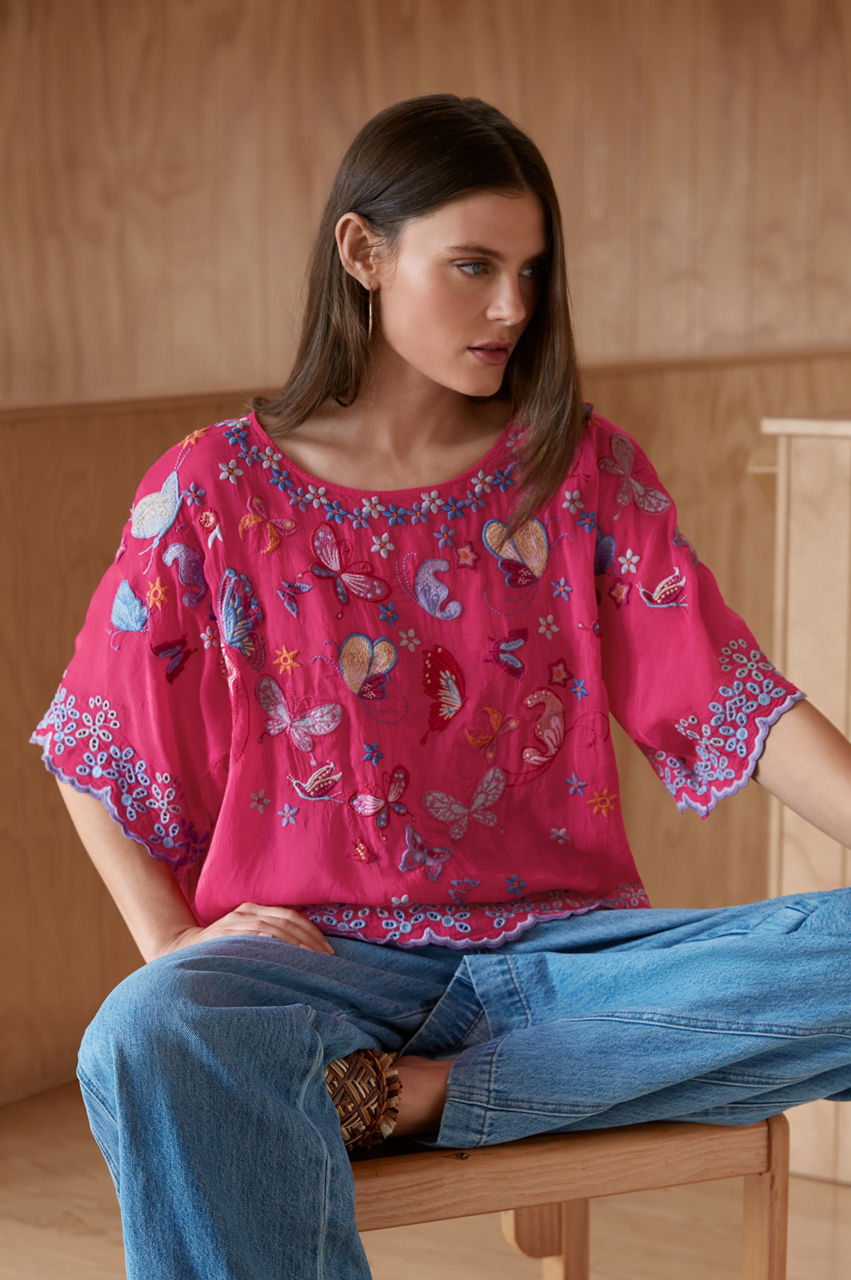 Festooned with fluttering butterflies, the Bellona Blouse adds a dreamlike quality to your new seasonal wardrobe. Carefully balancing color with shapes, this blouse is made from comfortable rayon and adopts a free-flowing silhouette with a round neck, a placement embroidery along the edges, and colorful butterflies concentrated close to the neckline and at the center. Team with wide-leg pants for a relaxed yet stylish daytime outfit.