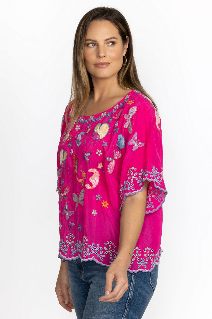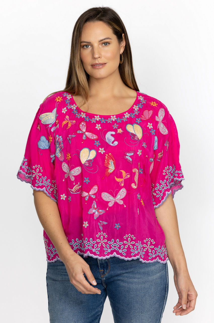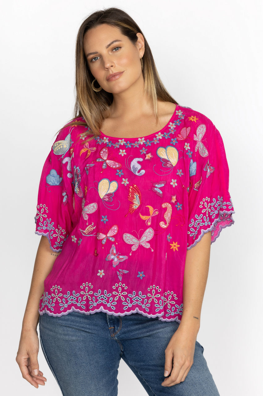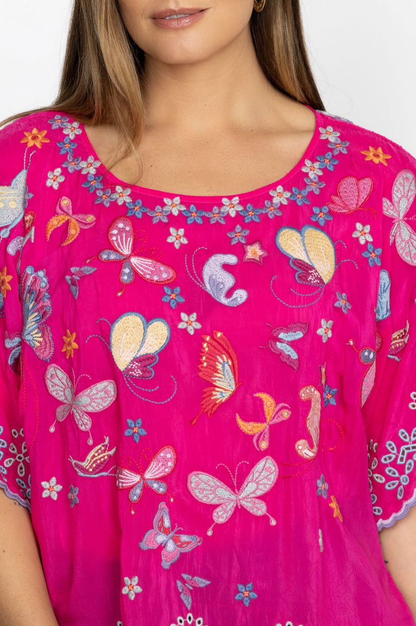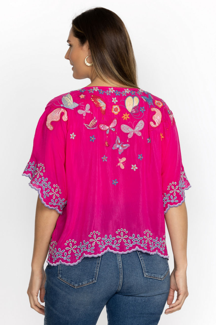 Festooned with fluttering butterflies, the Bellona Blouse adds a dreamlike quality to your new seasonal wardrobe. Carefully balancing color with shapes, this blouse is made from comfortable rayon and adopts a free-flowing silhouette with a round neck, a placement embroidery along the edges, and colorful butterflies concentrated close to the neckline and at the center. Team with wide-leg pants for a relaxed yet stylish daytime outfit.