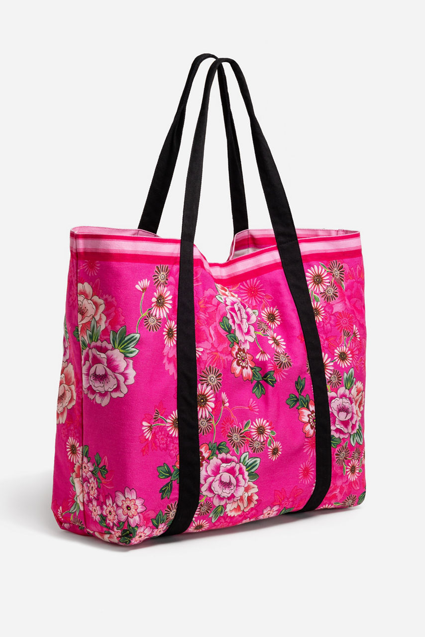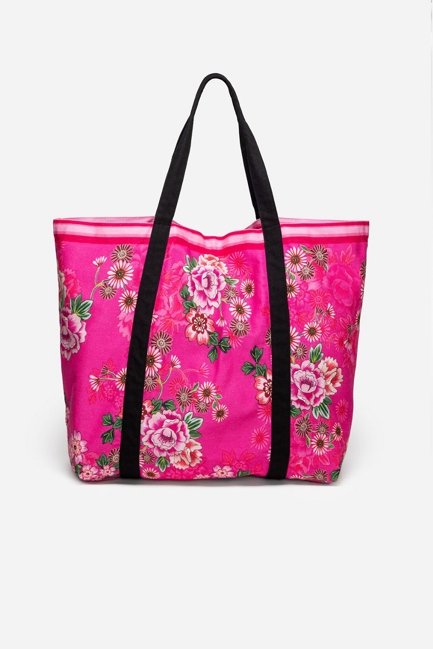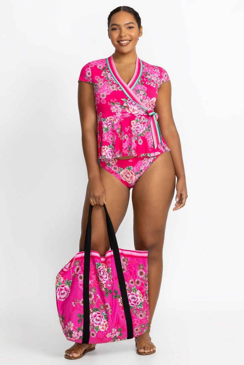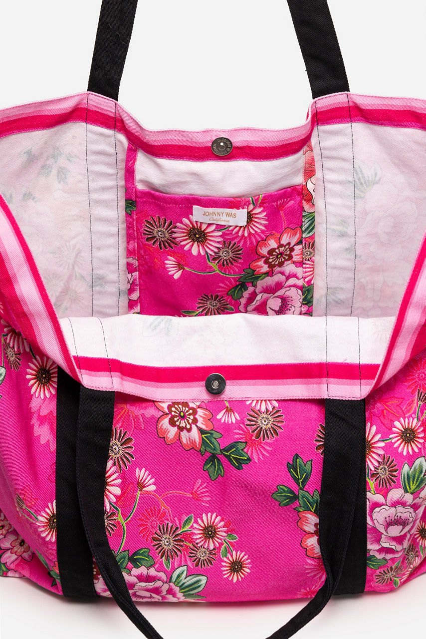 Crafted from rich 100% cotton, the Beach Tote is the perfect surfside accessory. Featuring a fresh floral print accented with a coordinating striped trim and black handles, this bag is finished with a magnetic top closure and an interior zip pocket. Pair with the Blum V-Neck Kaftan for a perfectly coordinated poolside ensemble.