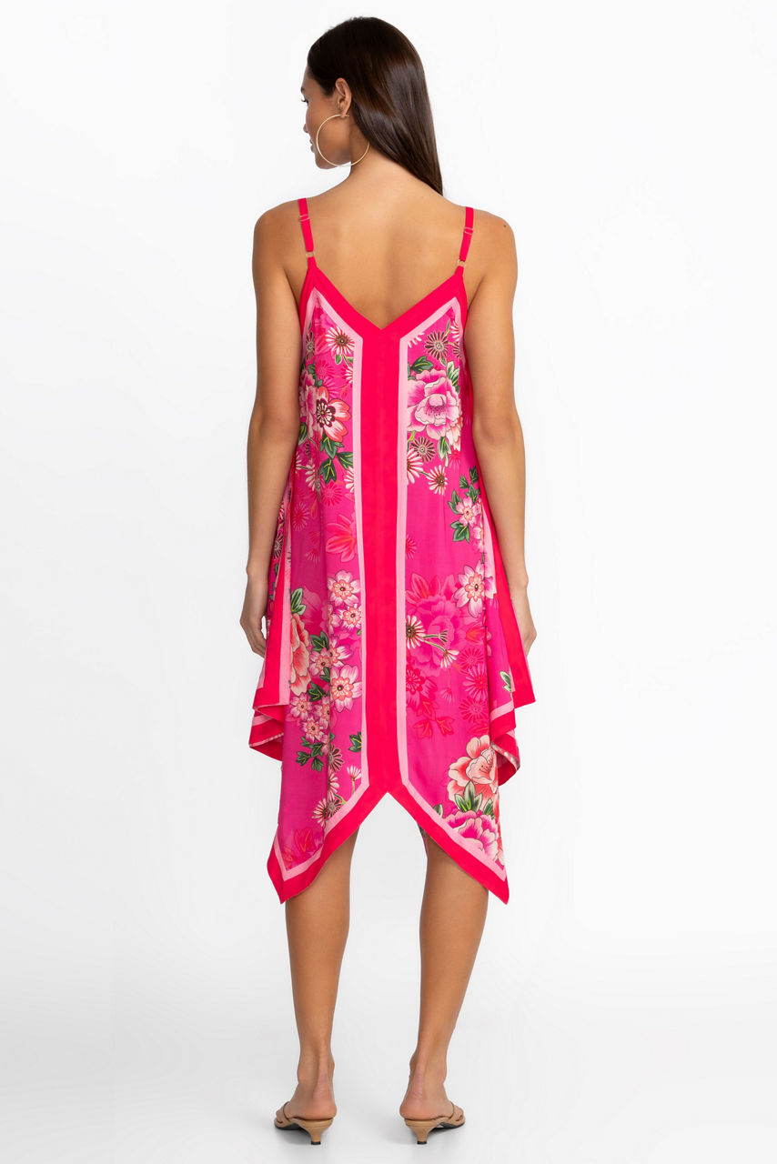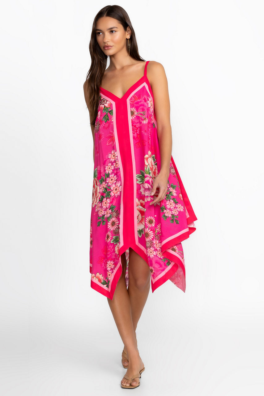 Crafted from a lightweight flowing fabric, the Belrose Scarf Dress adds an air of femininity to any poolside look. Featuring spaghetti straps and a V-neckline at the front and back, this handkerchief hem dress is embellished with a vibrant pattern in hues of pink. Layer over the Blum Ruched one Piece for a polished resort-ready look.
