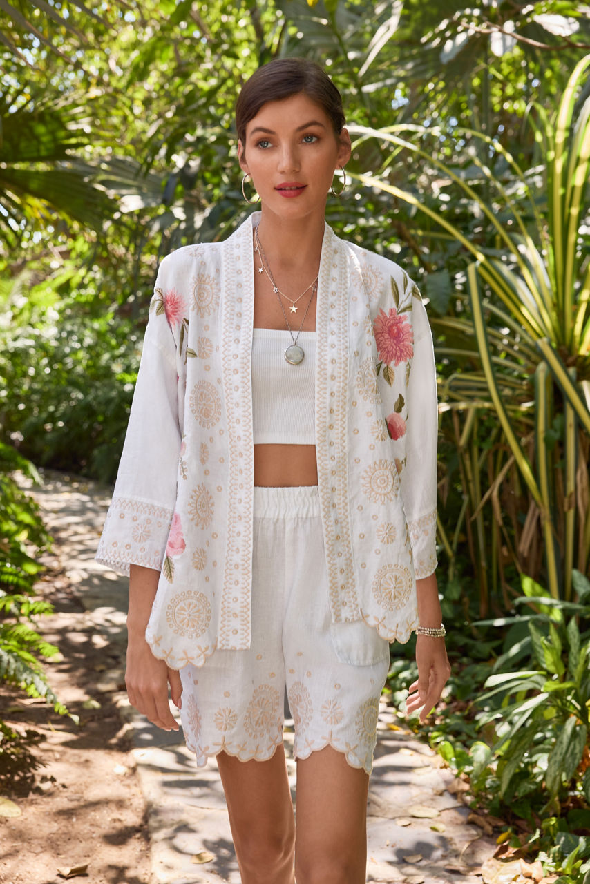 Crafted from 100% breathable cotton, the Della Bermuda Shorts are perfect for the warmest days. Designed with an elastic waistband and front slip pockets, these shorts are finished with embroidered detailing at the pockets and at the scalloped hemline. Pair with a classic tee and fashion sneakers for a vacation ready look.