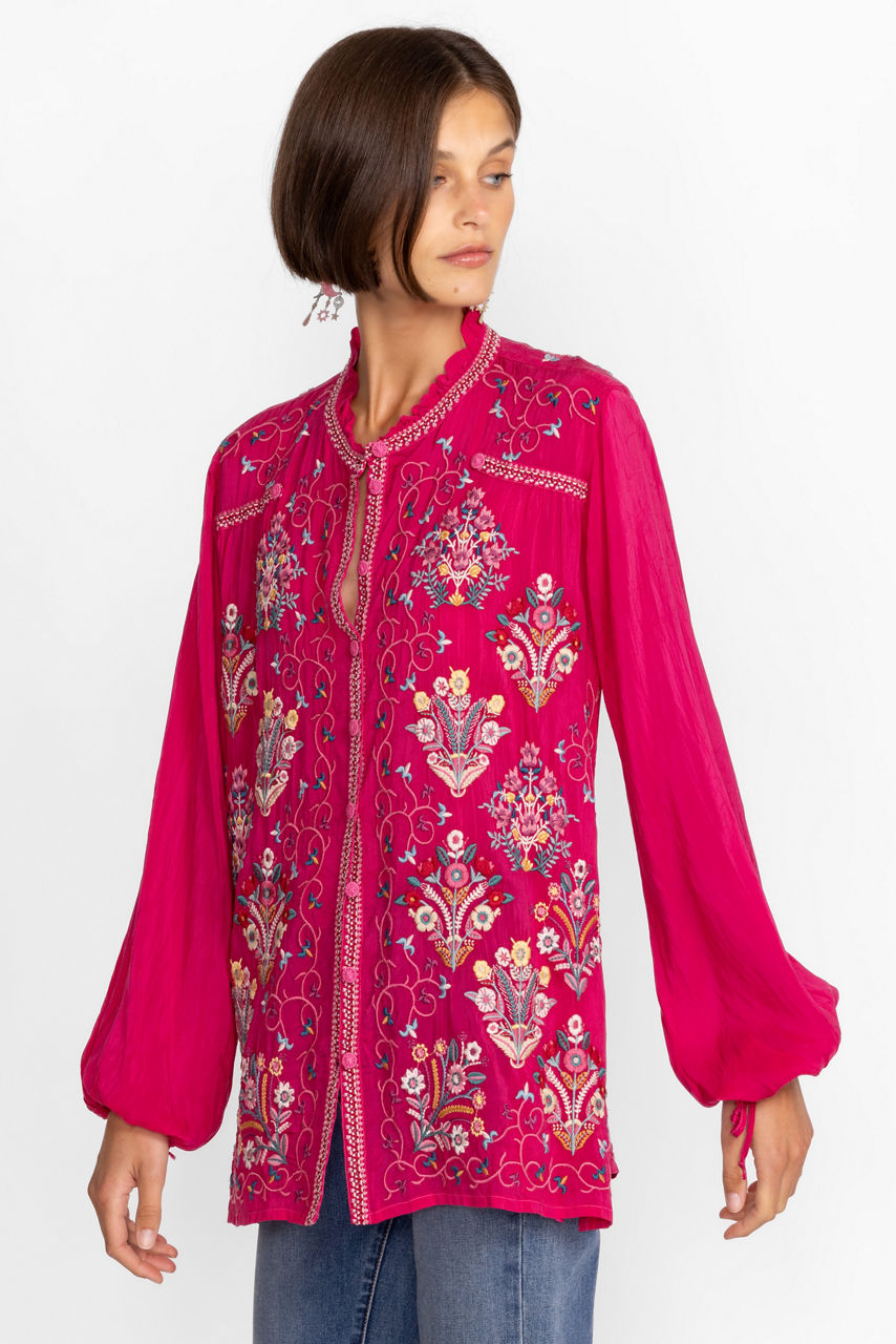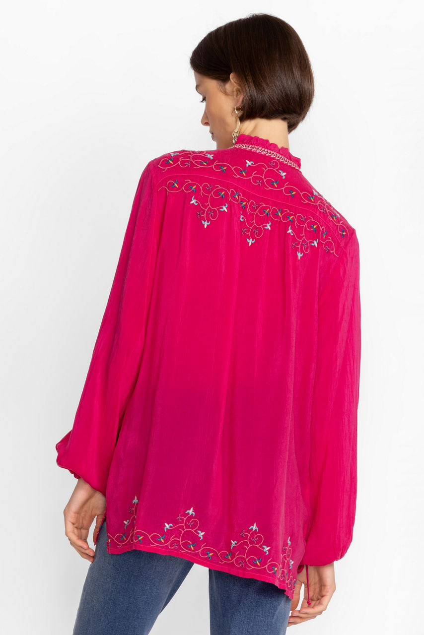 Presenting a delightful casual wear option, the Bertha Blouse is an endearing combination of color and design. Adorned with bold placement embroidery and featuring a unique drawstring sleeve, this beautiful blouse is the perfect way to elevate your weekend wardrobe. Pair with dark wash jeans and pointed flats for an elevated casual look.