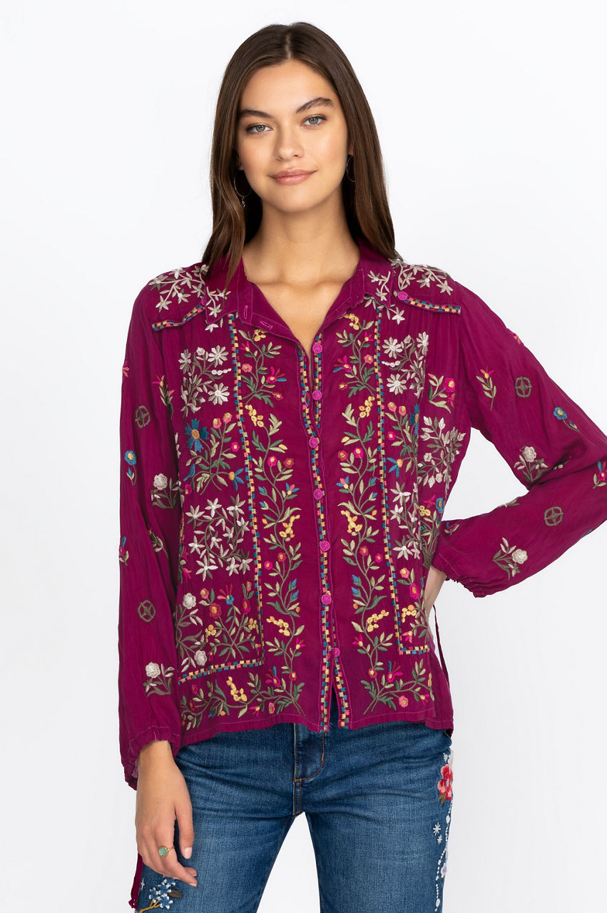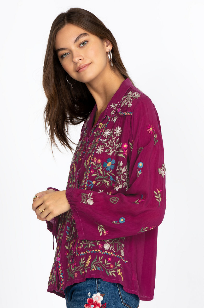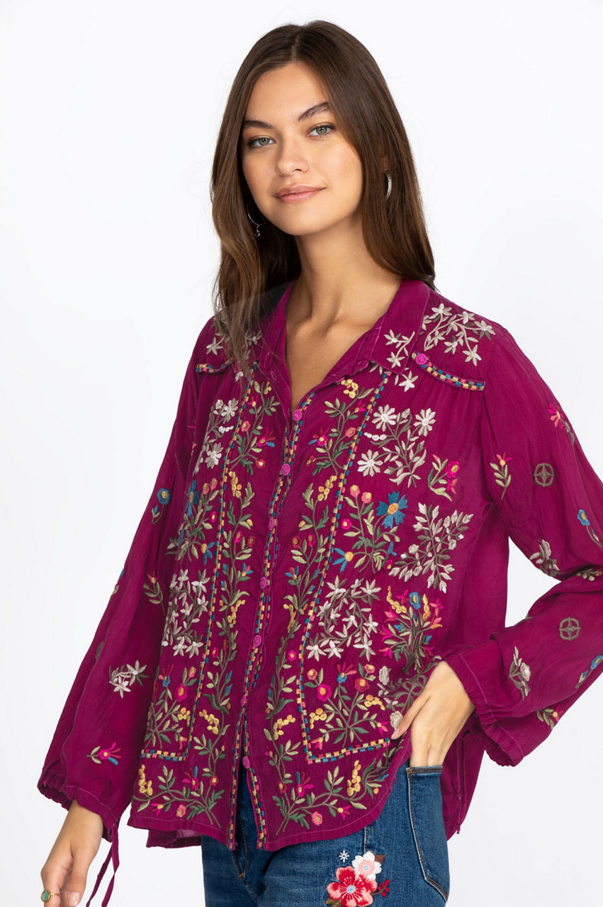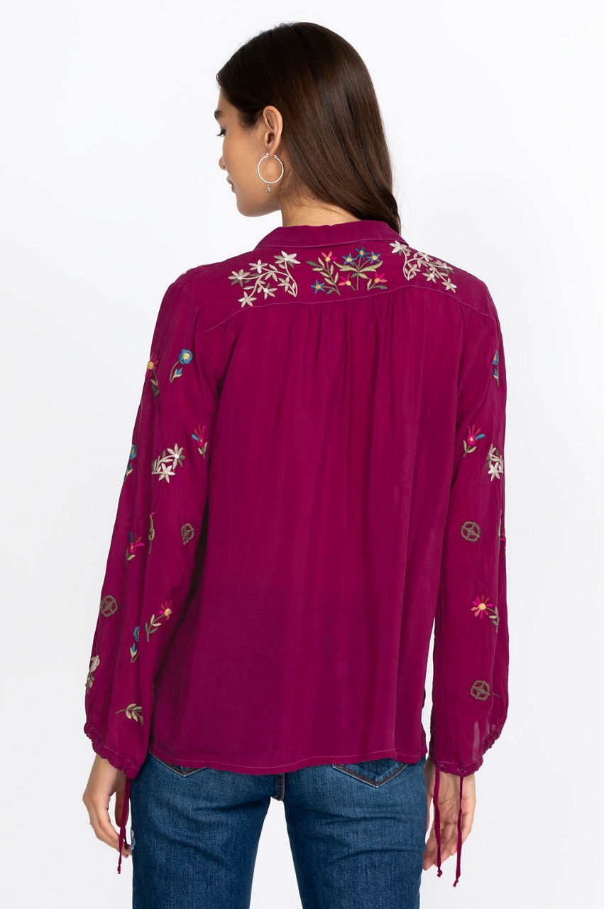 This boho-chic piece is a stunning garment that will let your free-spirited nature shine through. The elegant embroidery details add visual interest to the piece, while the drawstring sleeve cuffs add a touch of originality. This blouse is a must-have Fall piece with its nature-inspired pattern and versatile cut. Wear it under a fringed jacket and add some knee-high boots to complete the boho-chic look.