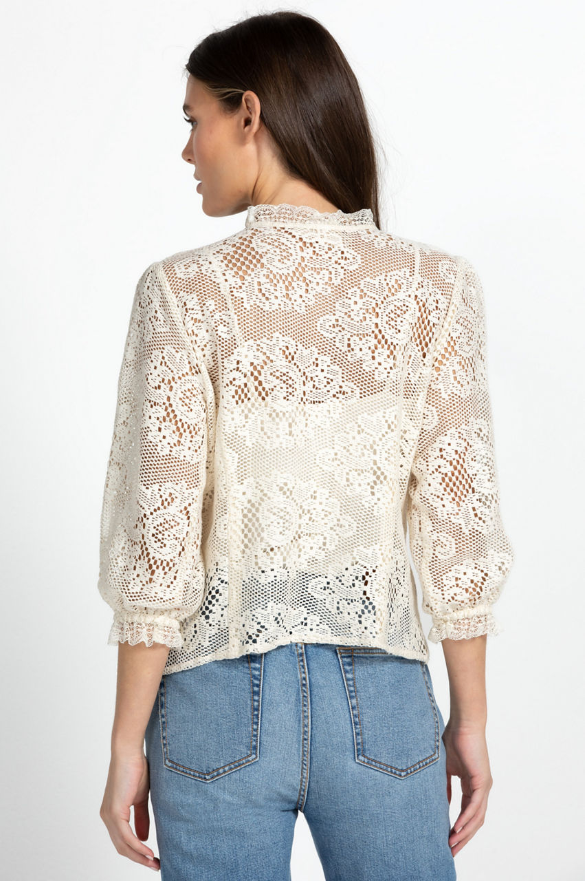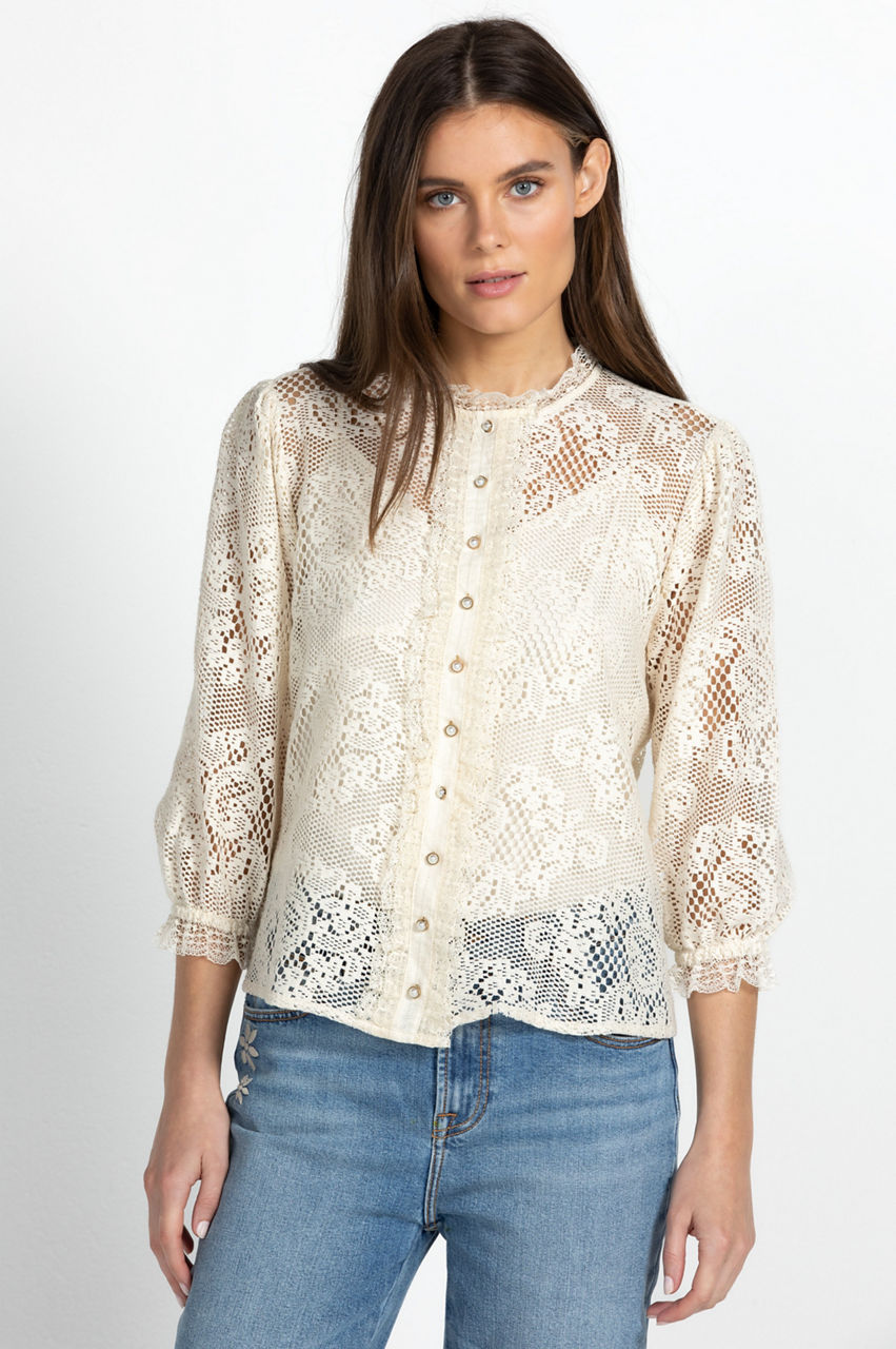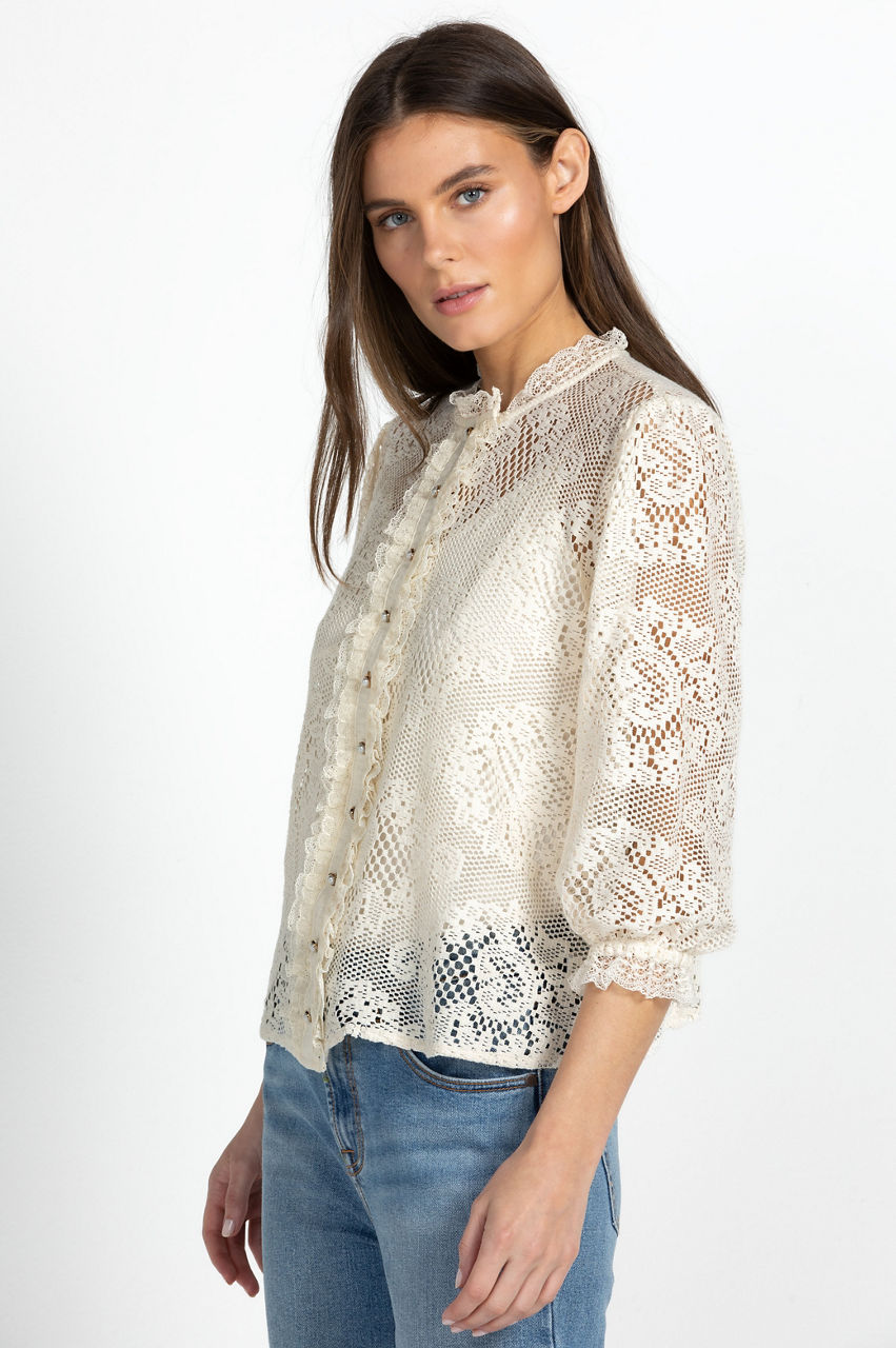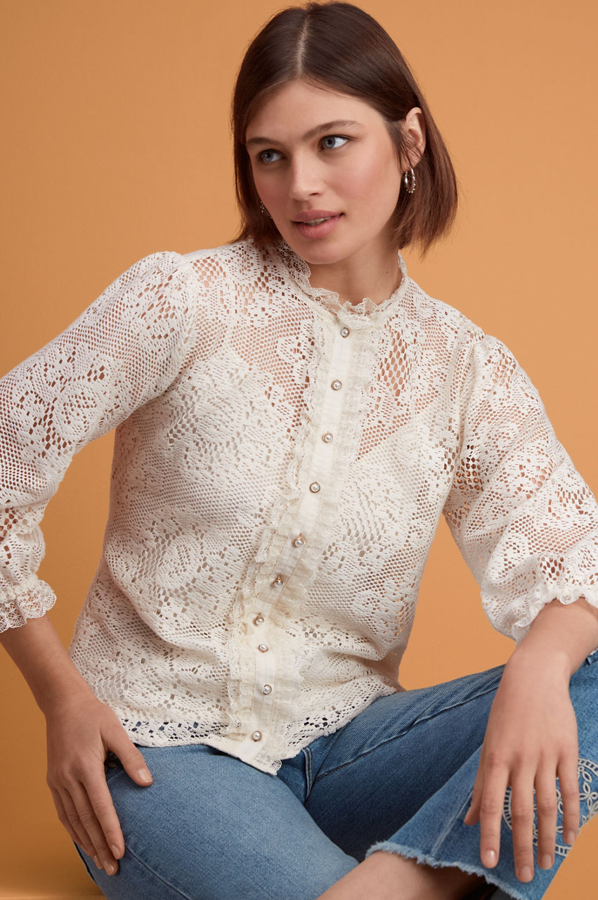 Cut in a regular fit, the Betty Blouse updates a timeless wardrobe favorite with prairie-like details and a vintage mood. The short sleeves, front button closure, and round neckline are punctuated with frill trims while the subtle floral-patterned lace adds a graceful touch. Finished with gathering at the shoulders, this summer-ready style will work wonders with denim and soft tailoring.
