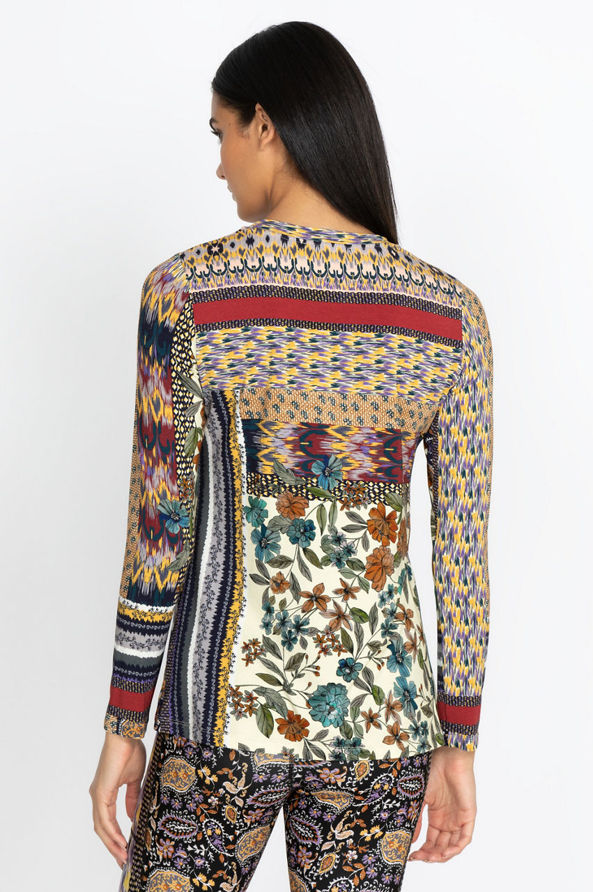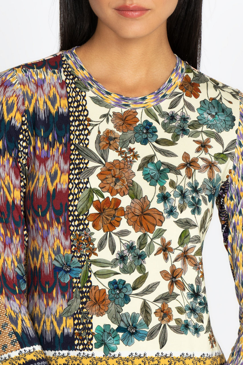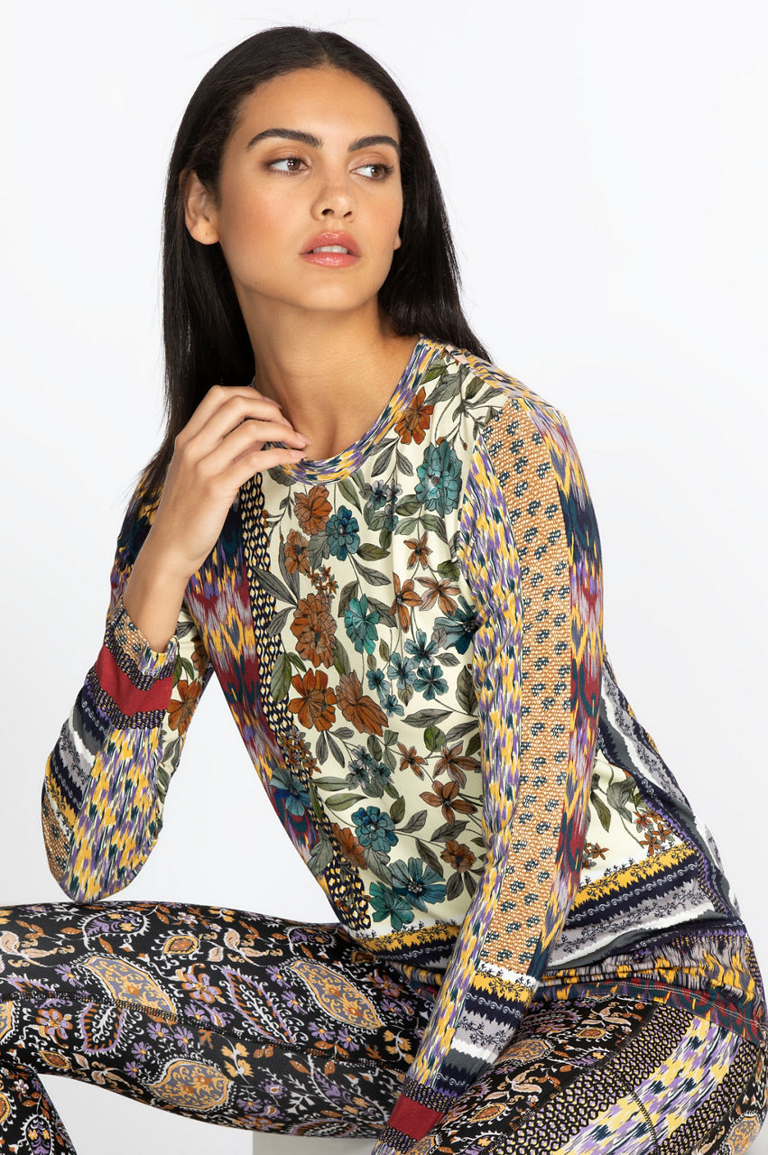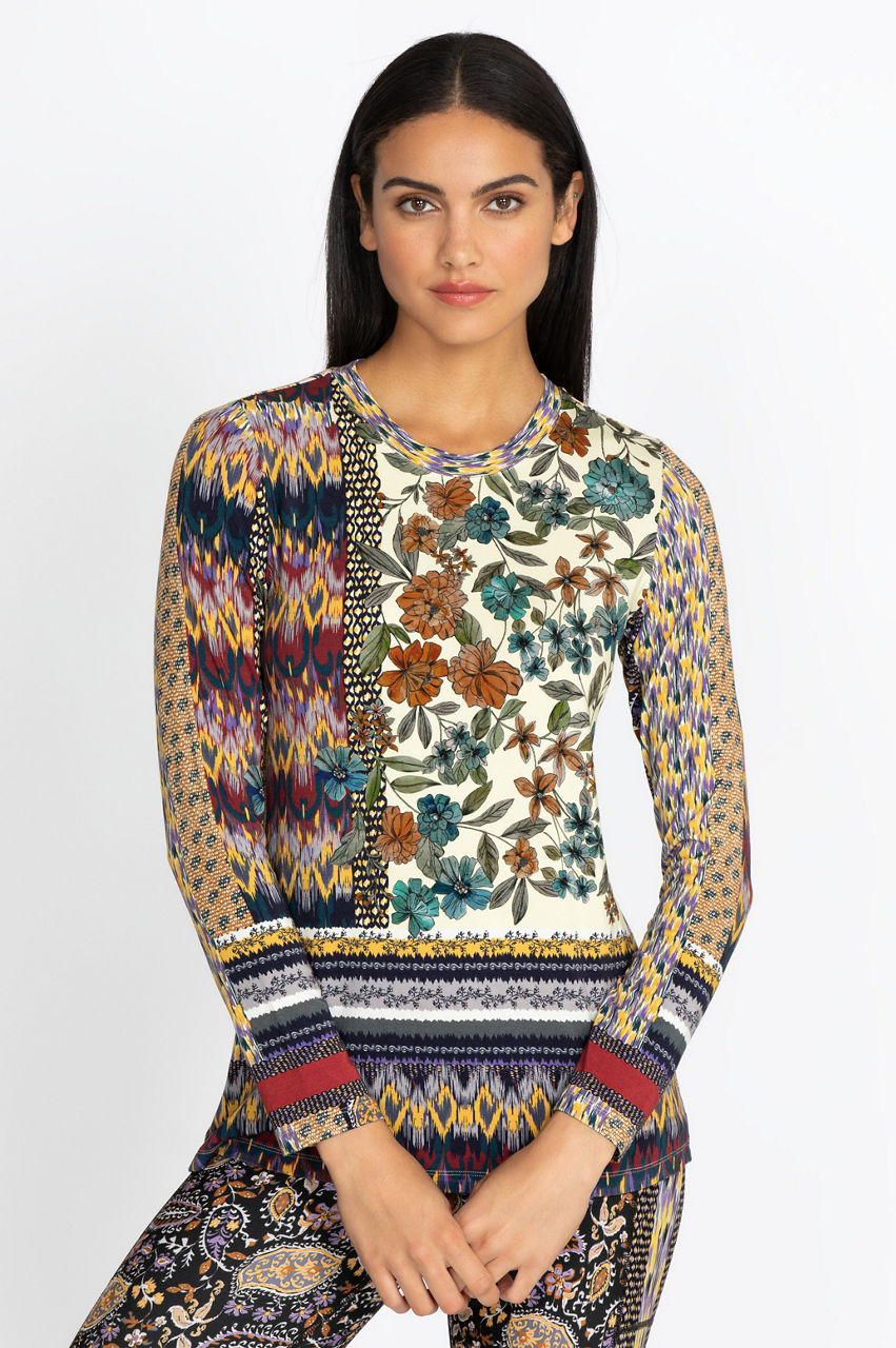 Our Betzy Favorite L/S Crew Neck Tee combines specialty fabrics, uniquely beautiful patterns, and a flattering silhouette to give you a tee that turns into a wardrobe staple. Pair this top with white baby boot pants and flats to bring together a casual yet charming ensemble.