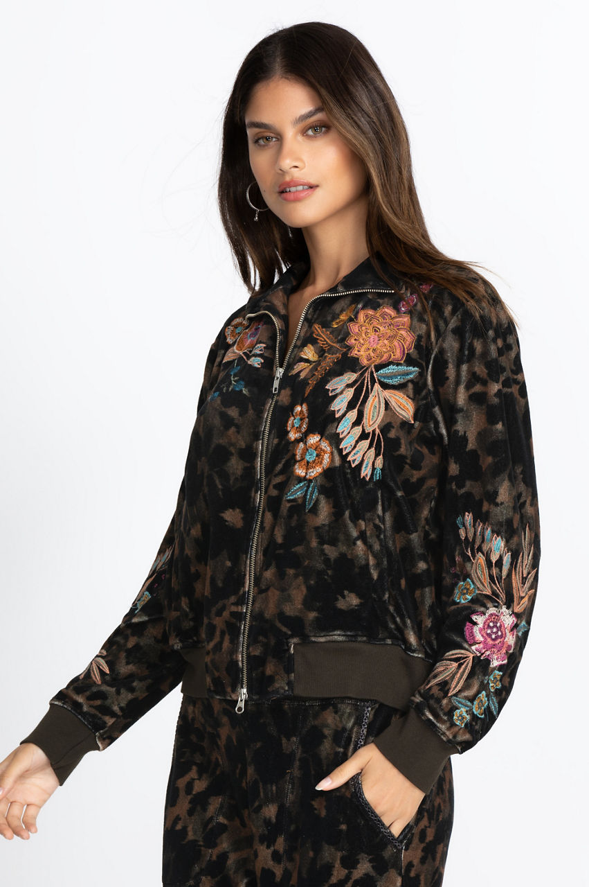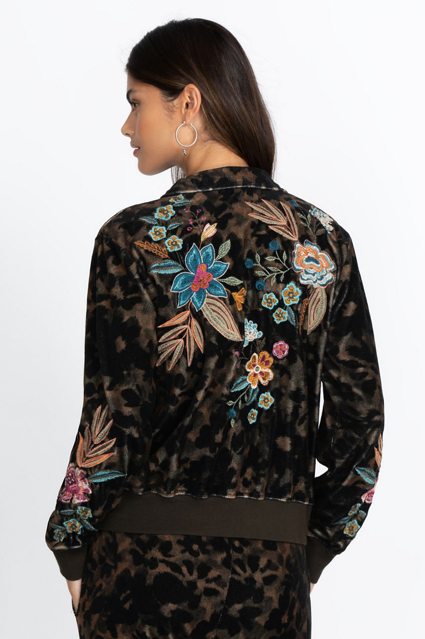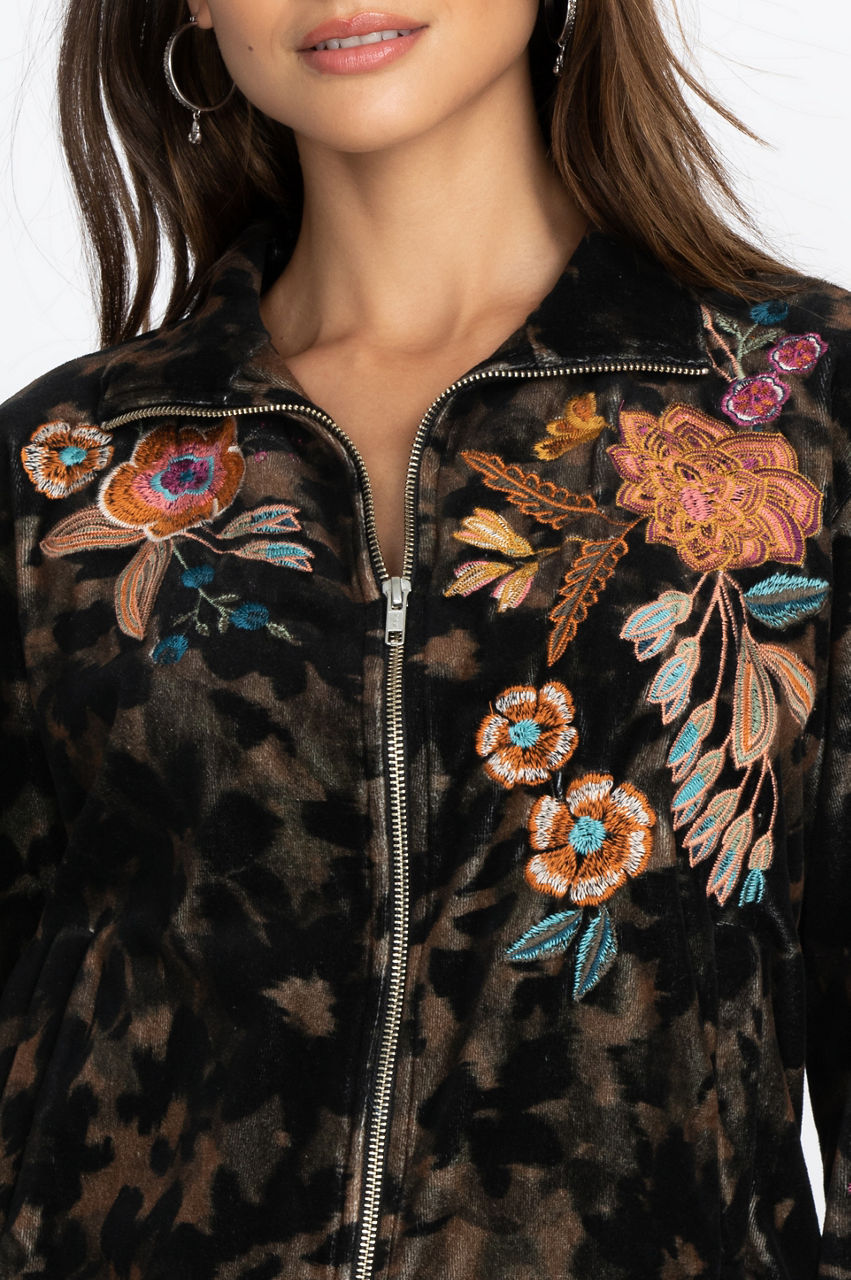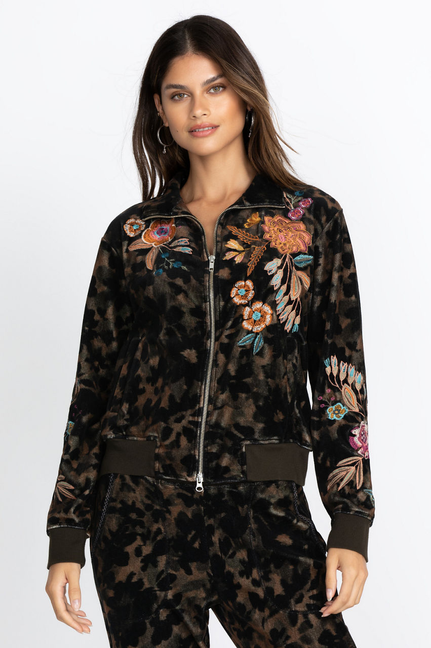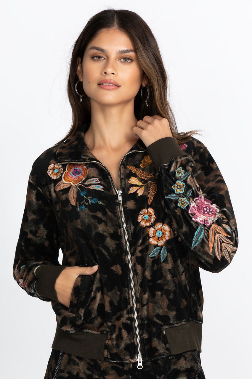 The Bianca Velour Mock Neck Top, either in White or Jungle Green, is the perfect accessory for an evening bonfire at the beach or an al-fresco dinner at your favorite restaurant. Beautiful embroidery embellishes the front and sleeves of this fashionable light jacket. Ribbed cuffs and a partially ribbed waistband provide the fit and comfort you desire for anything from a date night to a girl s night out.