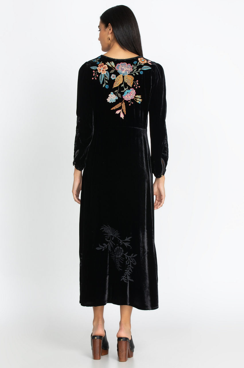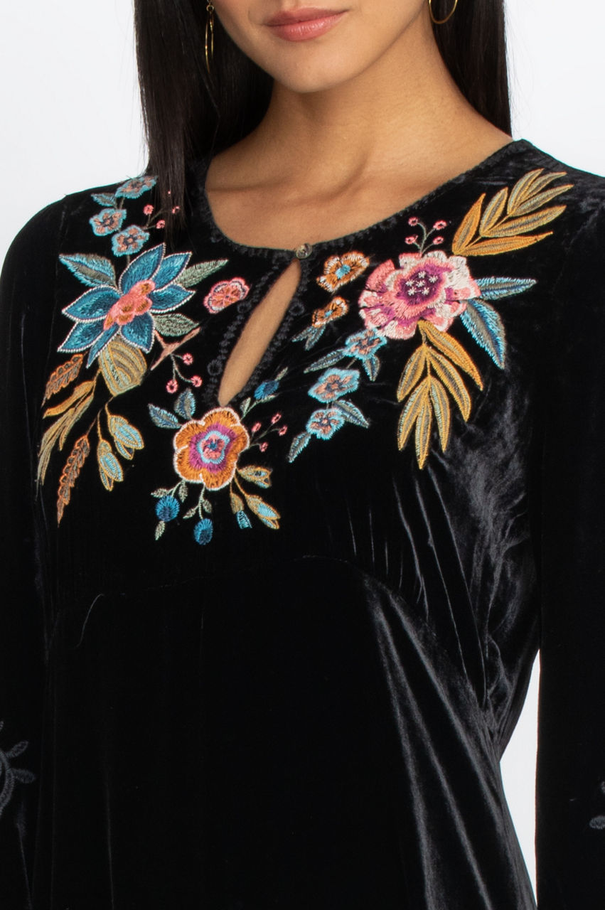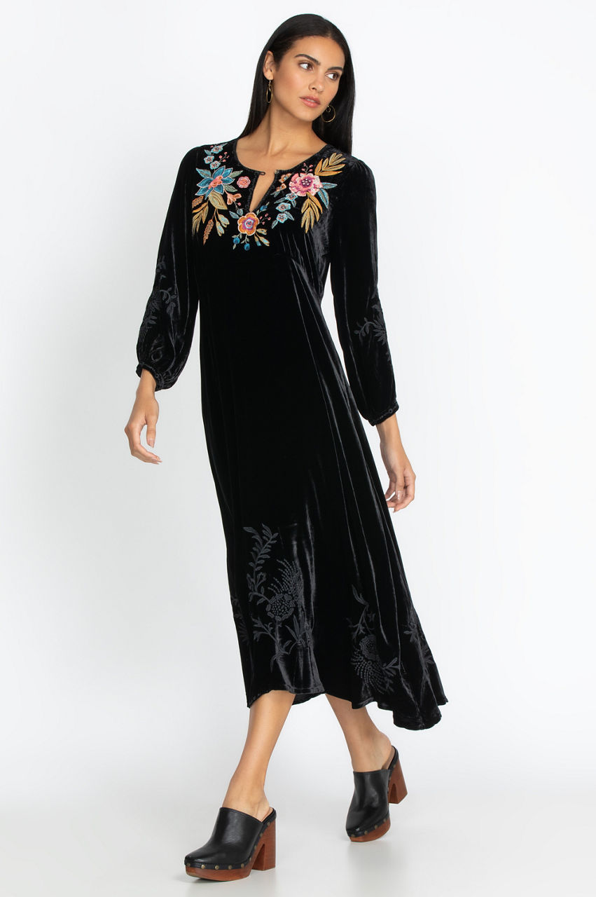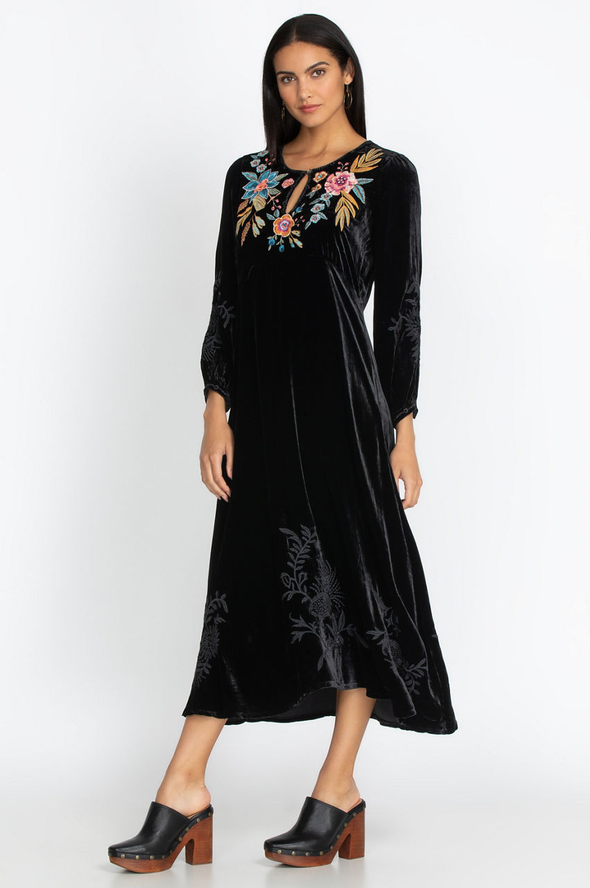 Our Bianca Velvet Maxi Dress is perfect for an elegant evening out when paired with flat, tan, knee-high boots. This dress is also casual enough to wear for Sunday brunch. The Bianca features tonal embroidery on the long, buttoned sleeves and colorful floral embroidery on the bodice. Pair with plain drop earrings for an elegant look or your favorite colorful earrings for a more playful look.