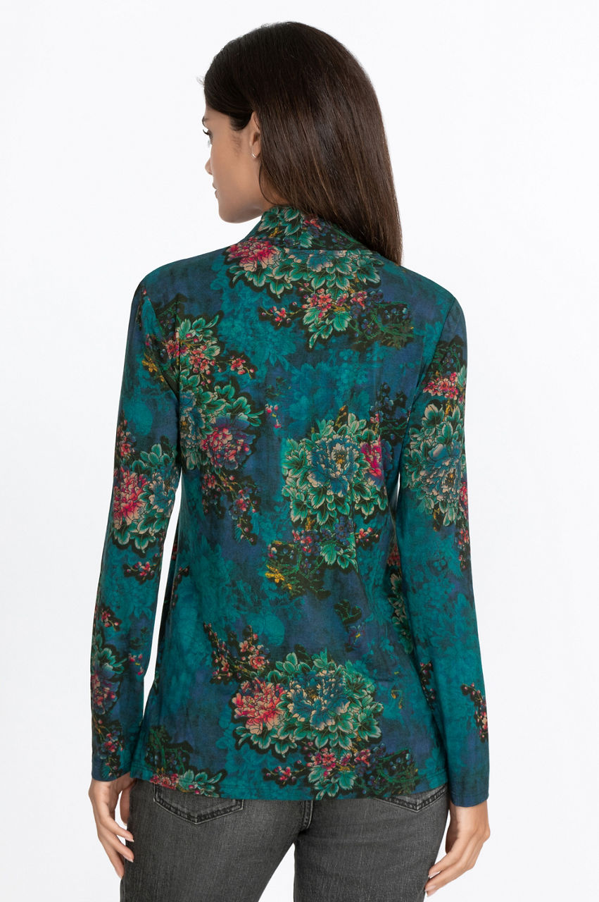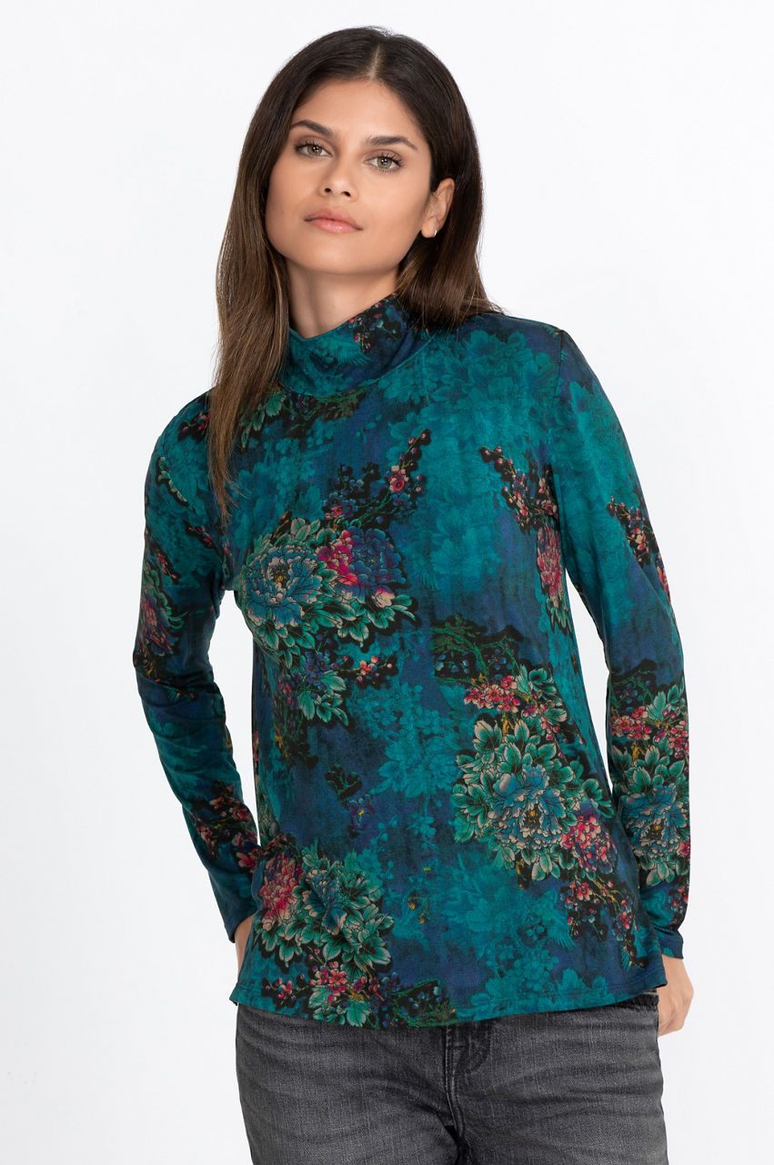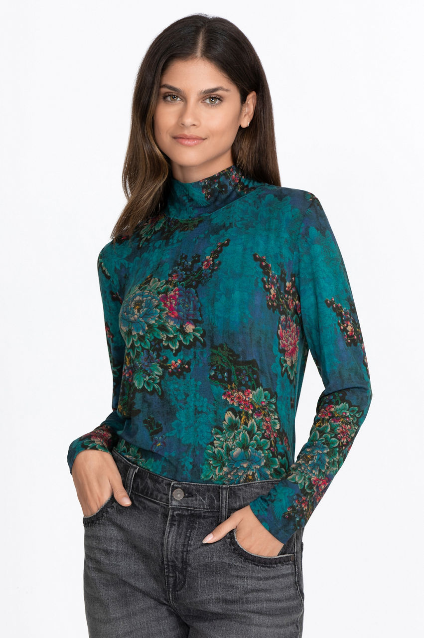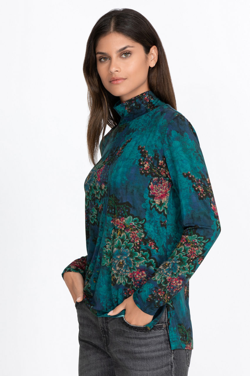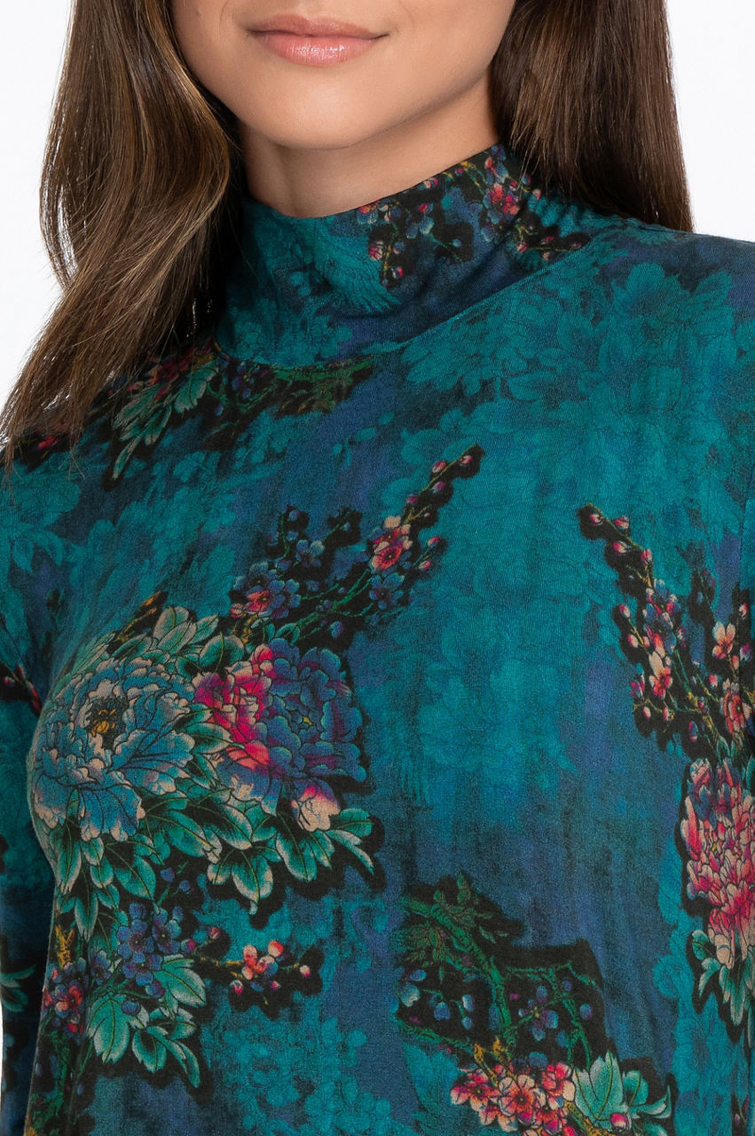 This stunning top stands out with its rich hue and floral motif. The mock neck detail adds structure and originality to this timeless staple while the long sleeve design and floral print make it suitable for a wide range of occasions. Pair it with some neutral leggings to bring out the floral print and add a few layered necklaces to draw attention to the mock neck design.