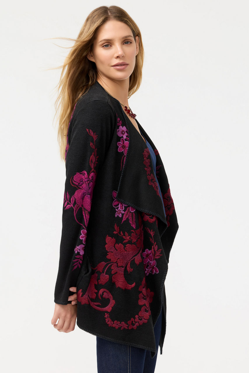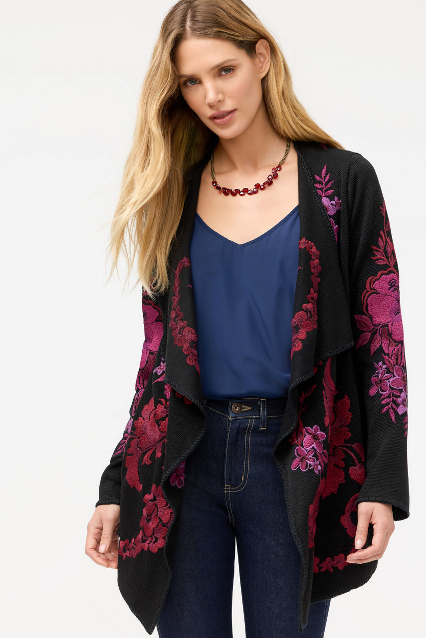 Brilliantly embellished with a vibrant floral pattern, the Biya Draped Sweater is equal parts stylish and cozy. Designed with an elegant, draped front and long sleeves, this open-front sweater is finished with an intricate blanket stitch detail at the edges. Layer over a silk button-down paired with flowing wide leg trousers for a polished evening look.