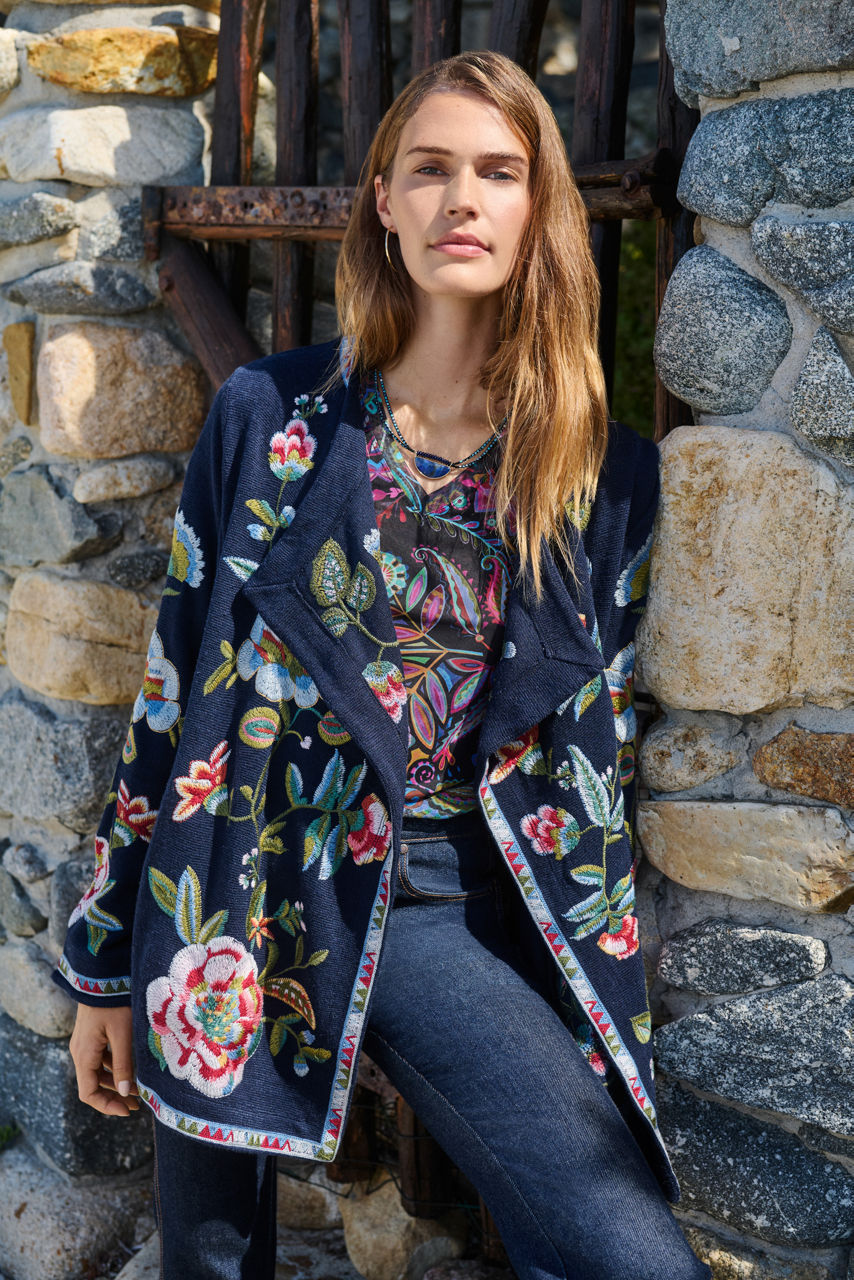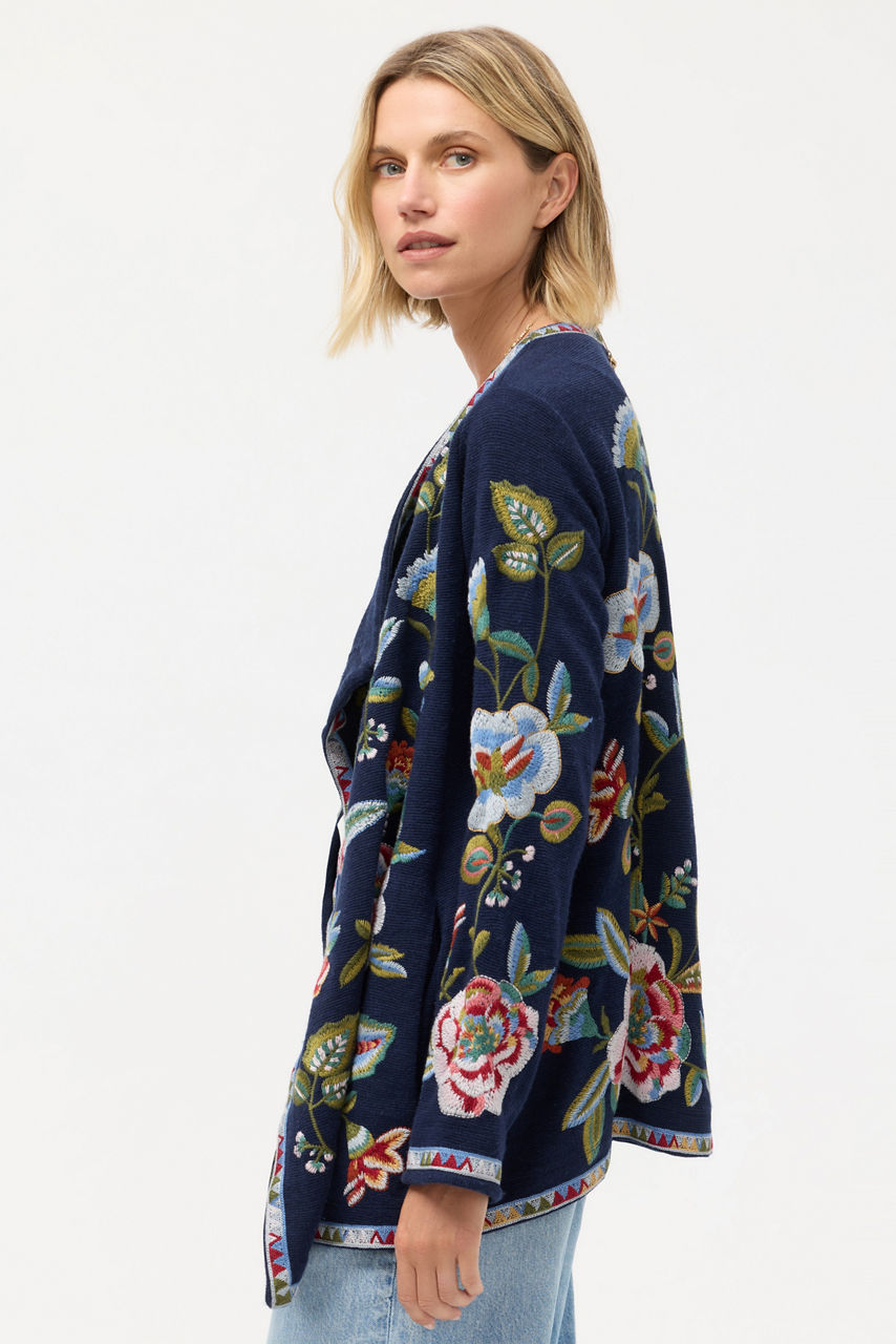 Intricately embellished with vibrant floral embroidered detailing, the Gillian Biya Draped Sweater is equal parts cozy and stylish. Designed with a cascading shawl collar and an open front, this cozy sweater is finished with pockets at the sides. Layer over a coordinating vibrant top and pair with flowing silk palazzo pants for dinner out with friends.