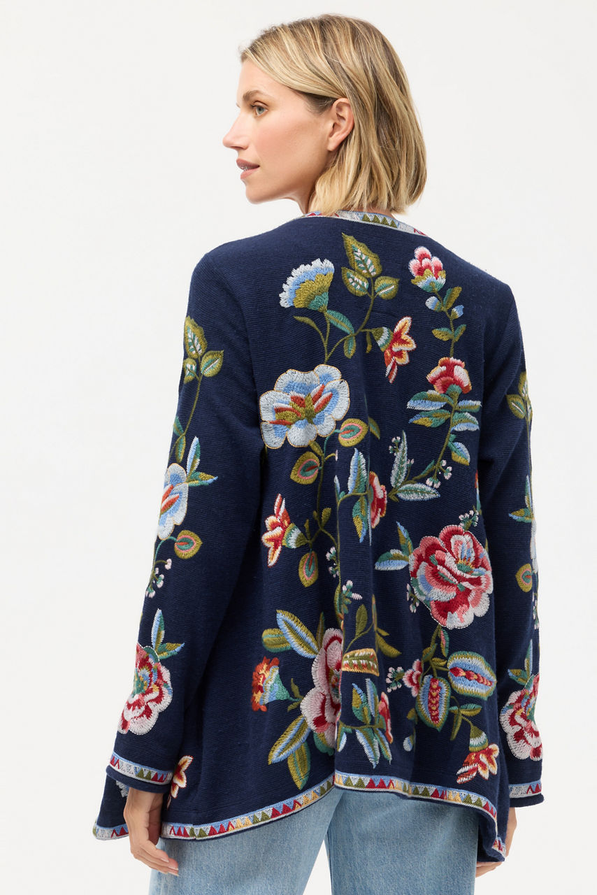 Intricately embellished with vibrant floral embroidered detailing, the Gillian Biya Draped Sweater is equal parts cozy and stylish. Designed with a cascading shawl collar and an open front, this cozy sweater is finished with pockets at the sides. Layer over a coordinating vibrant top and pair with flowing silk palazzo pants for dinner out with friends.
