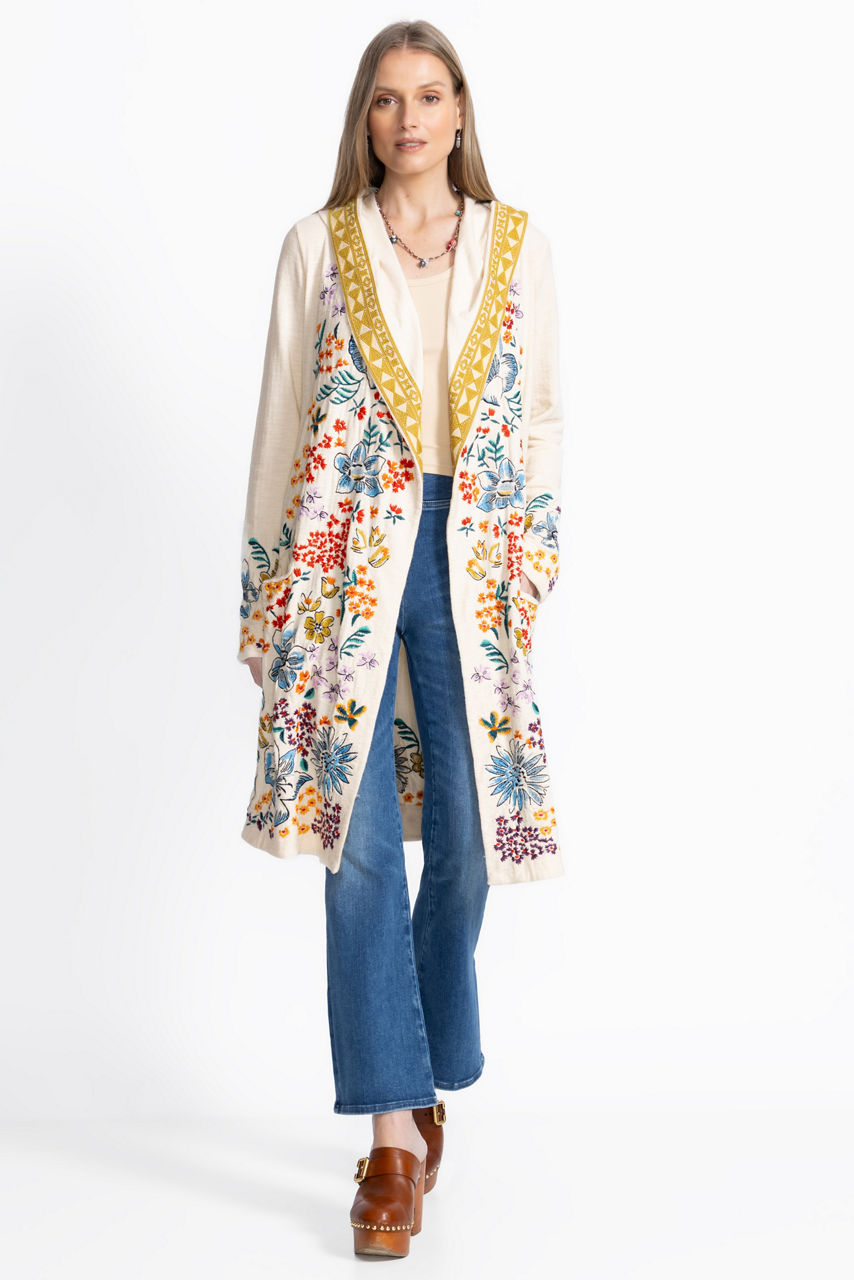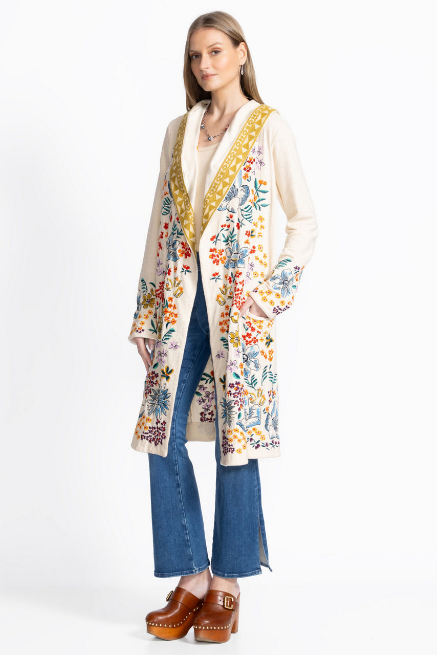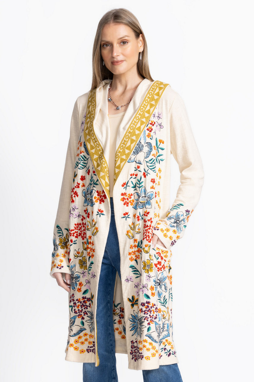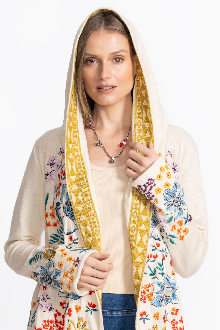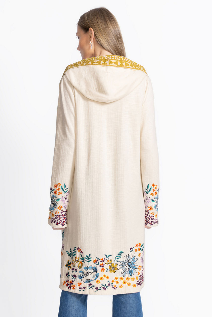 Beautifully embellished with intricate floral embroidery and contrasting trim, the Biya Duster is a stunning layering piece. Crafted from 100% breathable cotton, this casual duster offers a cozy hood and features and open front and easy slip pockets. Layer over a casual tee and pair with fitted denim for an unforgettable casual ensemble.