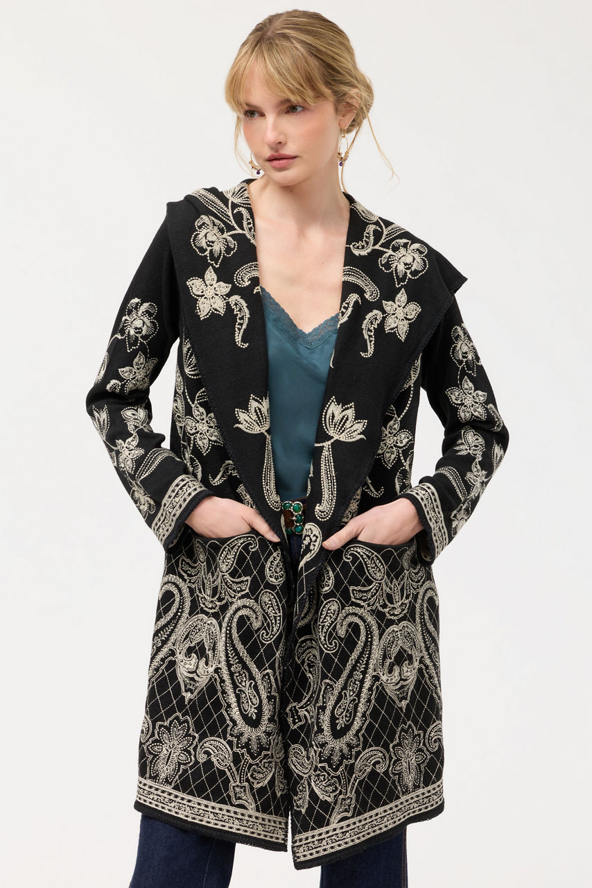 Beautifully embellished with intricate floral embroidery, the Gatsby Biya Duster elevates any casual look. Designed with an open front and an attached hood, this unique duster offers slip pockets and is finished with blanket stitching at the edges. Layer over a trendy jumpsuit and pair with coordinating ankle boots for a night out with friends.