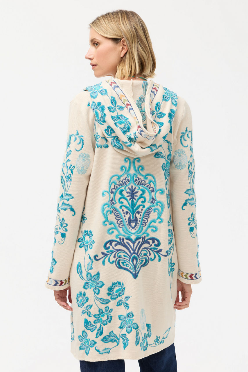 Beautifully embellished with icy blue embroidered detailing, the Vittoria Biya Duster is an eye-catching layering piece. Featuring an open front and attached hoof, this cozy duster is finished with pockets at the sides. Layer over a coordinating blouse and pair with relaxed denim for a polished casual look perfect for a night out with friends.