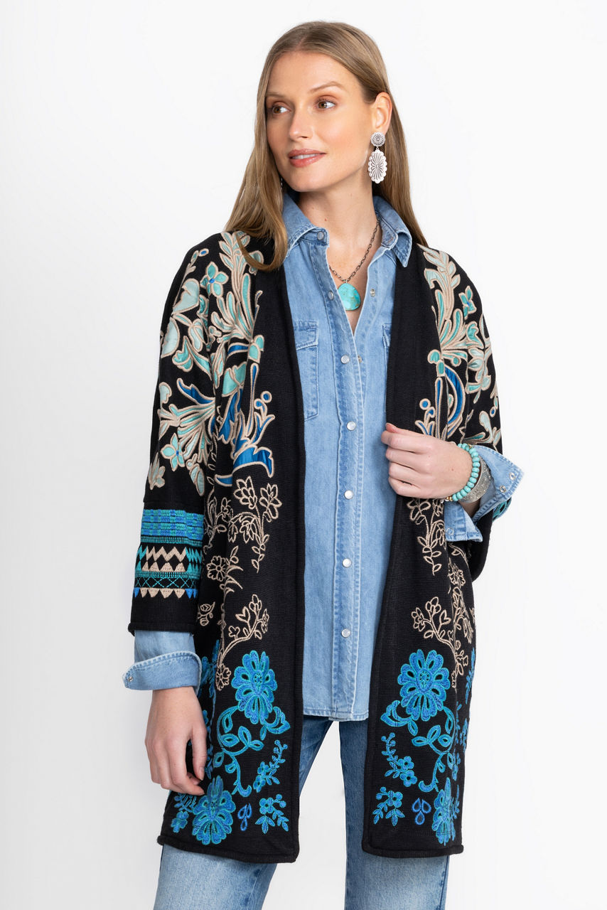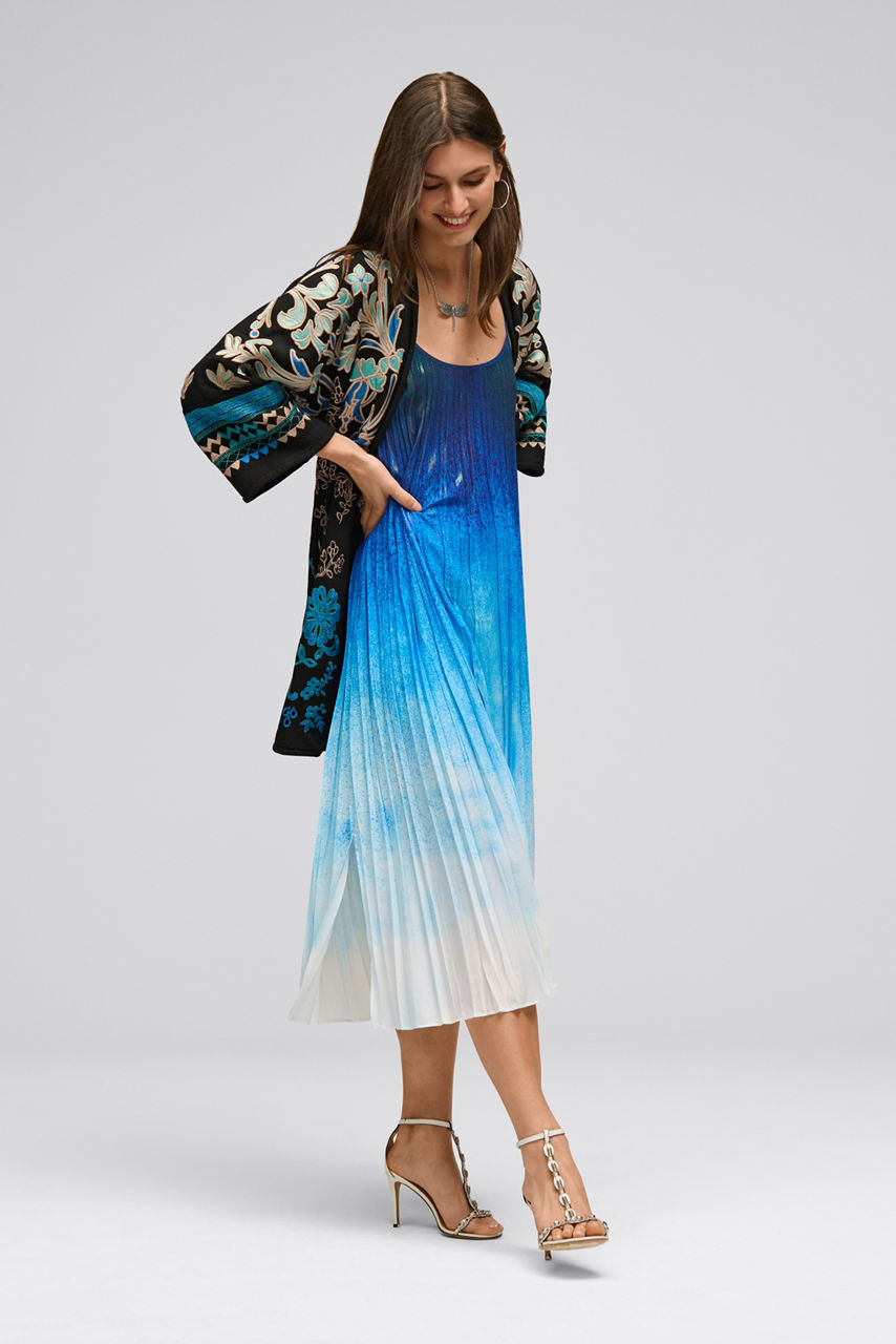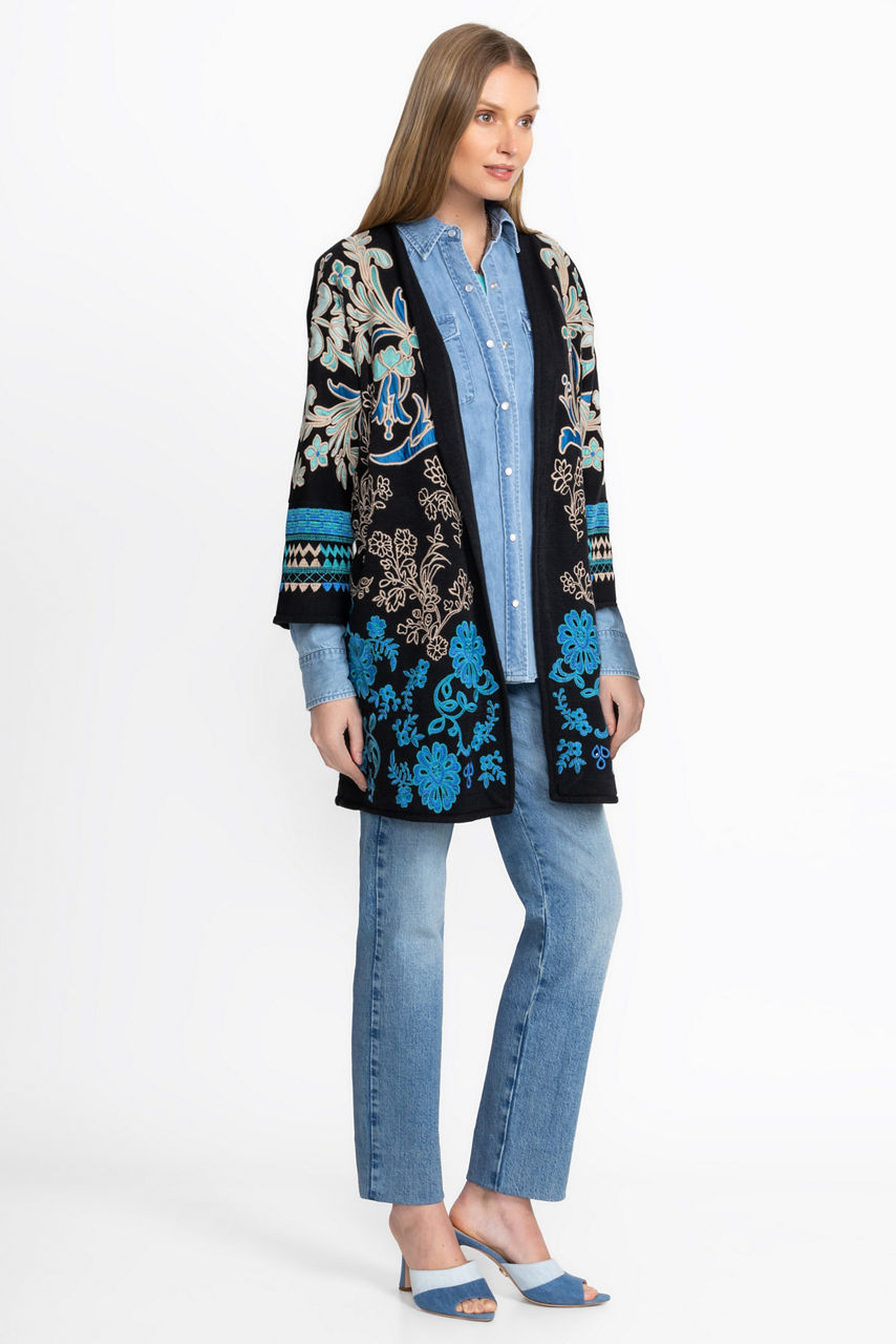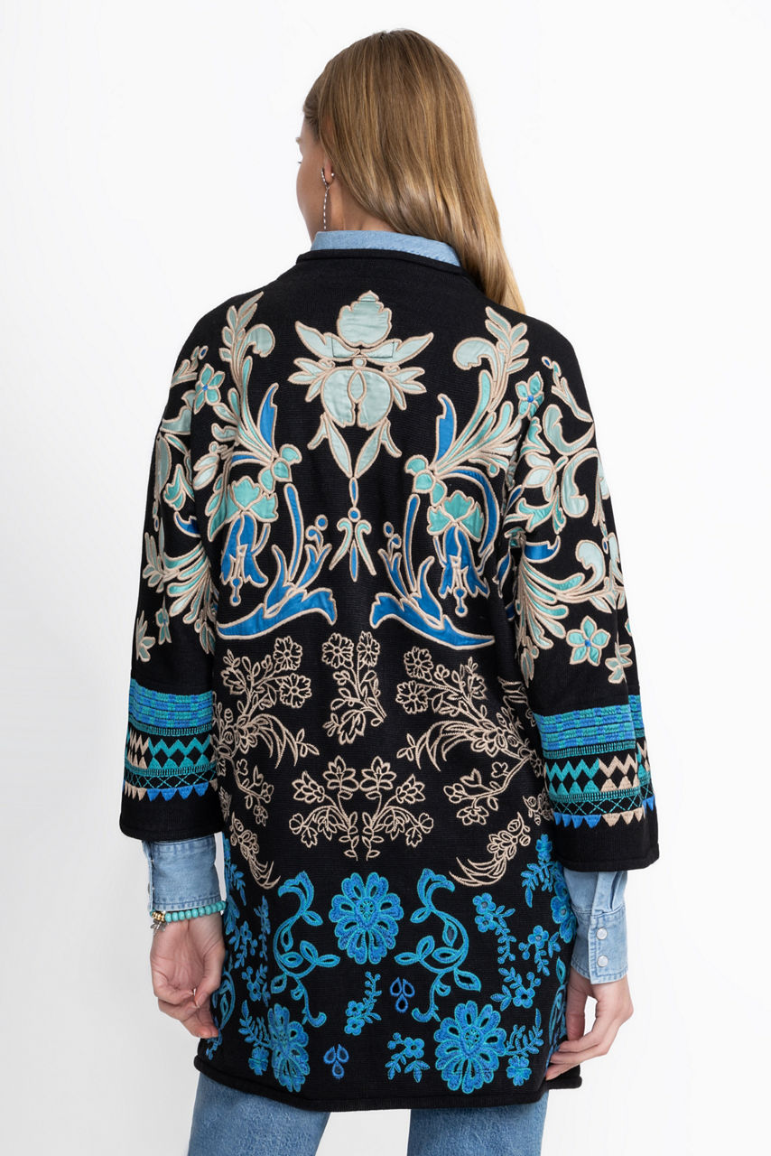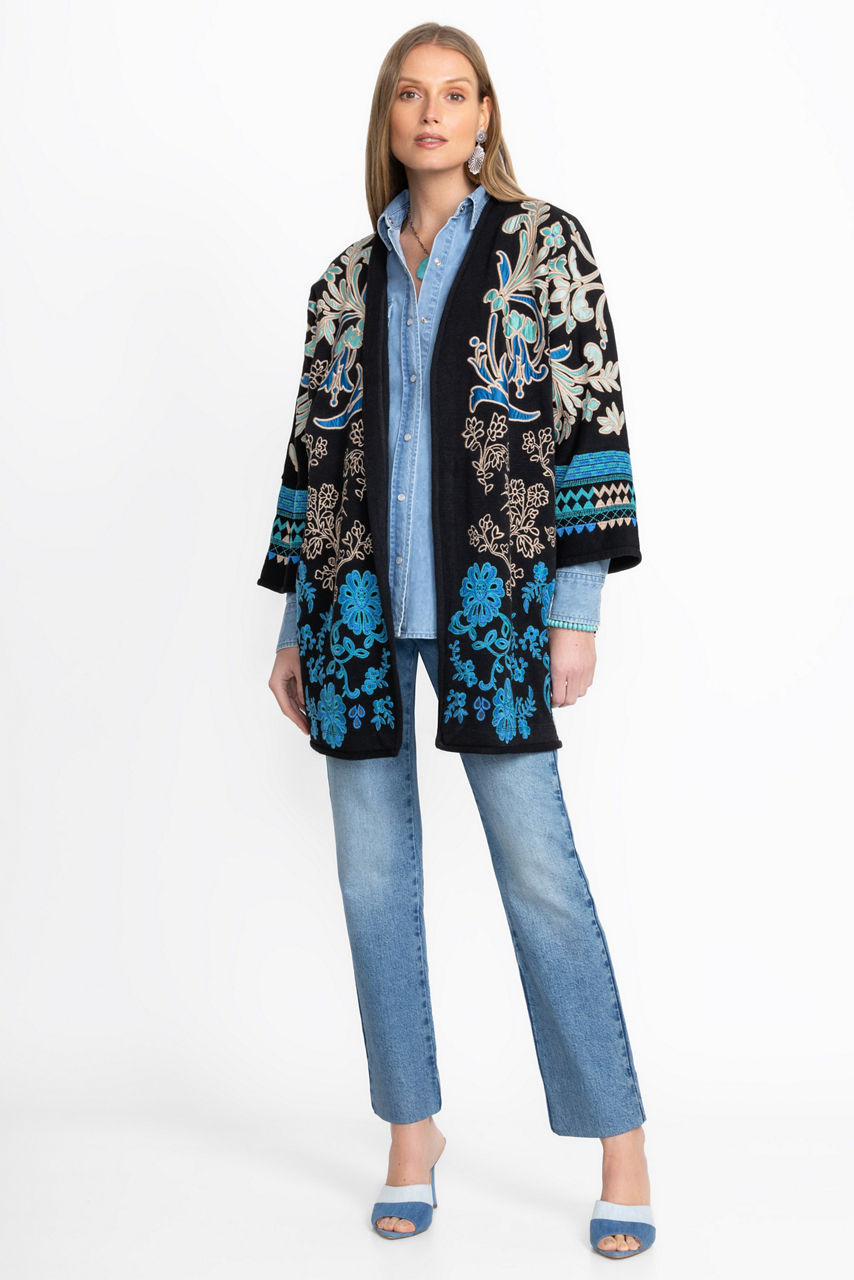 Embellished with brilliant hues of blue, the Biya Kimono adds rich color and texture to any look. Crafted from a lightweight, flowing fabric, this open-front 3/4 Dolman sleeve kimono offers intricate embroidered detailing and is finished with on-seam pockets. Layer over a fitted black dress and pair with black suede boots for a casual evening out with friends.