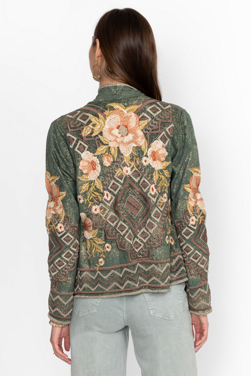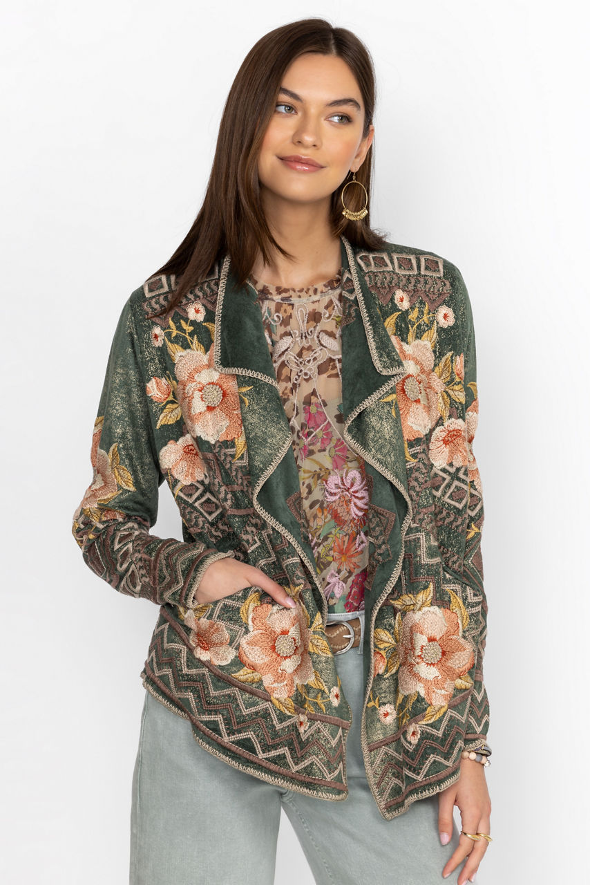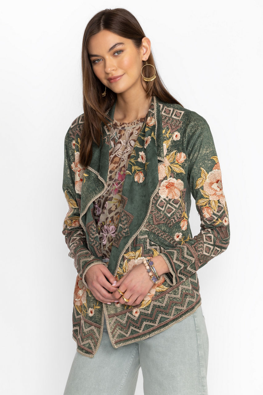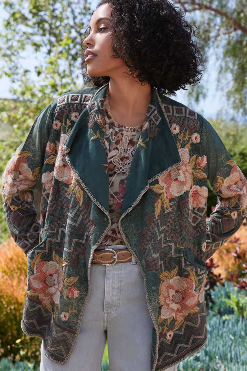 Detailed with blooming florals and geometric pattern, the Bertram Biya Metallic Short Sweater is an eye-catching alternative to a traditional cardigan. Featuring an open front with a contrasting lapel, this intricately embroidered sweater features slip pockets at the waist and is finished with a waterfall hem. Layer over a classic tank and pair with fitted denim for a polished weekend look.
