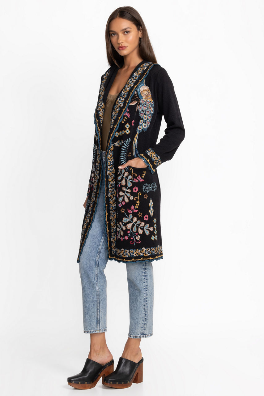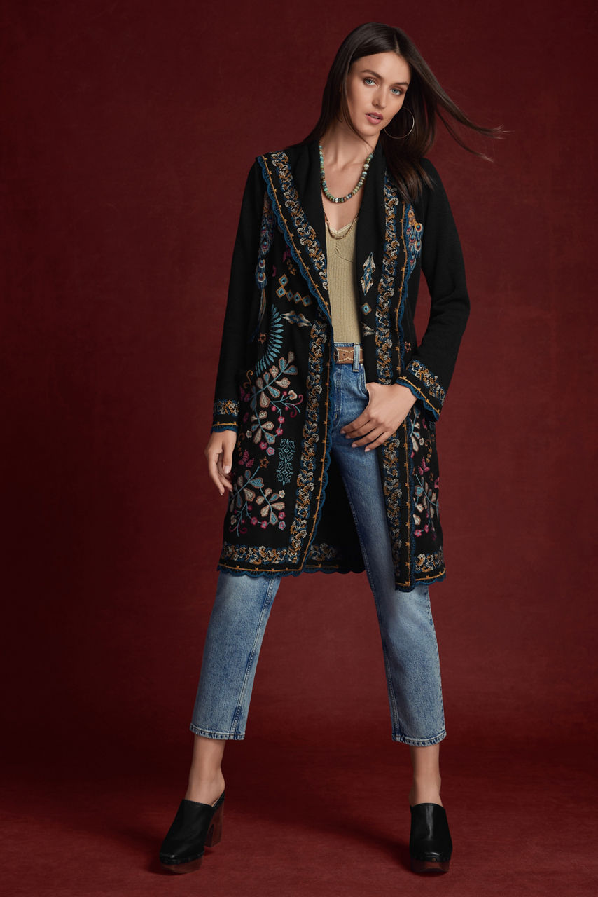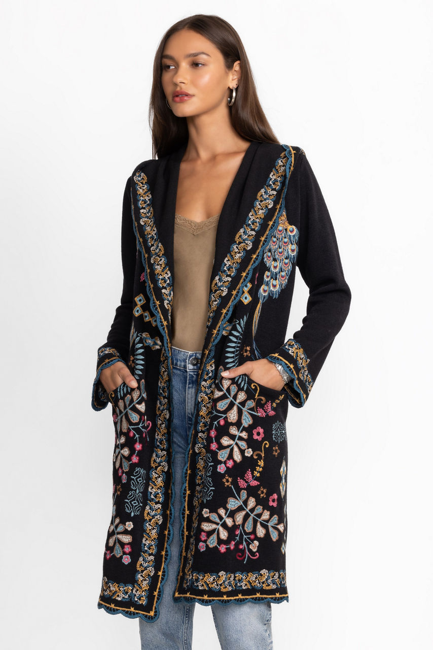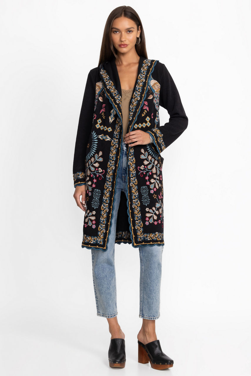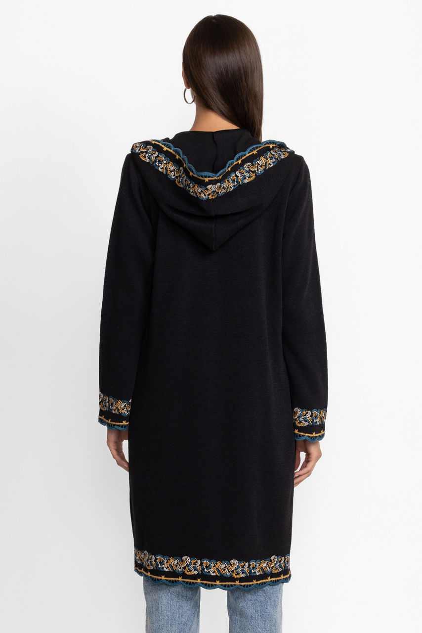 Cozy and comfortable, the Melissa Biya Scalloped Duster is a unique and versatile outer layer. Featuring an open front with an attached hood, this wrap-front duster is adorned with intricate detailing and is finished with slip pockets and decorative scalloped edges. Layer over relaxed-fit jeans and a trendy pullover for an elevated casual look.