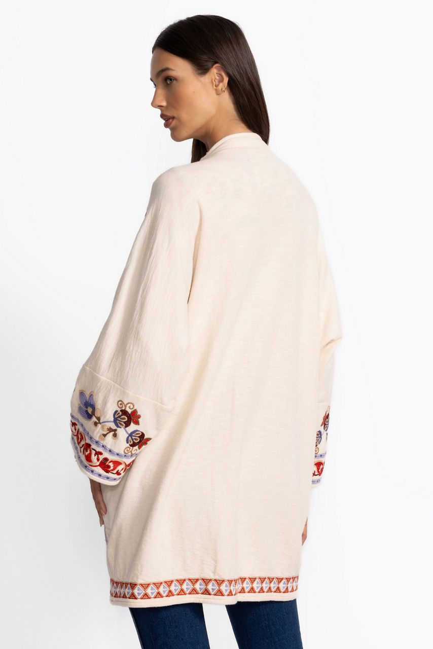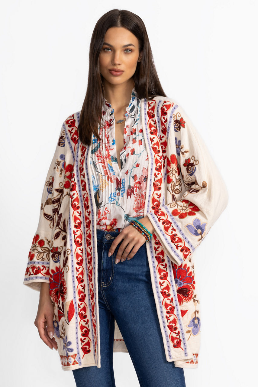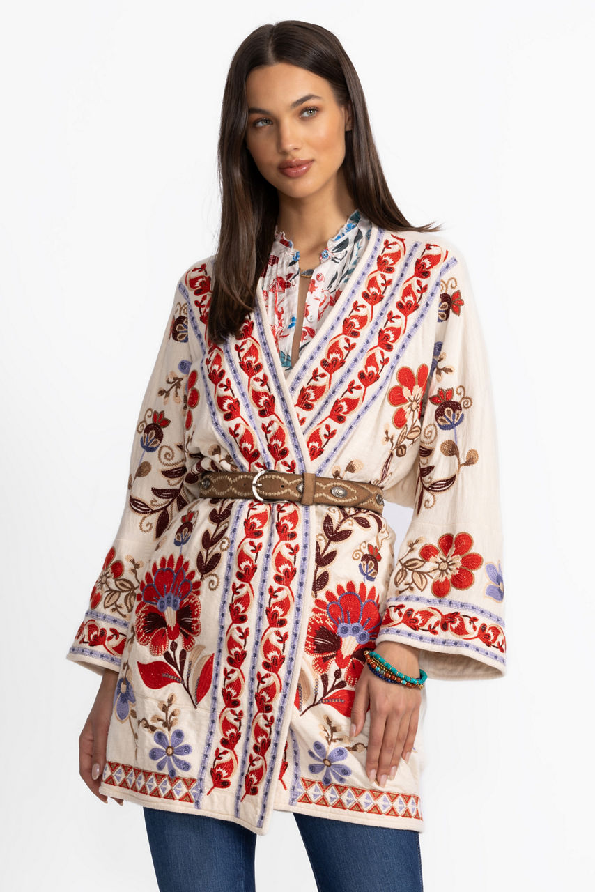 Crafted from 100% breathable cotton, the Biya Short Kimono is adorned with brilliant color and intricate embroidered design. Featuring a relaxed fit and an open front, this stunning kimono is finished with on-seam pockets and flowing 3/4 sleeves. Layer over a mock-neck top and fitted pants and pair with bold jewelry for a polished casual look.