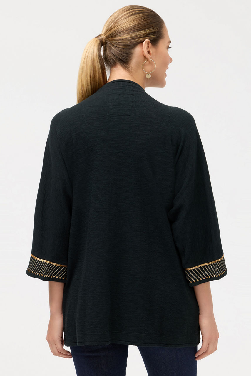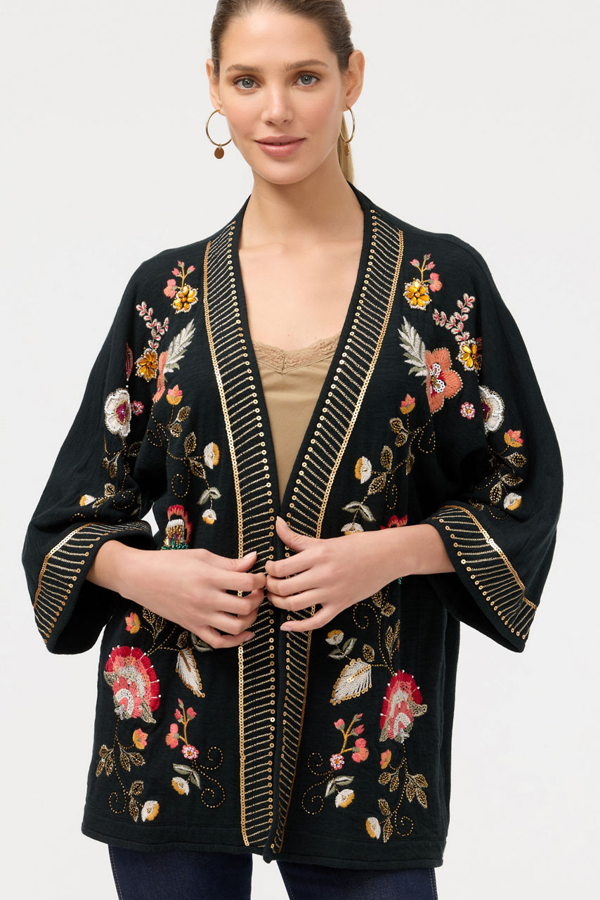 Crafted from 100% rich cotton, the Biya Short Kimono is adorned with intricate placement embroidery featuring bold floral blooms. Designed with an open front and a detailed contrasting trim, this kimono offers 3/4 sleeves and slip pockets. Layer over a silk cami paired with skinny jeans for a polished casual ensemble.