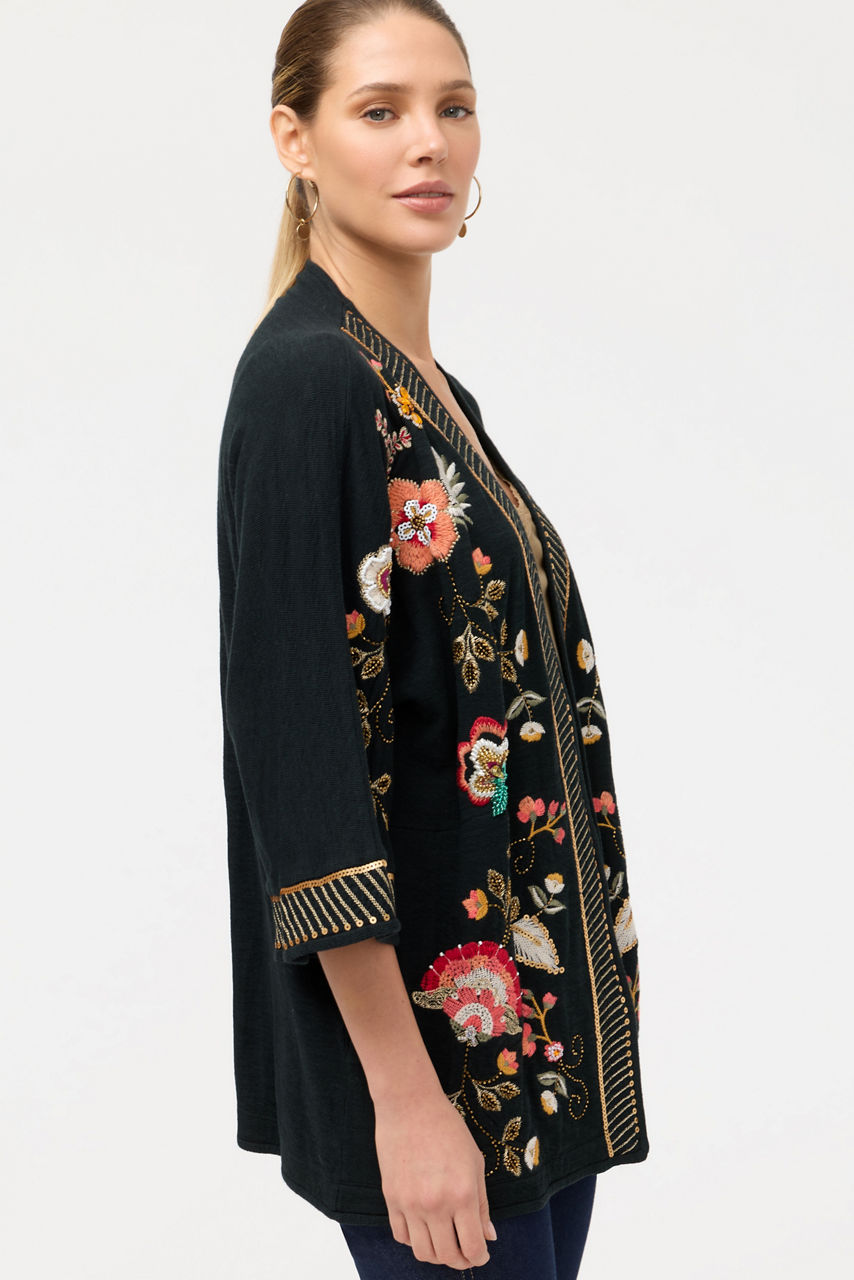 Crafted from 100% rich cotton, the Biya Short Kimono is adorned with intricate placement embroidery featuring bold floral blooms. Designed with an open front and a detailed contrasting trim, this kimono offers 3/4 sleeves and slip pockets. Layer over a silk cami paired with skinny jeans for a polished casual ensemble.