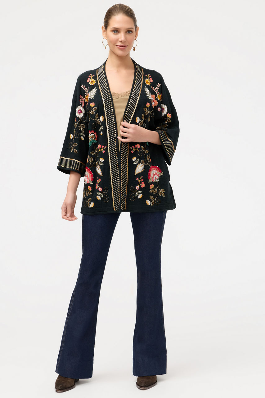 Crafted from 100% rich cotton, the Biya Short Kimono is adorned with intricate placement embroidery featuring bold floral blooms. Designed with an open front and a detailed contrasting trim, this kimono offers 3/4 sleeves and slip pockets. Layer over a silk cami paired with skinny jeans for a polished casual ensemble.