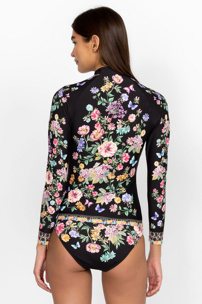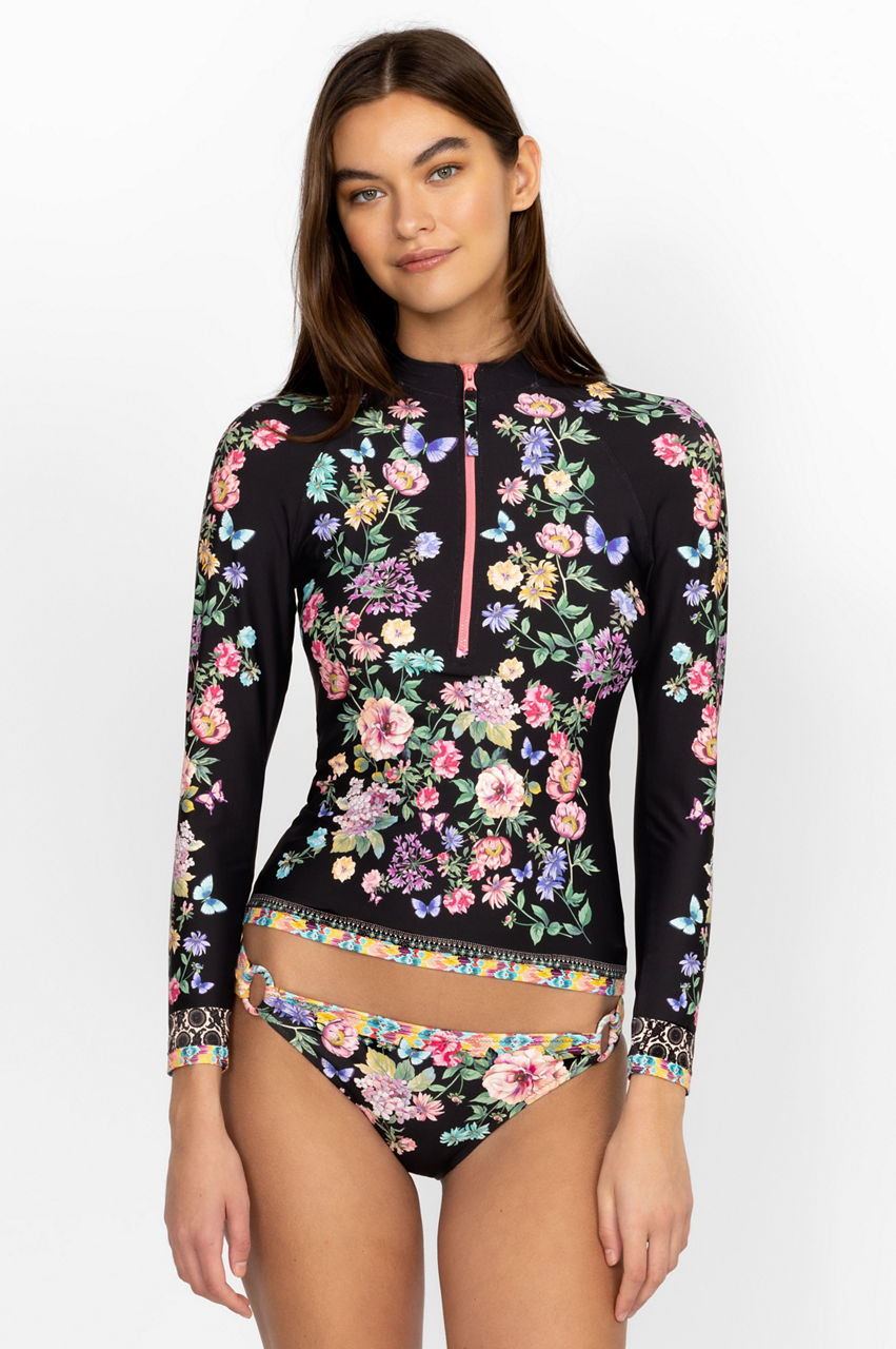 An elegant take on a practical style, the Surf Shirt is the perfect pick for a range of water-based activities.This shirt is made from a stretchy quick-drying material and features a collar with a zip front, long sleeves, and flourishing florals in soft yet striking tones. Pair with bikini bottoms for a fashion-forward take on activewear.
