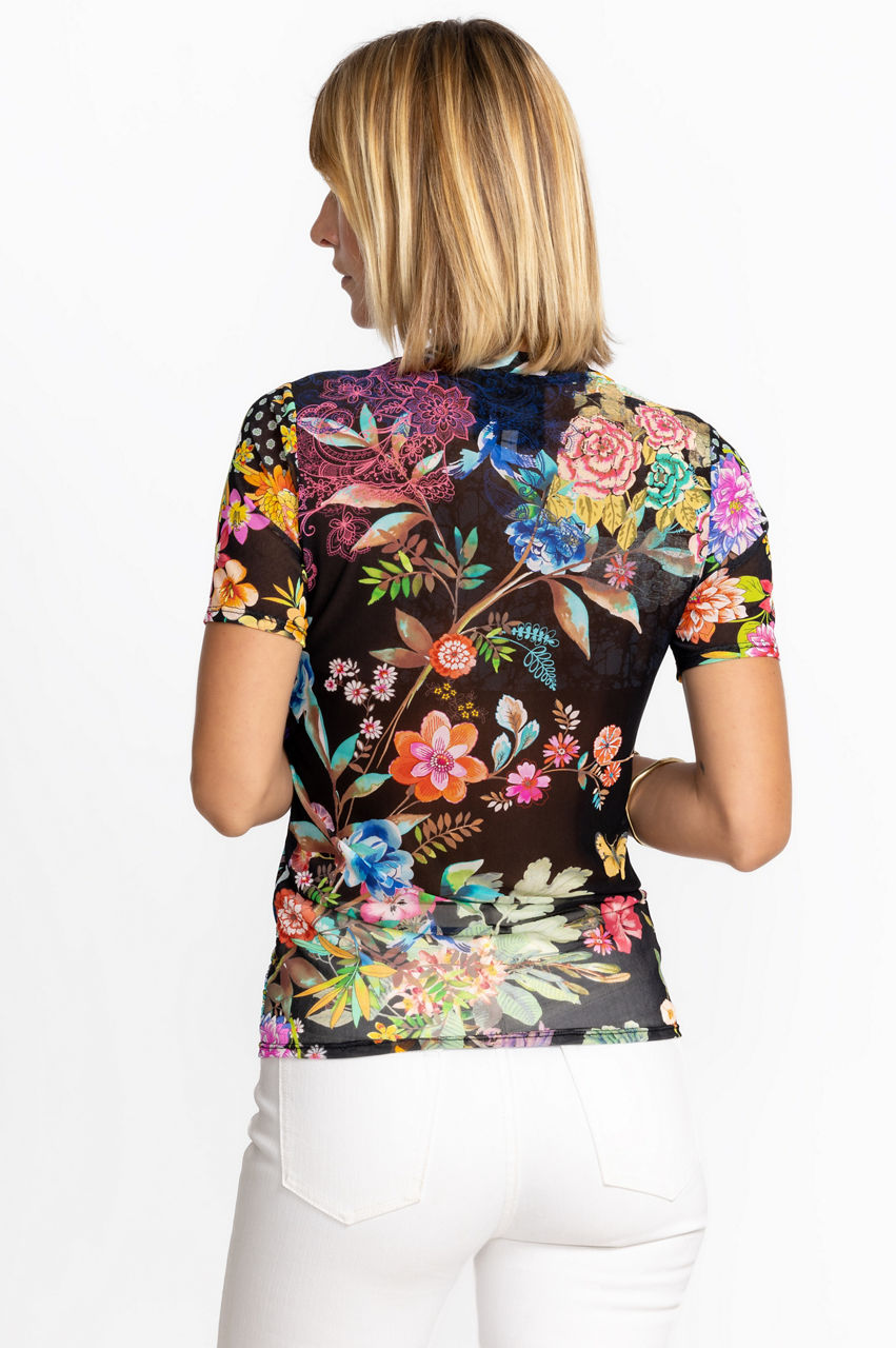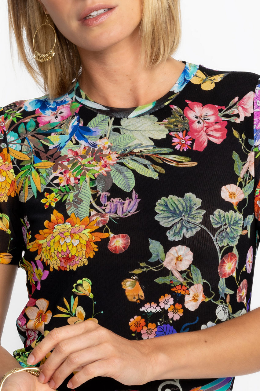 Fanciful birds of flight and picturesque floral bouquets combine on the Black Dreamer Mesh Tee. This luxe top's dreamy print makes it a head-turning addition to your wardrobe. Wear with a cami top or layered over a bathing suit with white linen pants for a light, airy look.