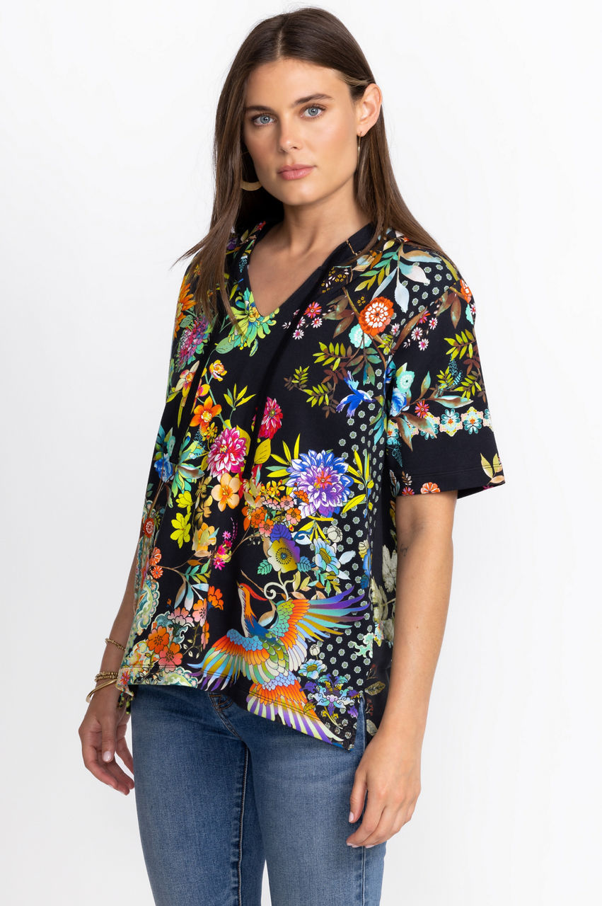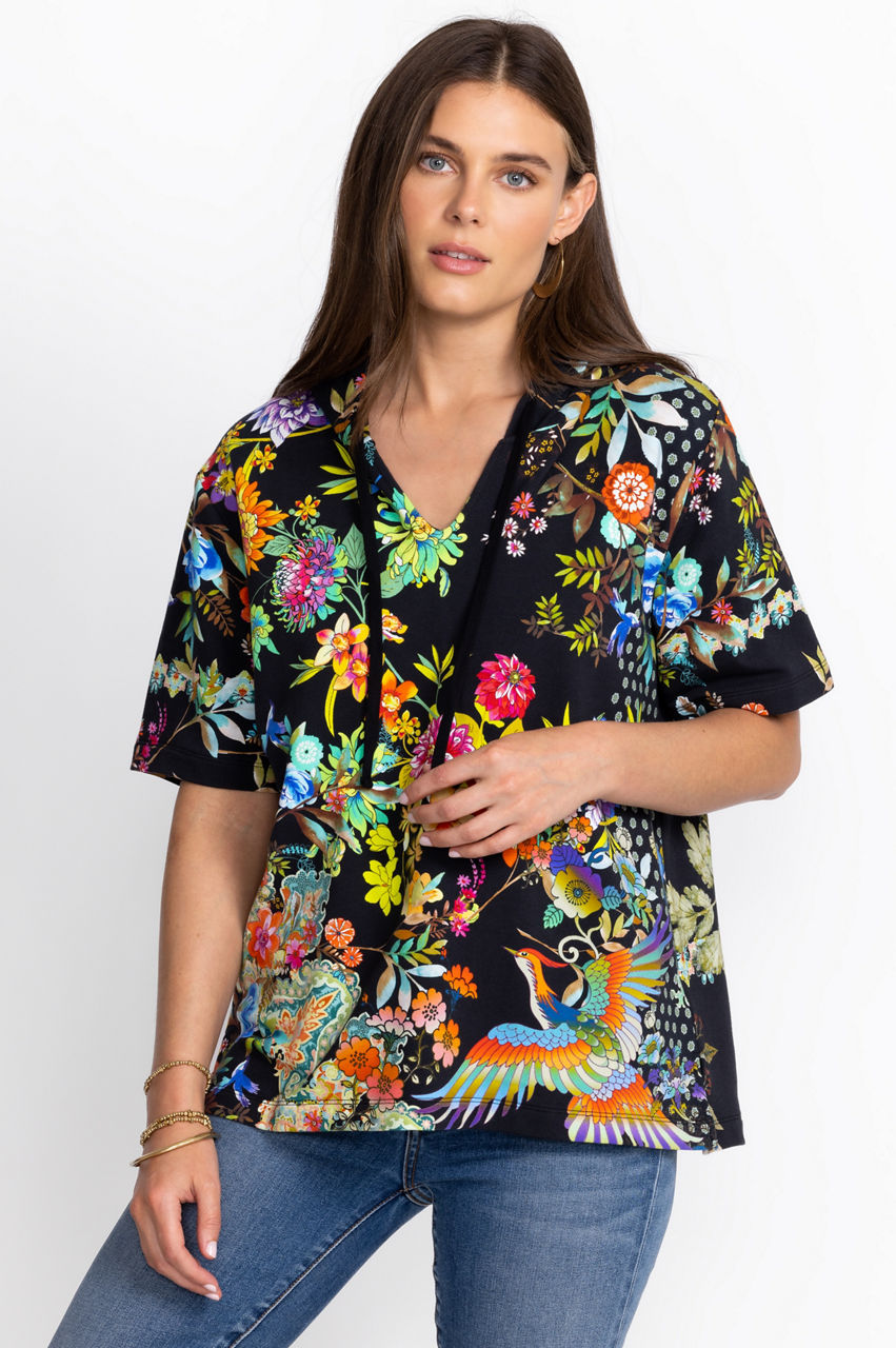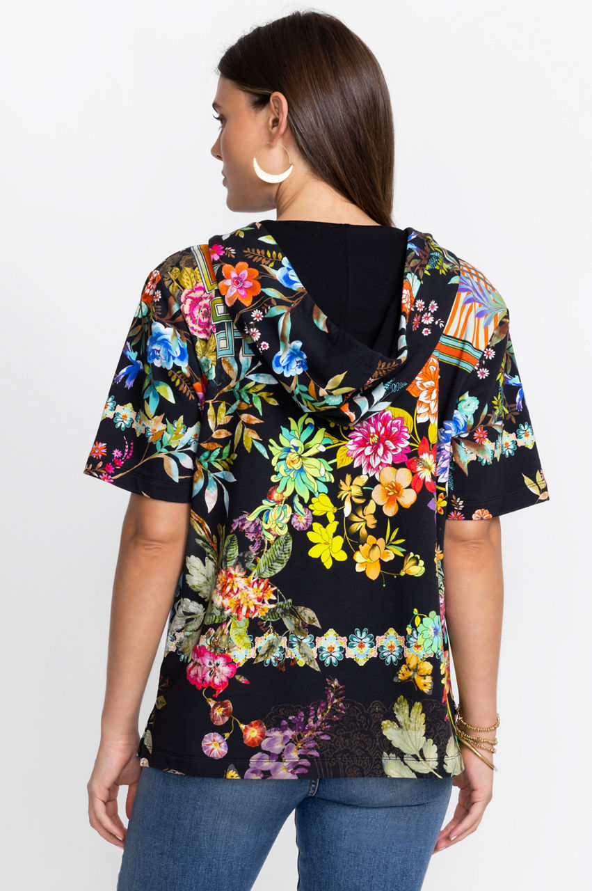 Adorned with vibrant color on a rich background, the Black Dreamer Notched Pullover Hoodie gives sporty attire a feminine finish. Perfect for cool evenings at the beach, this luxe pullover is the perfect light layer for windy weather. Wear over a swimsuit with breezy pants for a chic seaside ensemble.