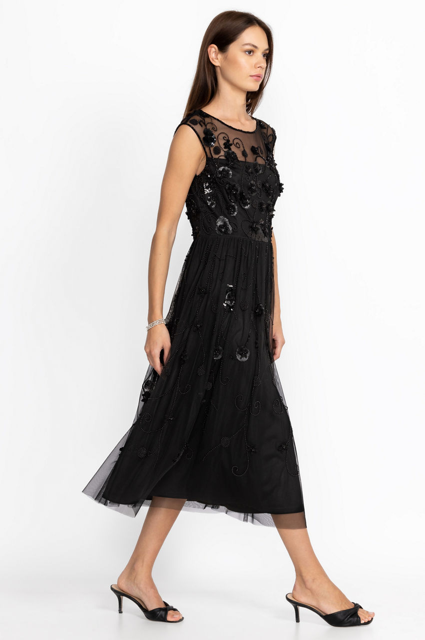 A classic black dress featuring exquisite detail, the Black Flower Beaded Maxi Dress makes every occasion special. Featuring a breathtaking sheer boatneck and capped sleeve mesh overlay with intricately beaded floral bouquets, this dress harkens back to an era steeped in romance. Pair with black pumps and delicate sparkling jewelry for a special night out.