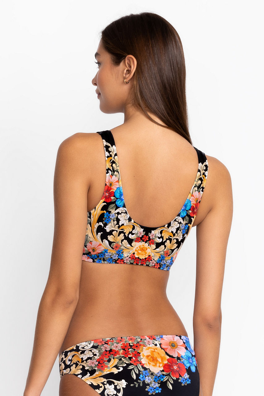 Bold and detailed, the Black Royal Ruched Bikini Top is a contemporary take on a classic cut. Crafted from a quick-drying material with added stretch for comfort, this one piece is fully lined with removable cups, a flattering V-neck, and striking blooms in rich tones. Pair with matching bottoms, sunglasses, and a hat for a chic poolside outfit.