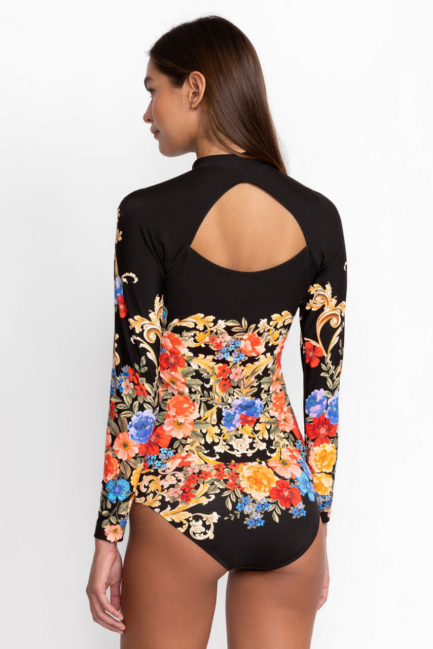 Our Black Royal Cut Out Back Surf Shirt is the perfect piece for any sporty swim ensemble — whether you’re lounging on the beach or out catching waves. The on-trend floral print and colorway pairs well with your favorite bottoms — from the matching hipsters to sleek and neutral bikini bottoms.