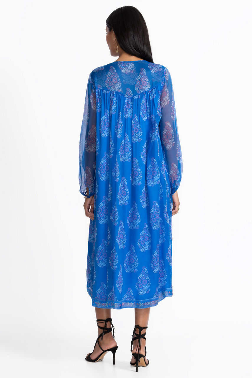 Crafted from 100% luxurious silk, the Blaire Midi Dress offers a relaxed silhouette paired with unmistakably elevated style. Featuring smocked detailing at the shoulders, this split V-neck dress is embellished with a vibrant pattern against a stunning blue backdrop. Pair with classic kitten heels and delicate jewelry for an evening out.