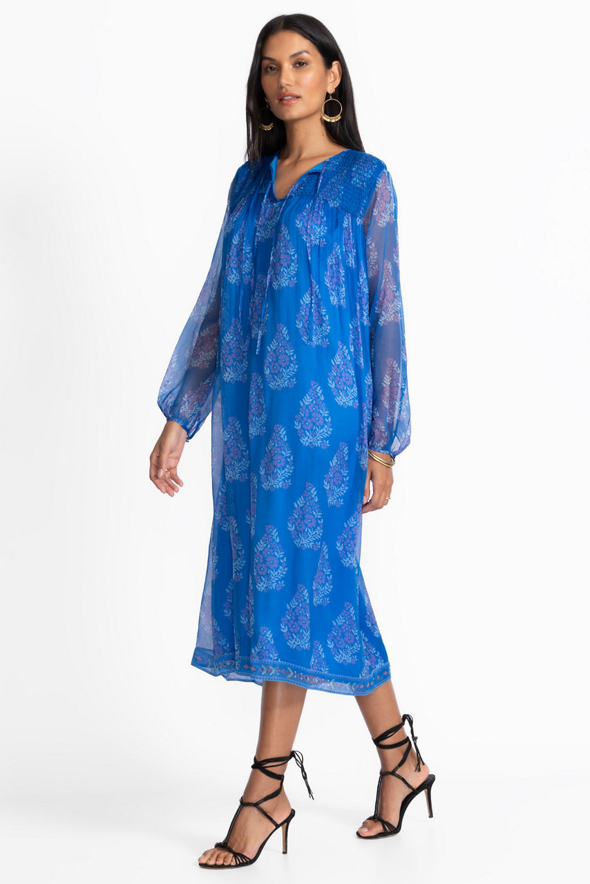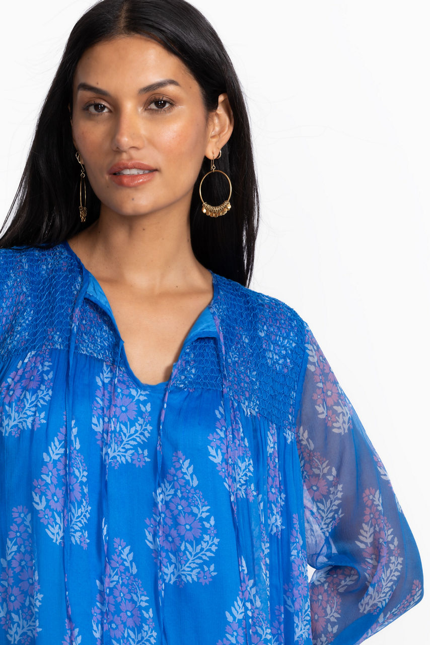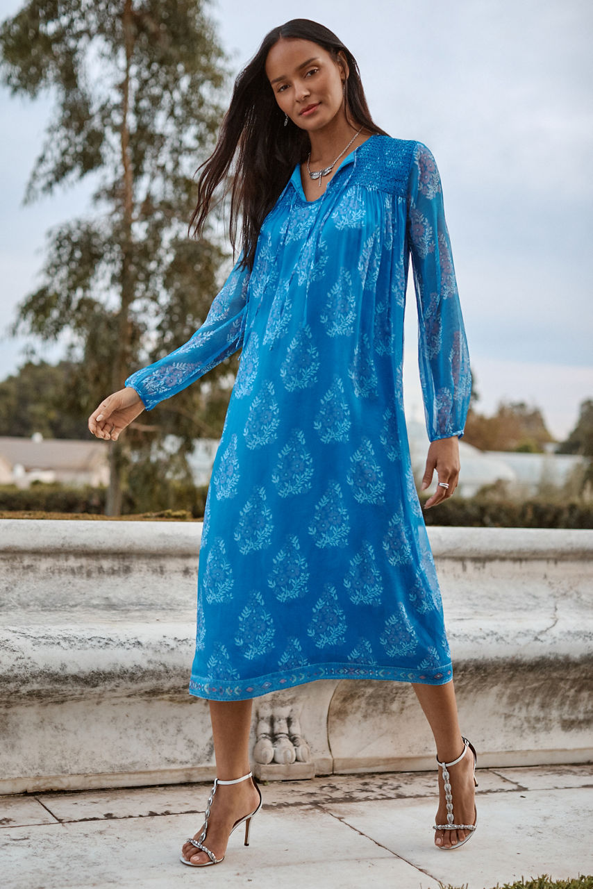Crafted from 100% luxurious silk, the Blaire Midi Dress offers a relaxed silhouette paired with unmistakably elevated style. Featuring smocked detailing at the shoulders, this split V-neck dress is embellished with a vibrant pattern against a stunning blue backdrop. Pair with classic kitten heels and delicate jewelry for an evening out.