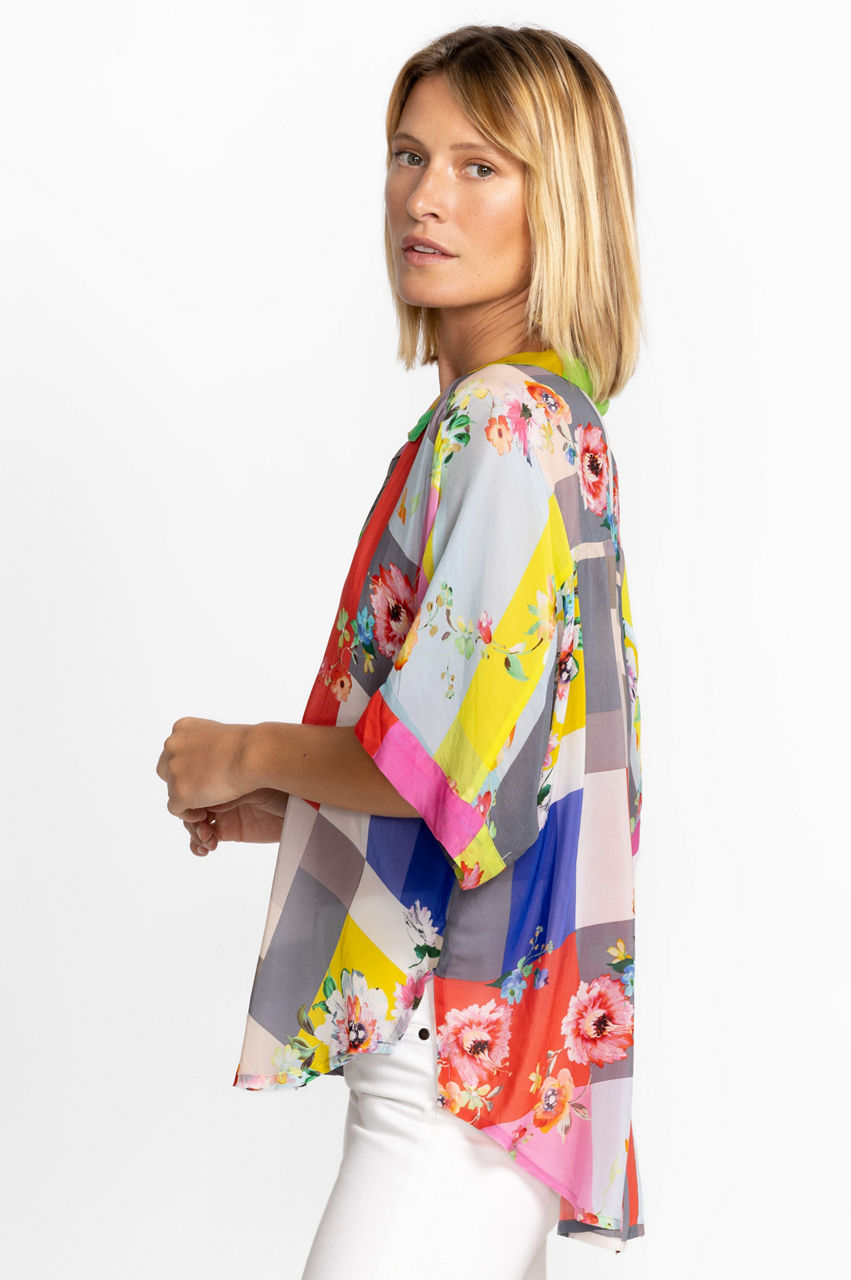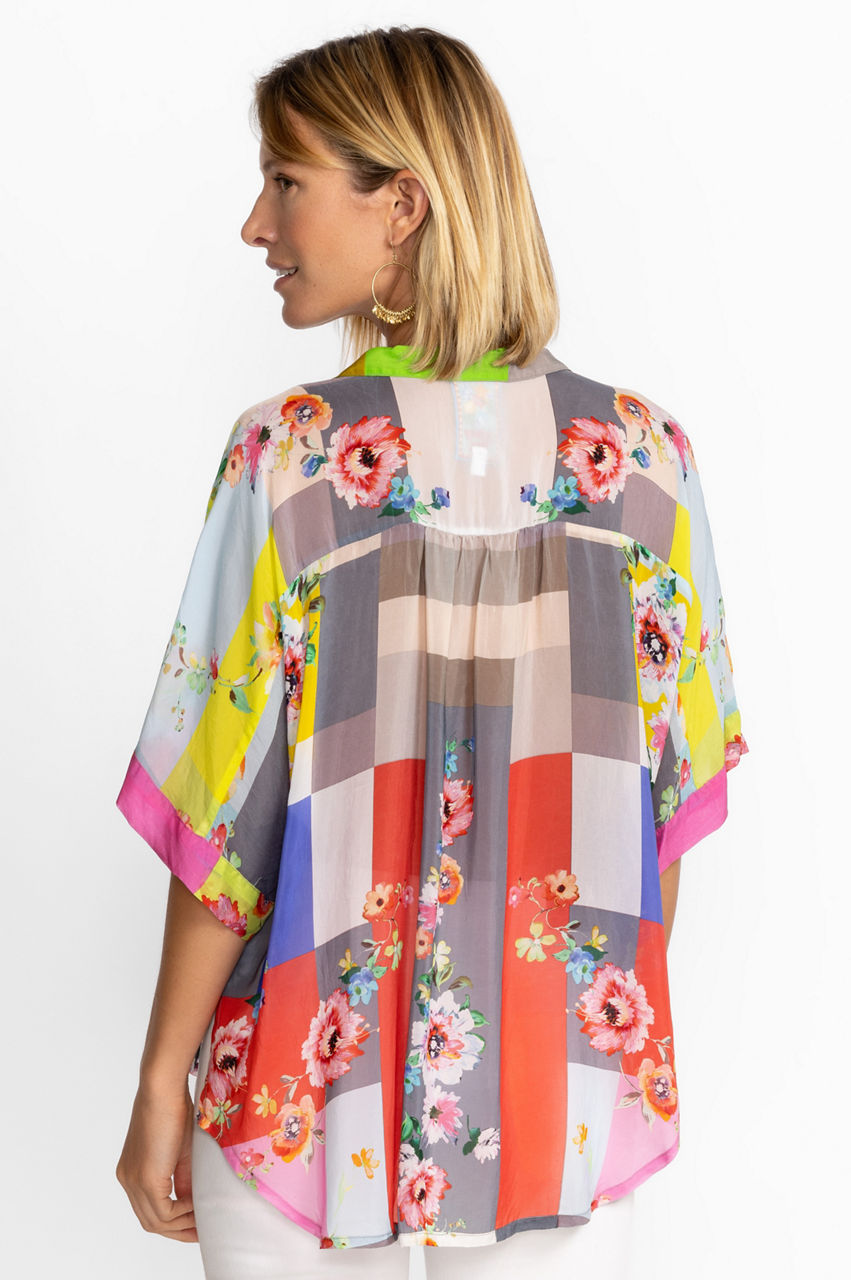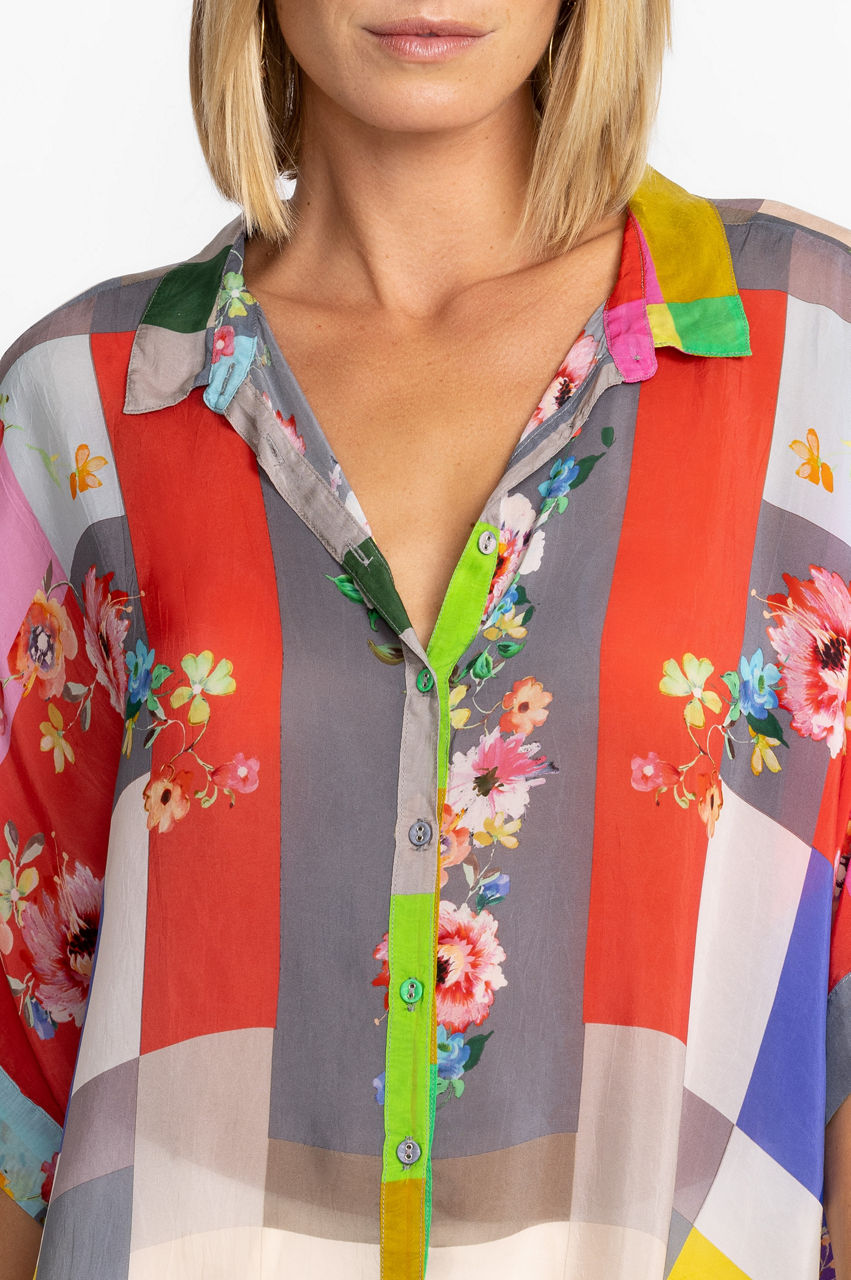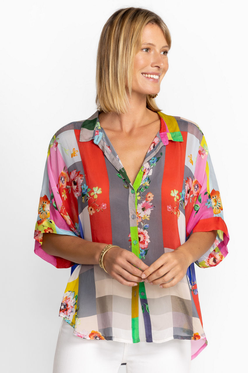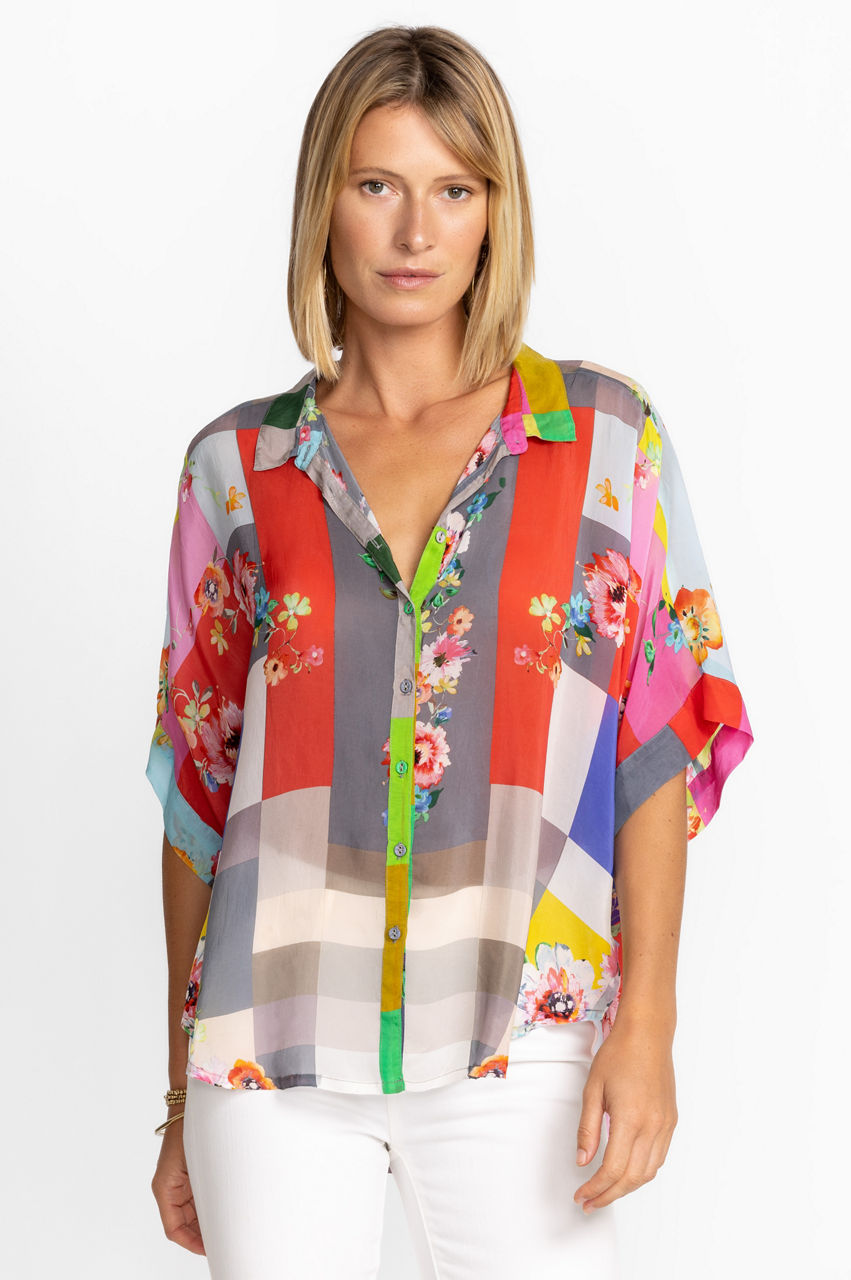 Contrasting yet complementary colors and patterns bring the Block Lynn Shirt to life. This shirt is made from a lightweight fabric and boasts a collar, short sleeves, a front button closure, and a bold multicolored block print with a romantic floral overlay. Keep this shirt as the main focus by pairing with plain separates.