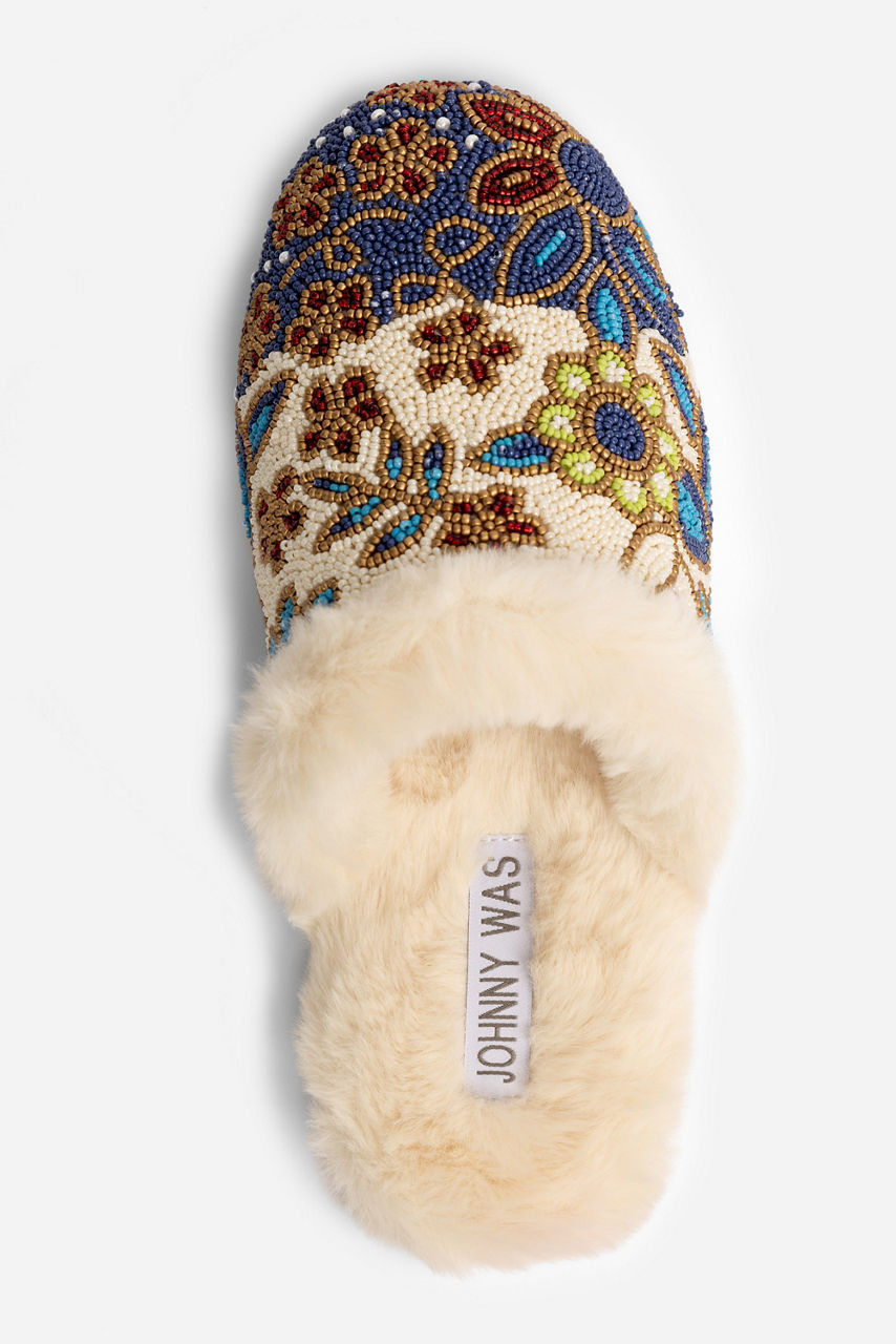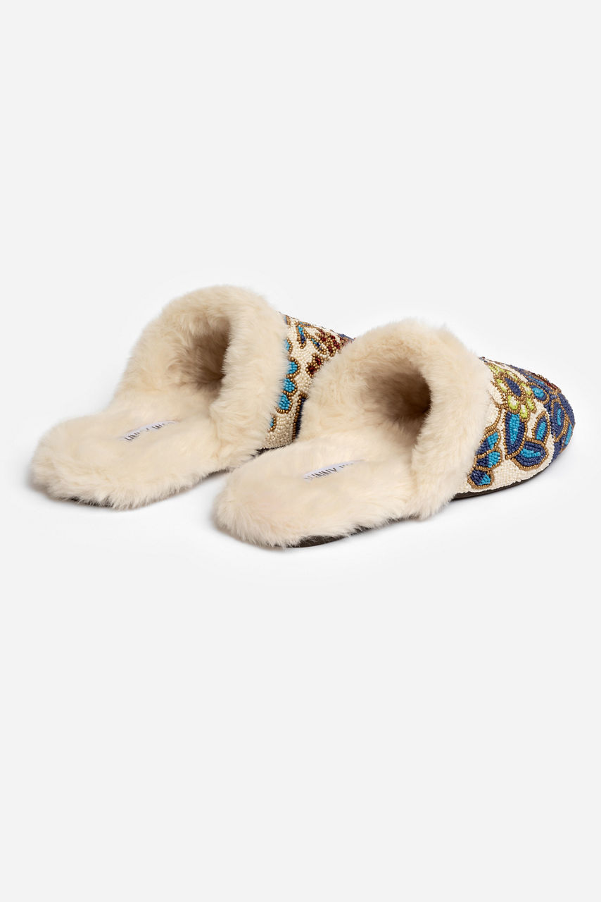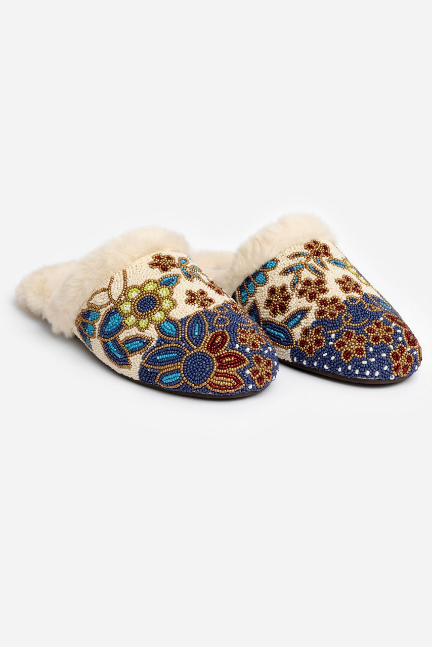 Carefully crafted for cozy comfort, the Bloom Beaded Slippers are elevated loungewear. Lined with ivory faux fur, these unique slippers are finished with detailed floral beading at the toe for a bold accent. Pair with soft pajamas and a silk robe for an enjoyable evening in.