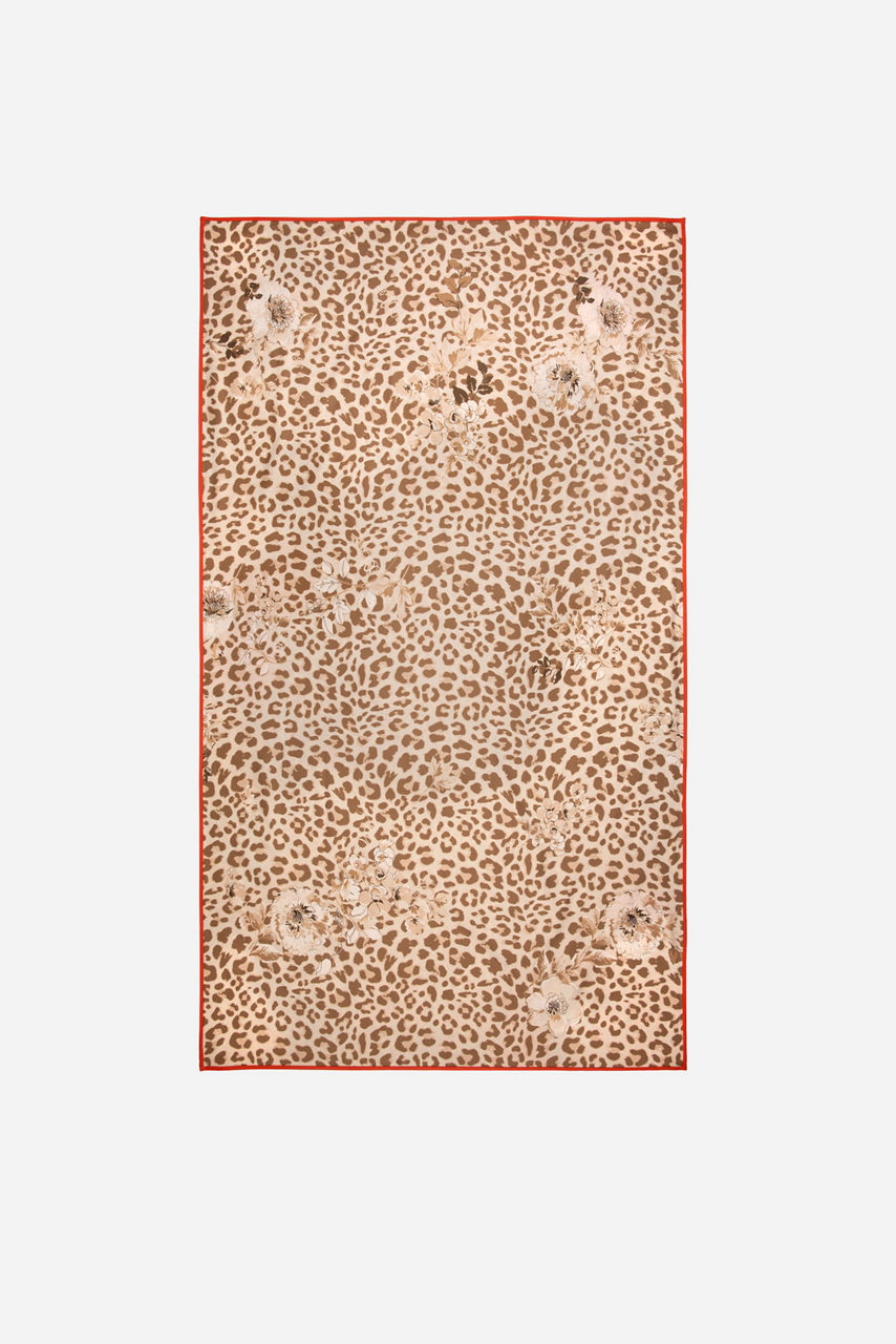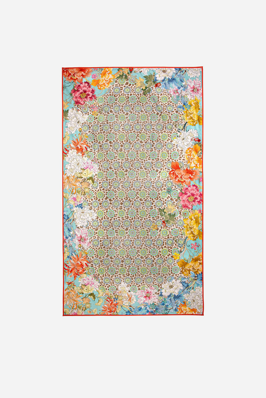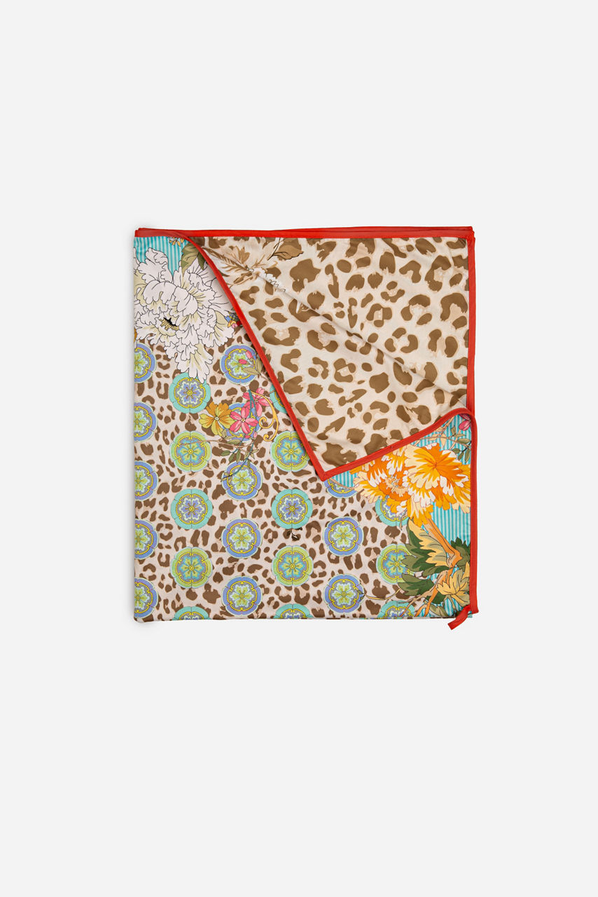 A harmonious clash of color and print, the Blue Stripe Leopard Beach Towel is a key staple for sun-filled destinations and sunbathing by the pool. Designed from a soft quick-drying fabric, this towel is detailed with a multicolored vintage-inspired floral and leopard print and a brown and beige leopard print on the reverse side, complete with an additional white flower pattern.