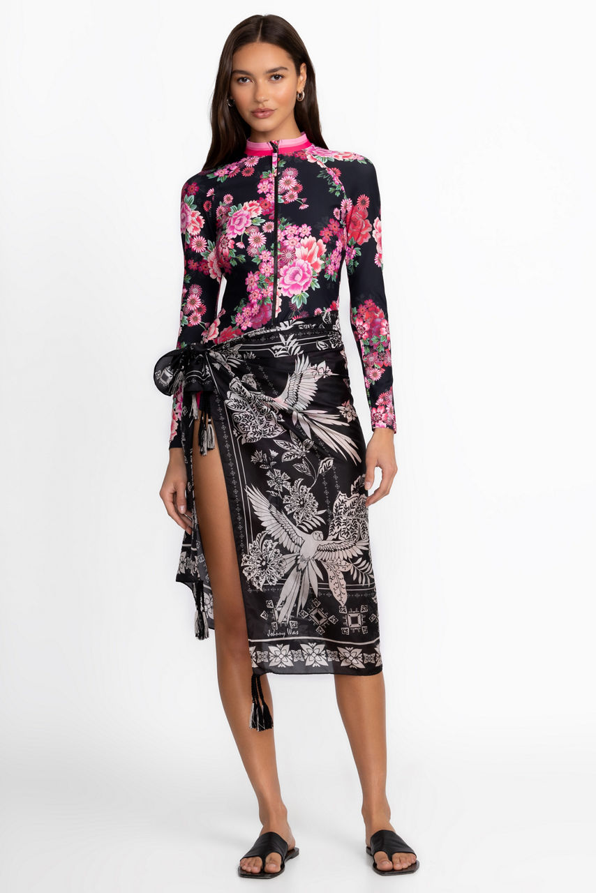Intricately embellished with vibrant florals on a rich black backdrop, the Blum Long Sleeve Surf Shirt adds a layer of protection against the elements. Featuring a high rounded neckline with a zip-front, this fitted surf top is finished with long sleeves. Pair with the Blum Hipster Bottoms for a fresh surf ensemble.