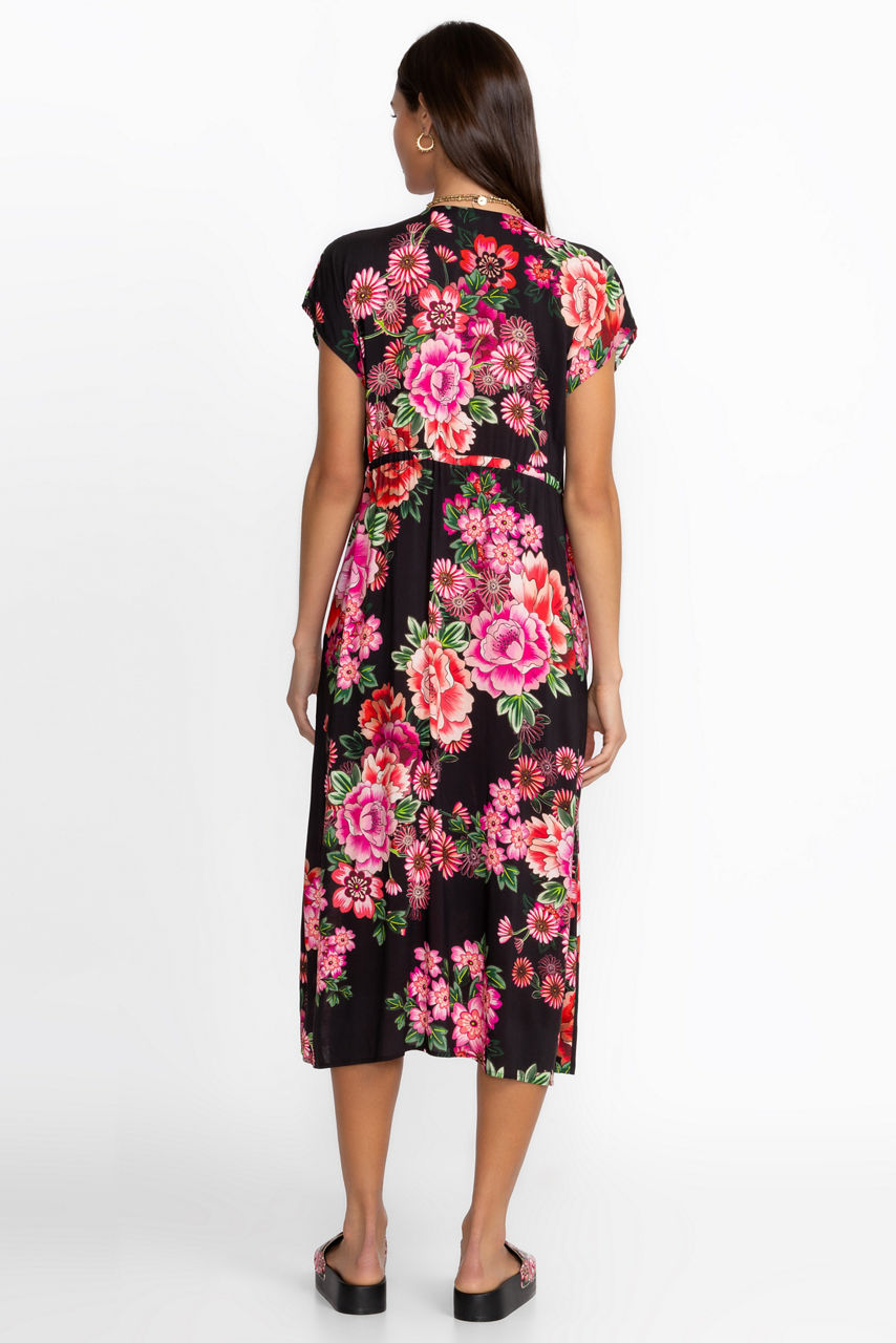 Beautifully crafted to create a stunning silhouette, the V-Neck Kaftan is adorned with bold pink blooms on an inky black backdrop. Featuring a deep V-neckline and relaxed Dolman sleeves, this stunning kaftan offers a drawstring at the waist for a customizable fit and is finished with pockets at the side seams. Layer over the Blum Ruched One Piece for a perfectly coordinated poolside ensemble.