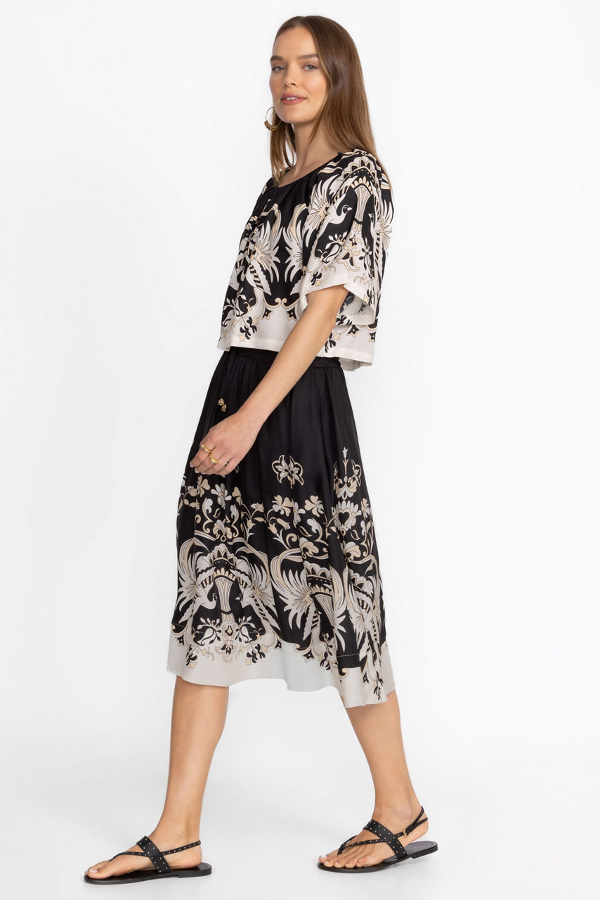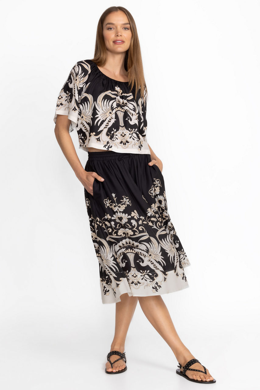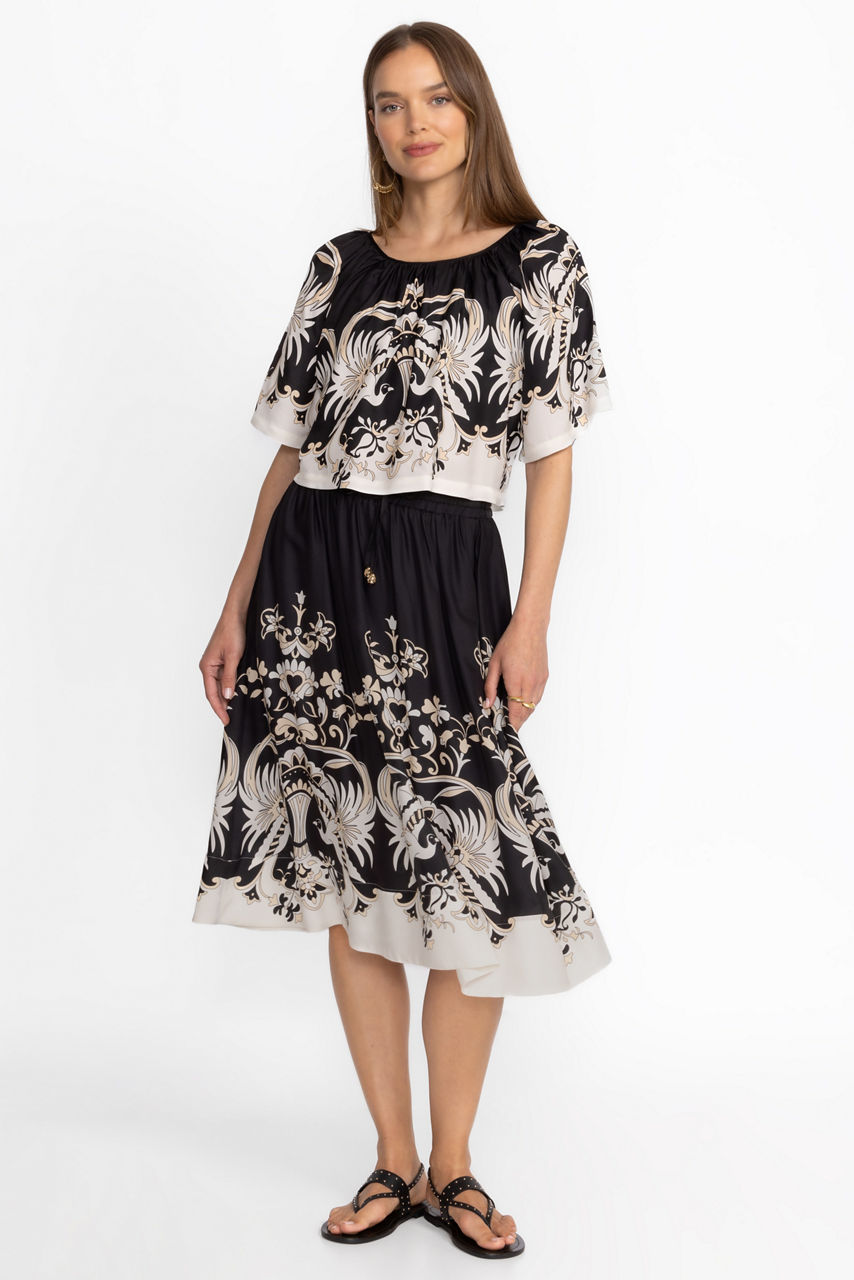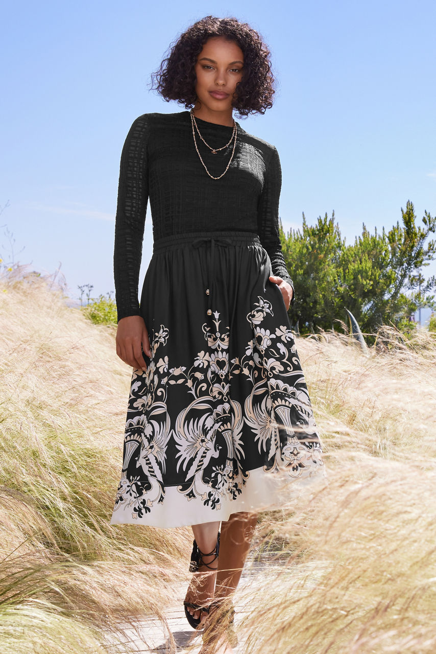 Crafted from a unique silk blend, the Blythe A-Line Midi Skirt offers a bold contrasting pattern. Featuring an elastic waist with a drawstring for a customizable fit, this midi length A-line skirt is embellished with a unique and visually stunning pattern. Pair with a white blouse and strappy sandals for a dinner date by the beach.