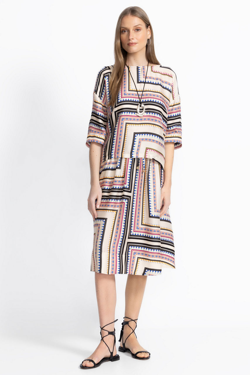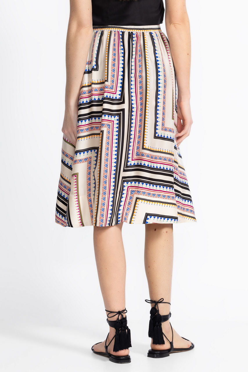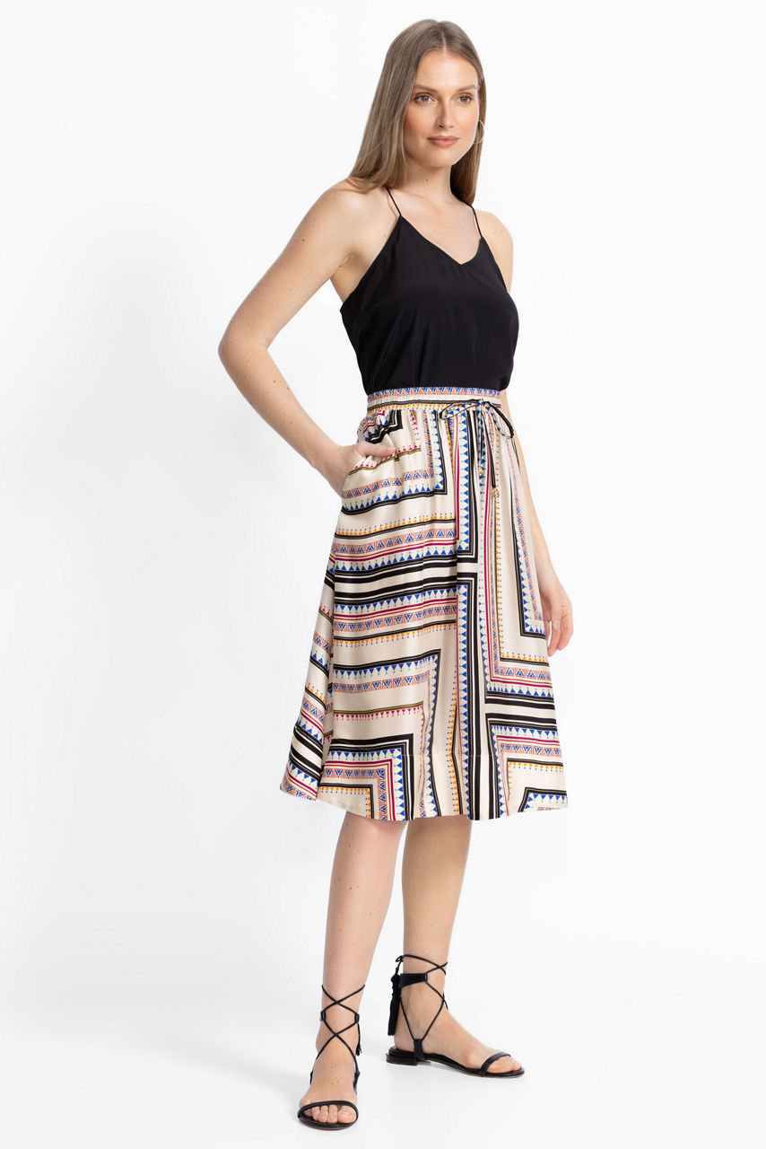 Thoughtfully crafted from a unique silk blend, the Blythe A-line Midi Skirt is embellished with a rich angular pattern that easily draws the eye. Designed with an elastic waist with a drawstring for a customizable fit, this A-line skirt features practical slip pockets at the hip. Pair with a solid coordinating pullover and wedge heels for a casual night out.