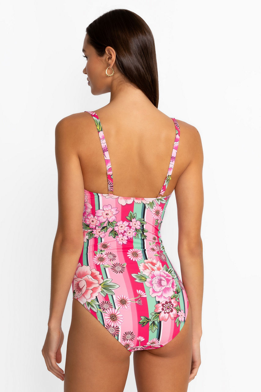 Flawless and feminine, the Bocardi Ruched One Piece is embellished with rich florals and bold stripes. Featuring a square neckline and adjustable shoulder straps, this vibrant swimsuit is finished with contrasting panels at the sides and a ruched center panel for an enhanced silhouette. Pair with V-Neck Kaftan and slides for a posh ensemble that easily goes from brunch to poolside.