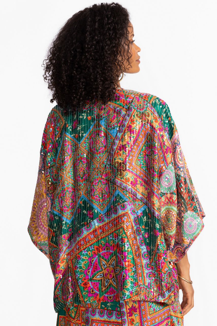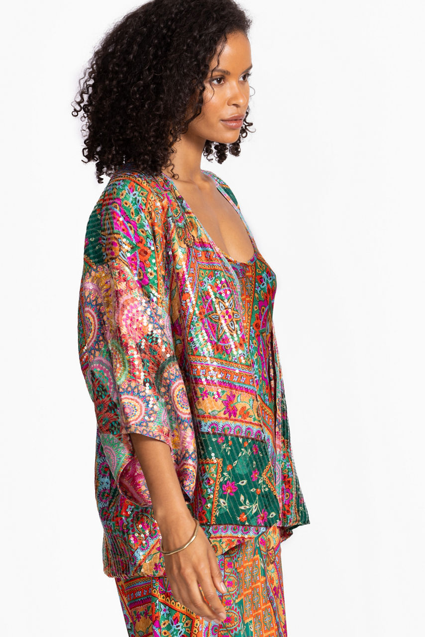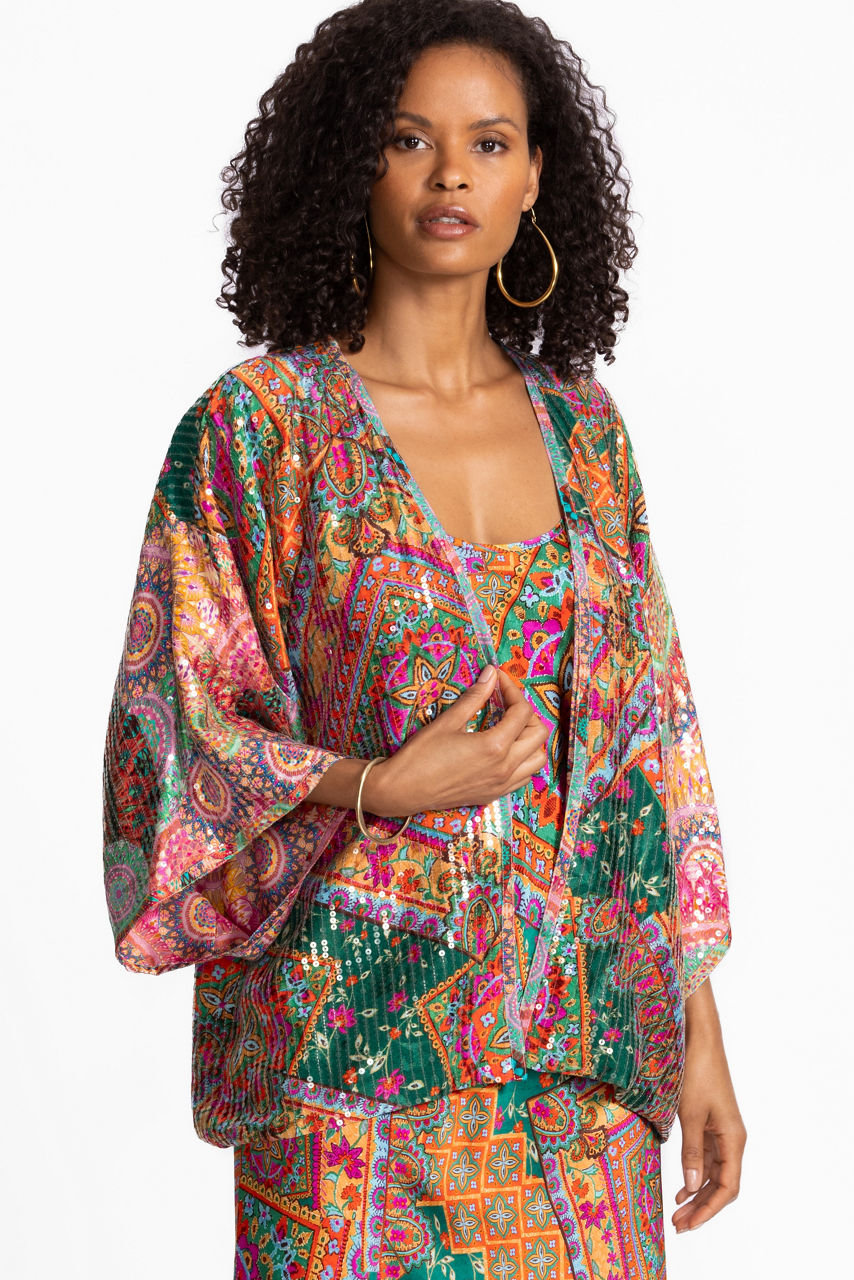 Embellished with a bold kaleidoscope of color and pattern, the Bomi Sequin Kimono is equal parts stylish and fun. Featuring an open front and 3/4 sleeves, this lined kimono is crafted from a lightweight flowing fabric. Layer over a fitted dress and pair with coordinating heels for a vibrant evening look.