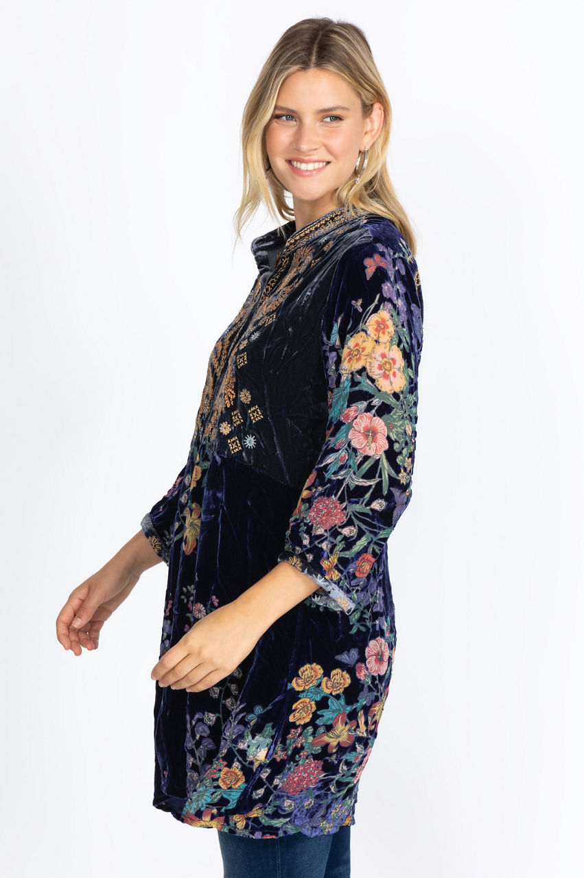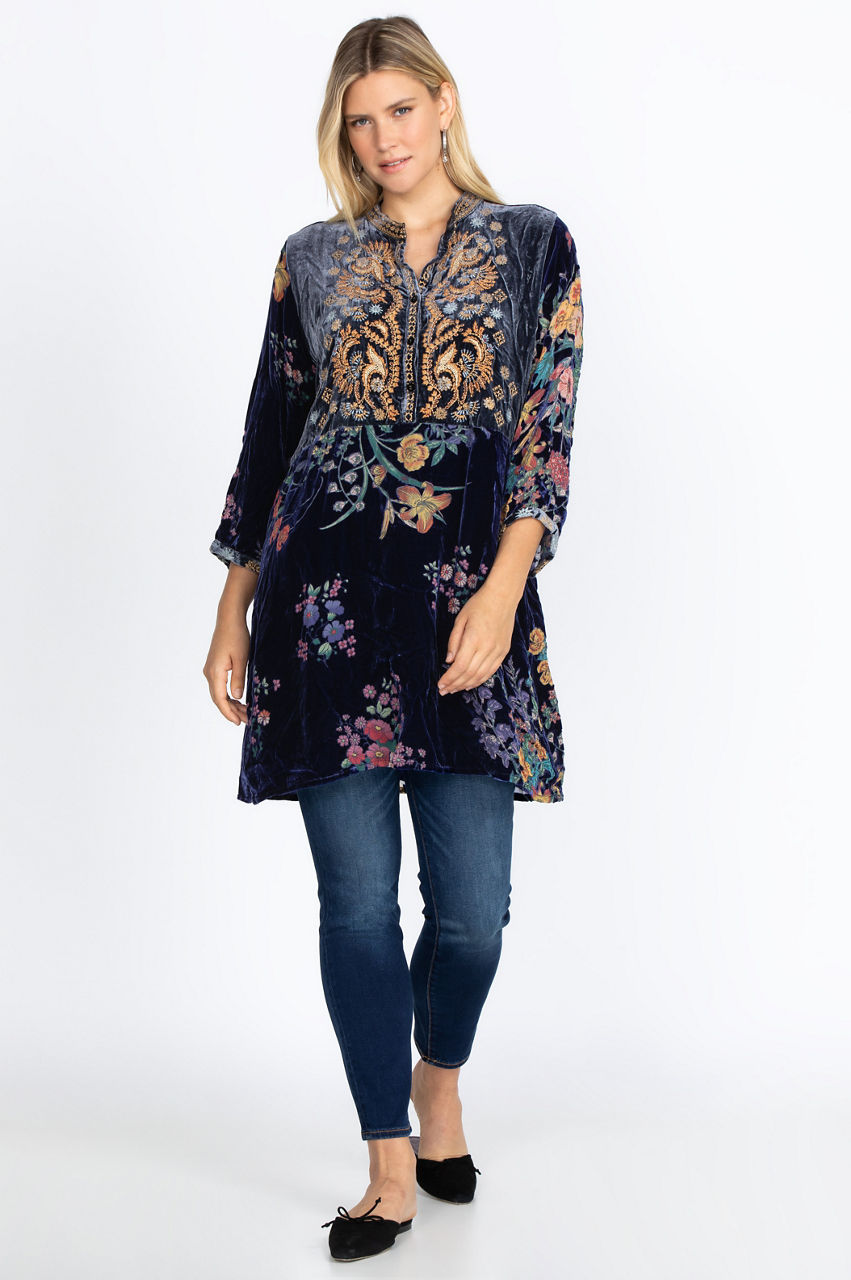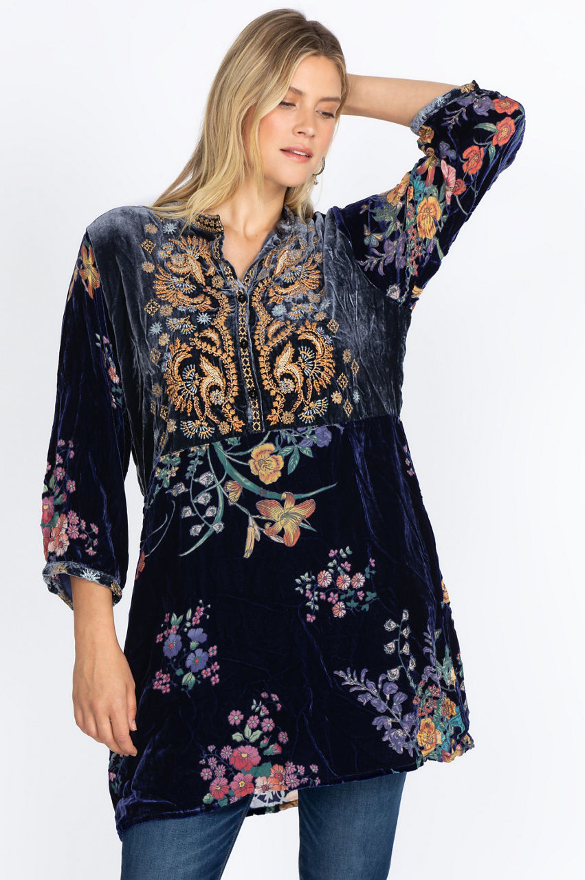 Spruce up your wardrobe with this chic artisan-inspired dress. The contrasting bodice and embellished front placket add structure to this stylish dress while the colorful floral motifs and embroidery details create a sophisticated look. Add some flow and elegance to your outfit by pairing this gorgeous dress with some nude heels and a floral handbag.
