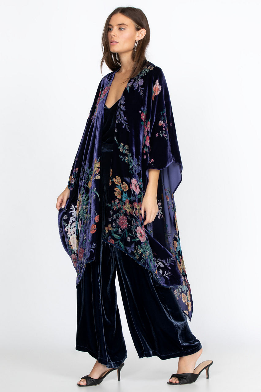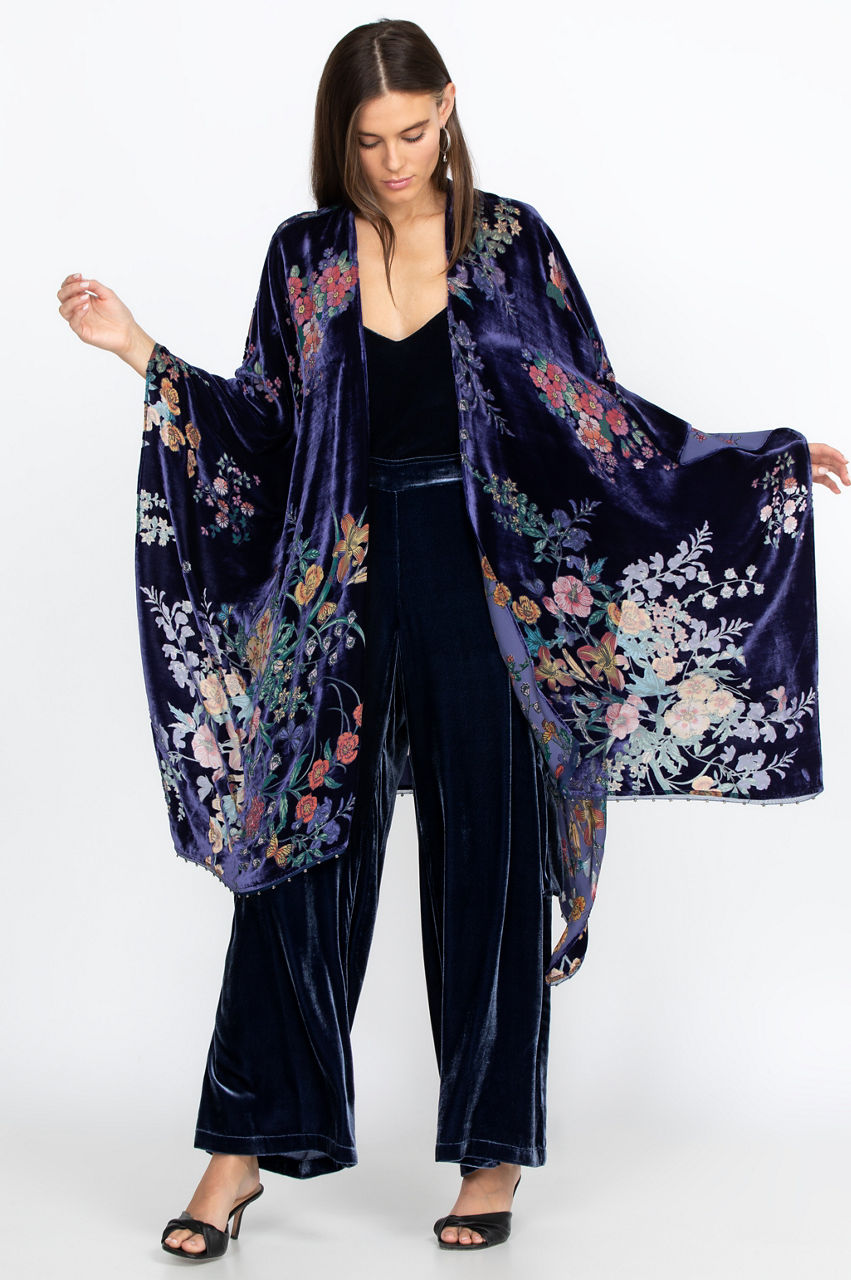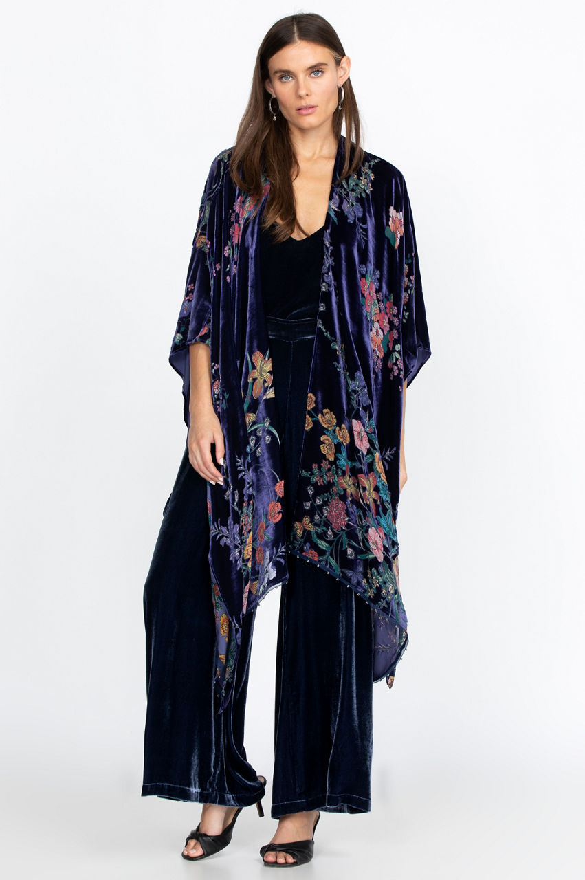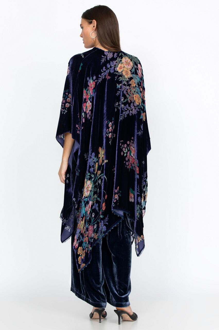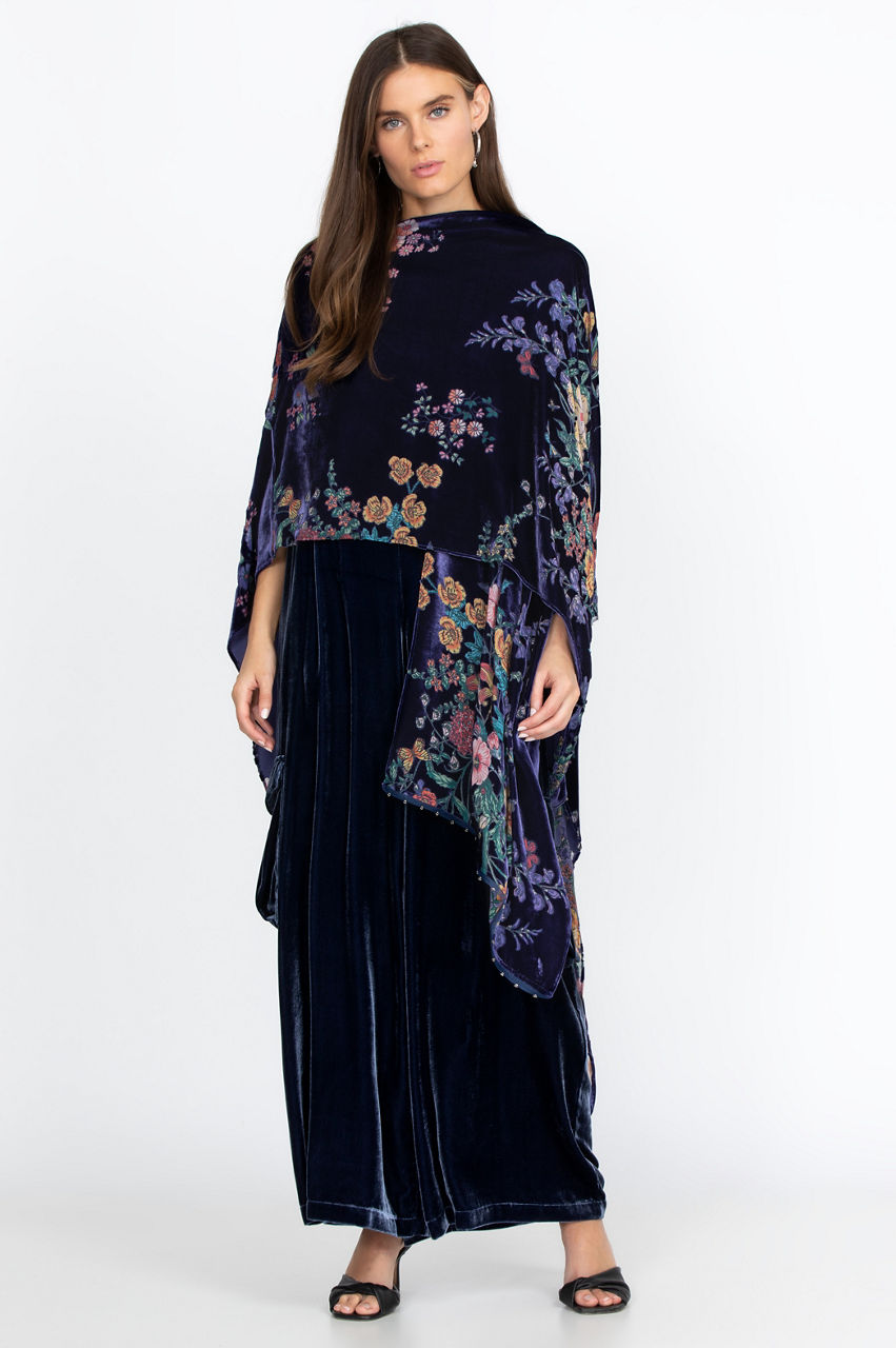 This stunning shawl will quickly become a favorite accessory for creating draped and layered effects. The rich color, vibrant floral motifs, and soft material make this shawl a must-have fashion accessory. Style this gorgeous shawl by draping it over an embroidered silk blouse. Complete the look with some floral leggings to create a pattern.
