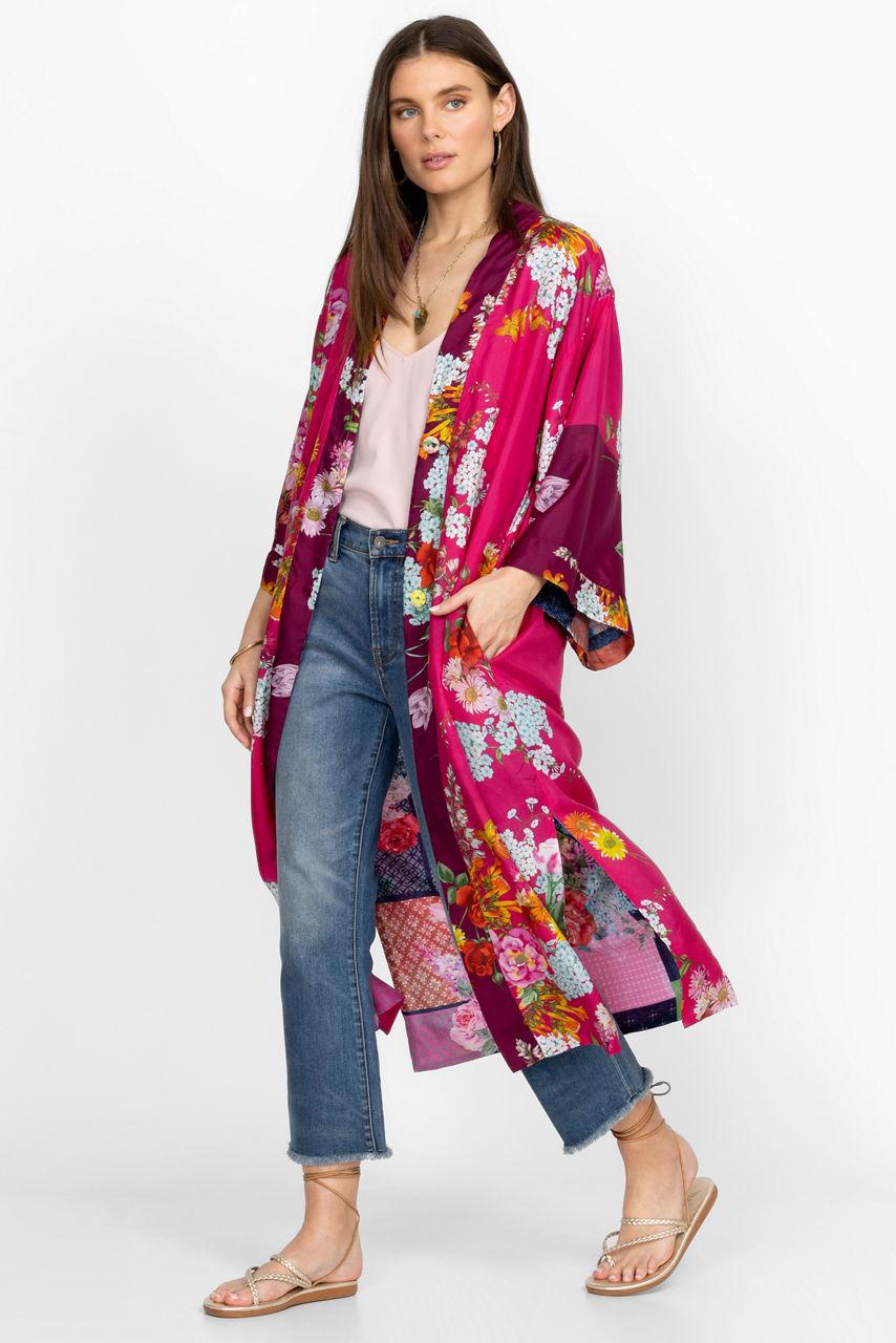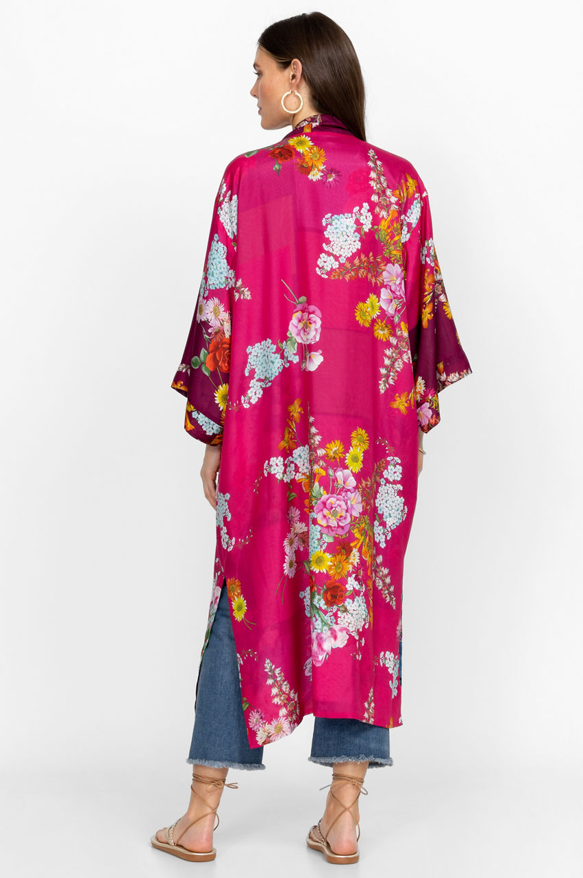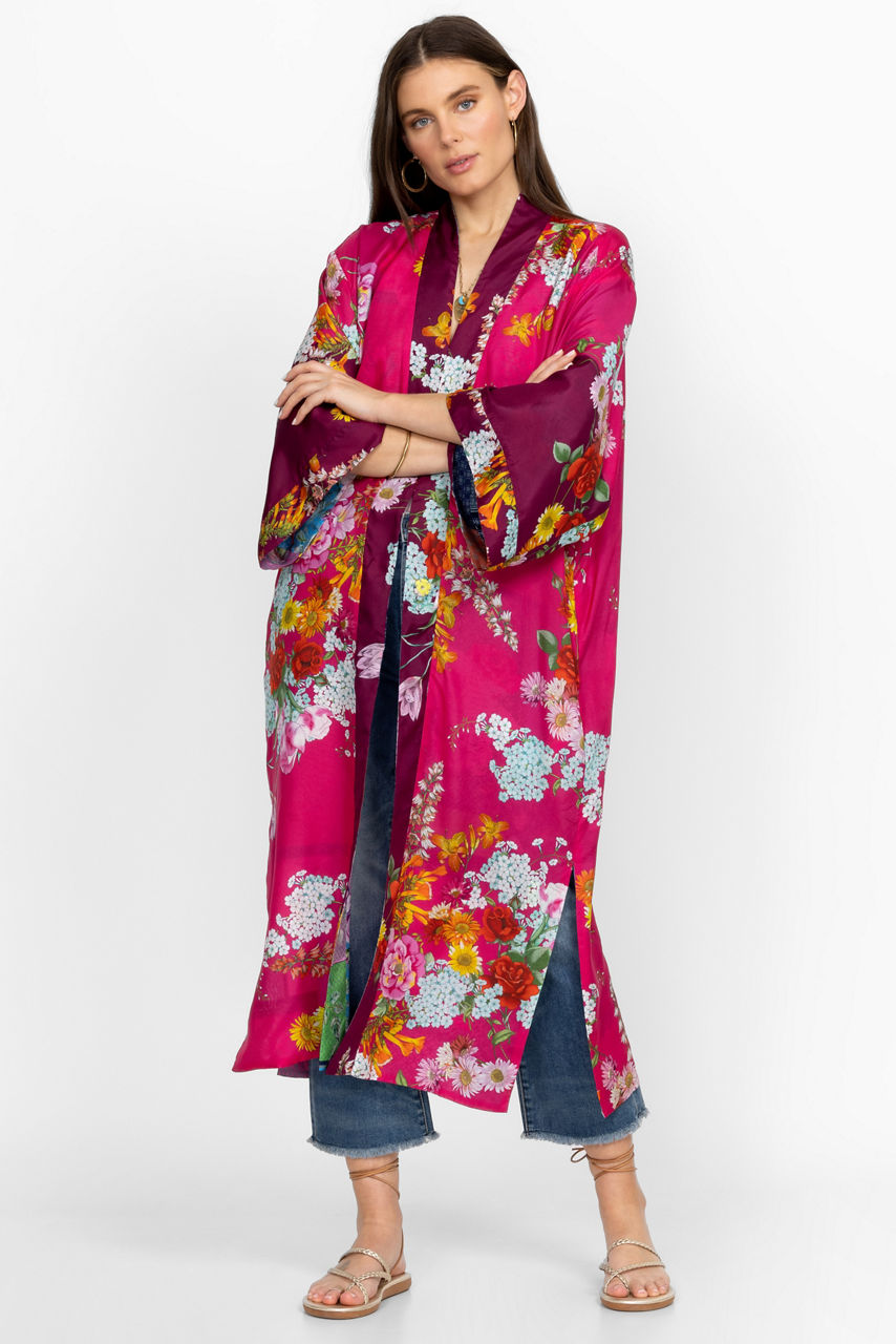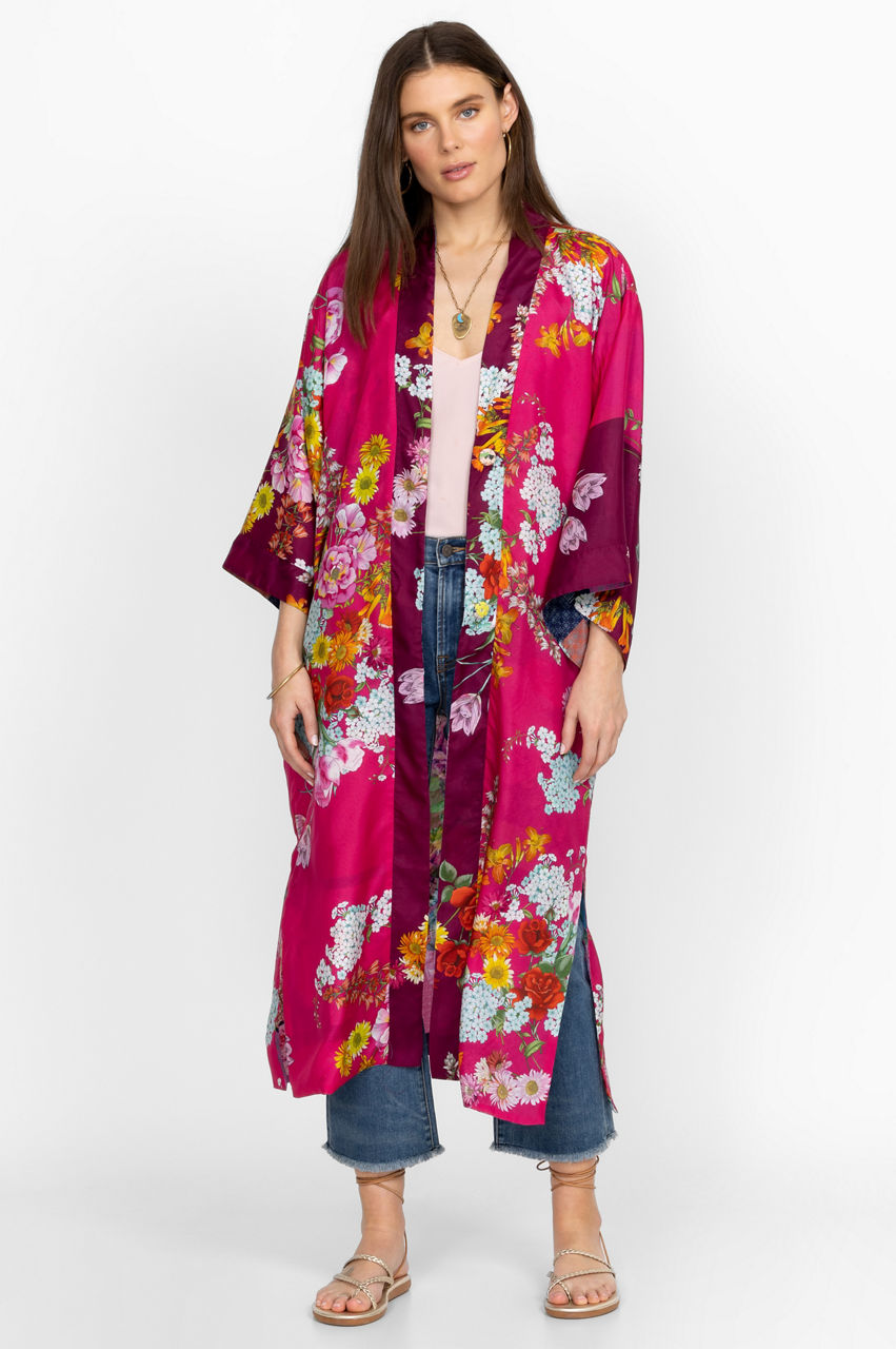 Spun from lustrous silk, the Bouquet Jules Kimono seamlessly balances timeless appeal with striking elegance. Falling to a maxi length, this eye-catching kimono features a floral printed reversible side, a front snap button closure, long sleeves, and a bountiful display of beautiful flowers in rich shades. Layer over a dress and pair with heels for an opulent take on evening dressing.