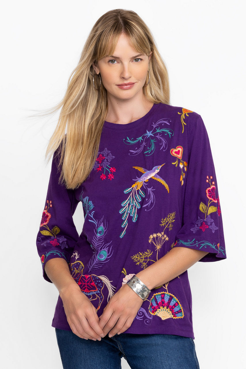 Crafted from 100% breathable cotton, the Ariela Boxy Knit Tee offers a fresh take on a traditional wardrobe staple. Featuring a classic crew neckline and 3/4 sleeves, this tee is finished with bold floral embroidery at the front and back. Pair with relaxed fit denim and colorful flats for a fresh weekend ensemble.